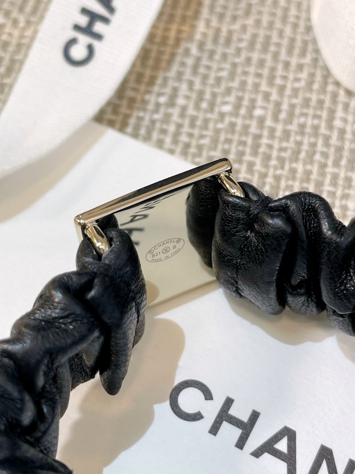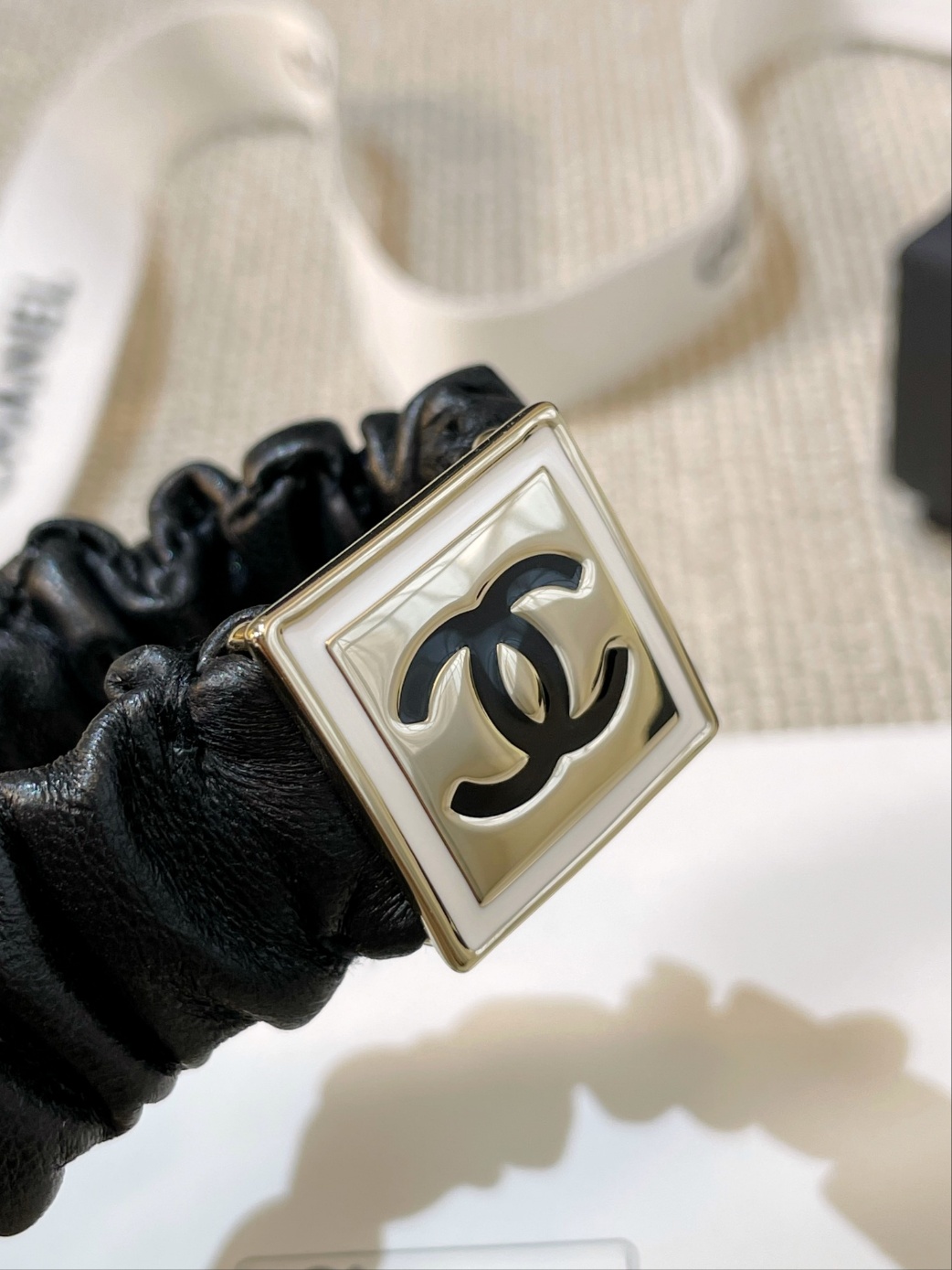 샤넬 스퀘어 헤어타이 ZP3200, 유일한 ZP 구매후 개발 일률적인 ZP 신주 소재로 특별히 제작된 ZP 일치 양가죽 소재 사각 너비 약 2CM 가죽부분은 신축성있는 질감으로 포니테일을 두바퀴 정도 묶어주시면 됨