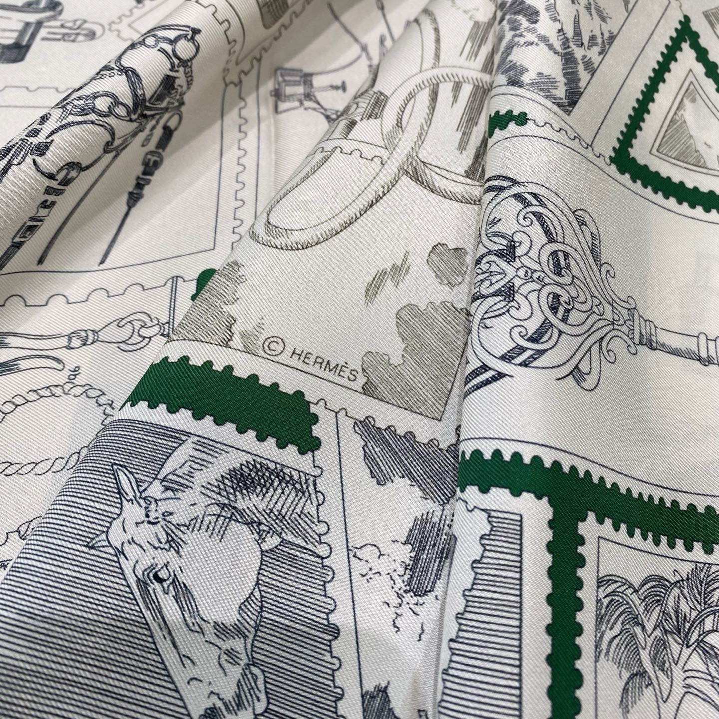 에르메스 우표 수집가 90방 스카프 한 통의 편지 봉투와 엽서에는 정교한 도장이 찍혀 있으며 옥타브 마르살(Octave Marsal)의 섬세한 연필 터치 아래 예전의 번영과 영광을 재현하고 있음 이 콜라주 그림은 에르메스의 이야기와 그가 불러일으키는 무한한 꿈을 담고 있음 승마 장면이든, 아름다운 풍경과 악기든 각 화면에는 우표 수집 애호가들의 잊을 수 없는 여정이 기록되어 있음 소재: 100% 실크 size: 90×90cm