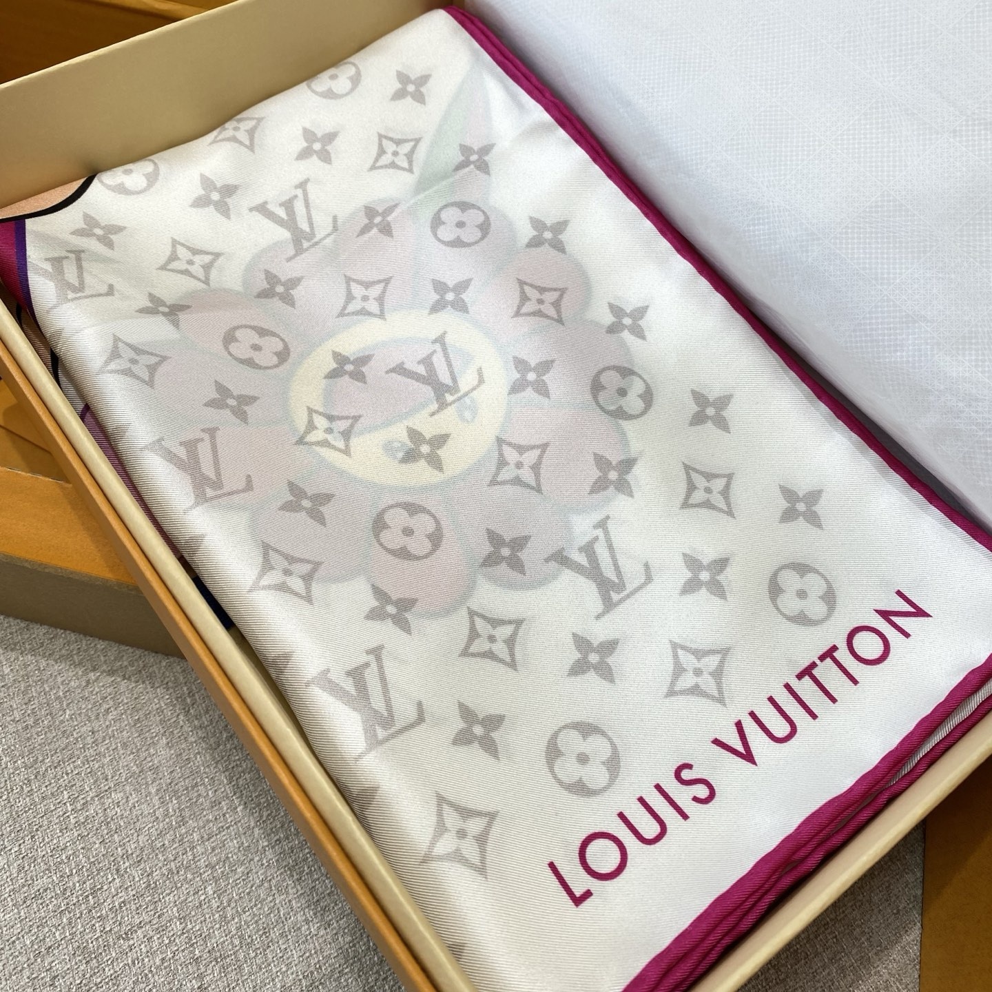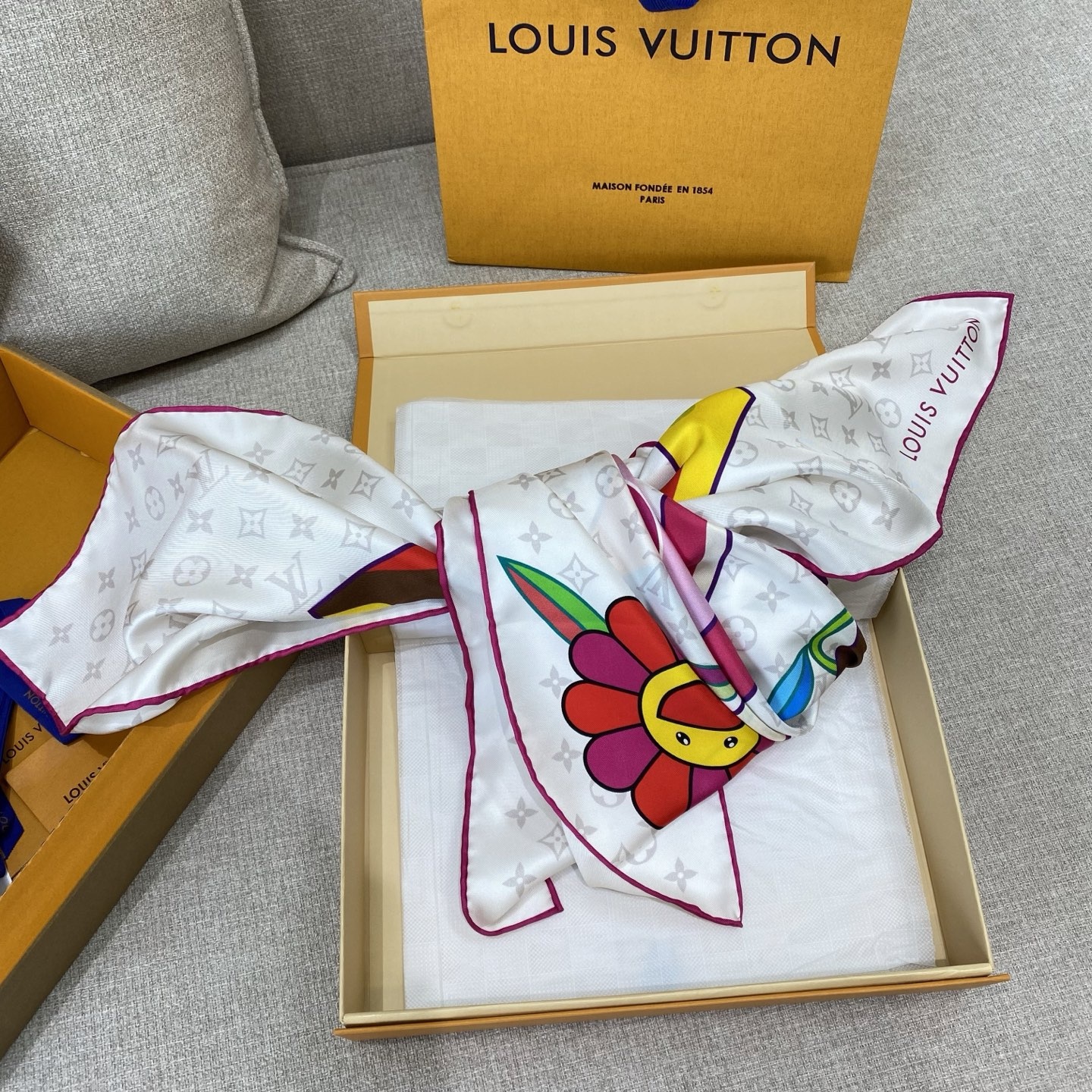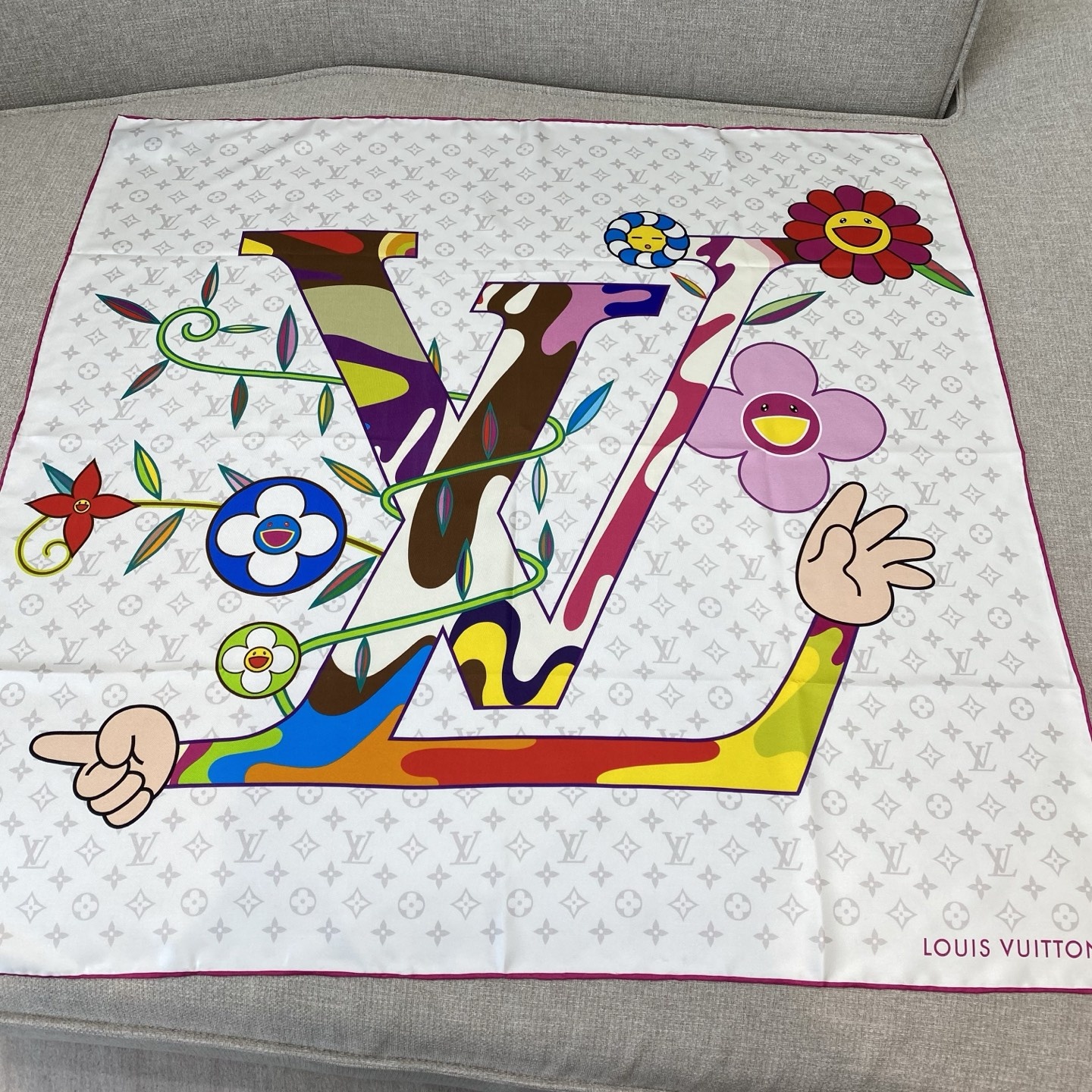 루이비통 X 무라카미다카시 SUPERFLAT 90 스카프 LV xTM Monogram Superflat 뽕나무 실크 스카프 무라카미 타카시와의 콜라보레이션 라인 큰 사이즈의 I Hands 로고 미소의 꽃과 브랜드 요소가 창의적으로 어우러져 아티스트의 아이덴티티를 나타내는 초플랫 스타일을 선보임 소재: 100% 실크 size: 90×90cm