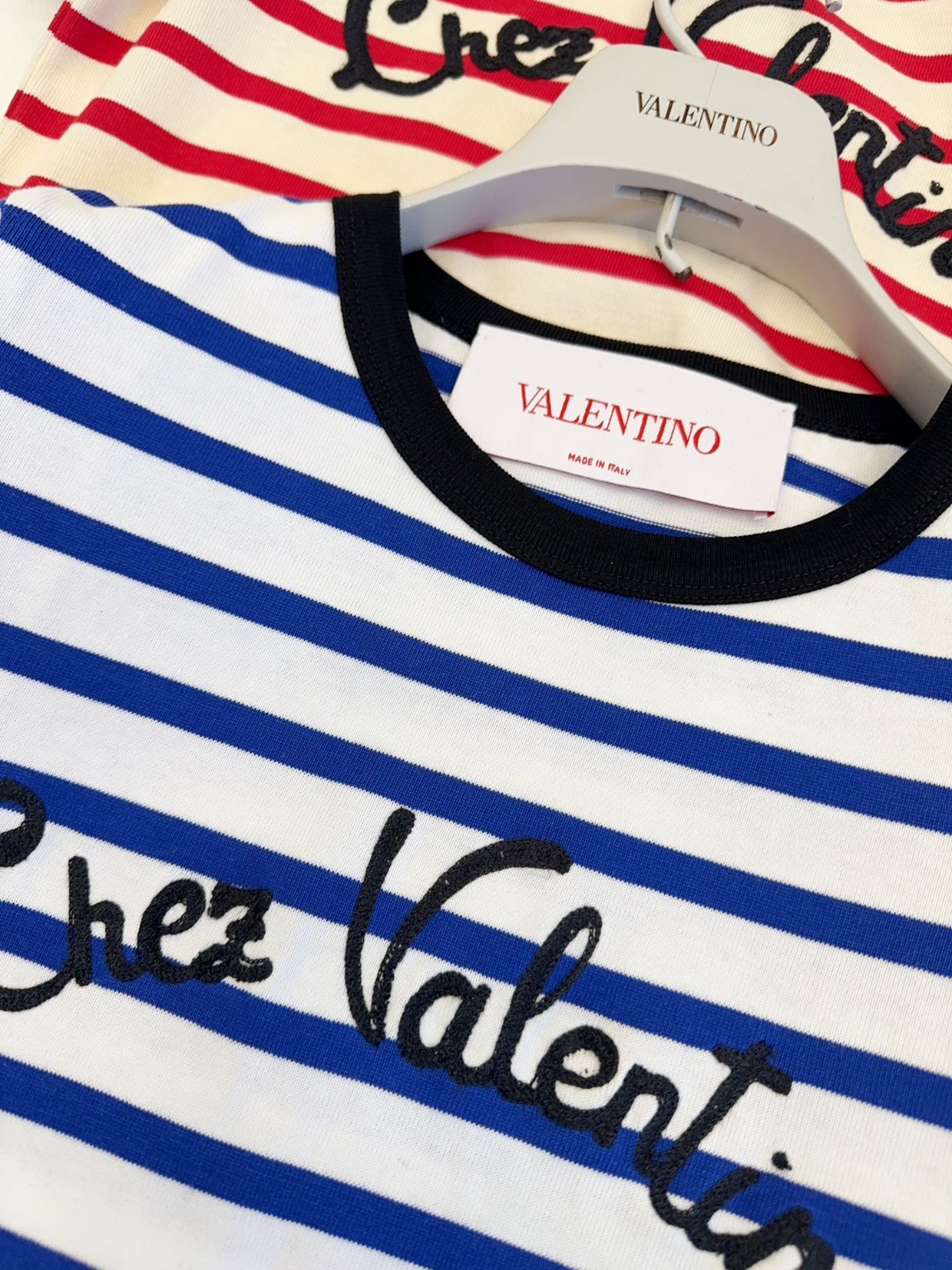 발렌티노 2025 신상 스트라이프 티셔츠 편안하고 통기성 있는 순면 소재 가슴 레터링 로고 자수 장식으로 브랜드 아이덴티티를 살림 전체적으로 스트라이프 컬러의 간격을 두고 테일러드 컷팅 체크 프린트, 스트라이프 계열의 컬러가 클래식하게 매치