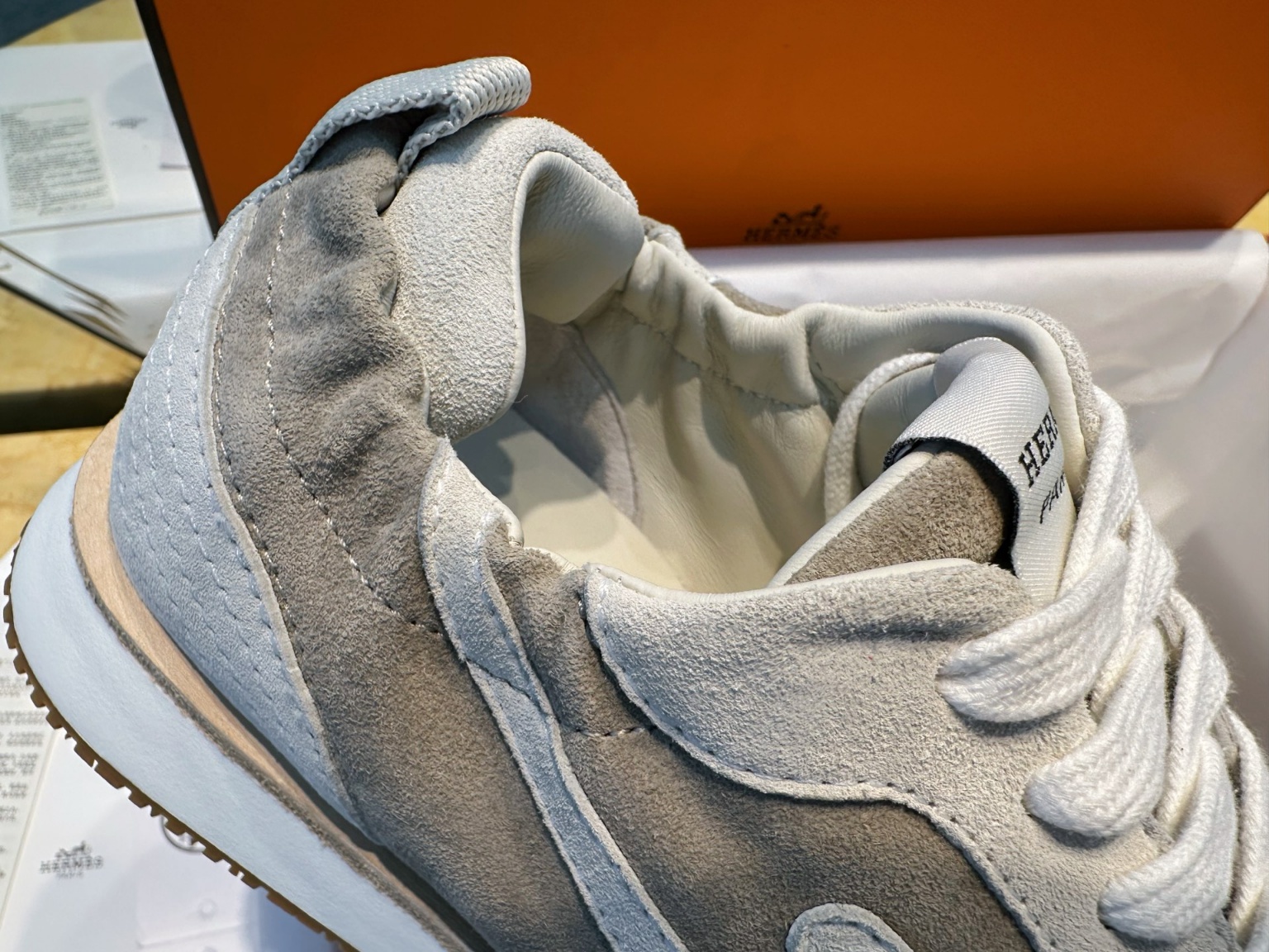 에르메스 제트 스니커즈 베이지 컬러 콤비 스웨이드 염소가죽 파스텔 로고 H 디테일, 허니컬러의 요철 H무늬 아웃솔 굽 스판 스트랩에 뒤축으로 마모를 방지하는 백 디자인으로 부귀한 존재감을 쉽게 드러내는 느슨한 머니 무드
