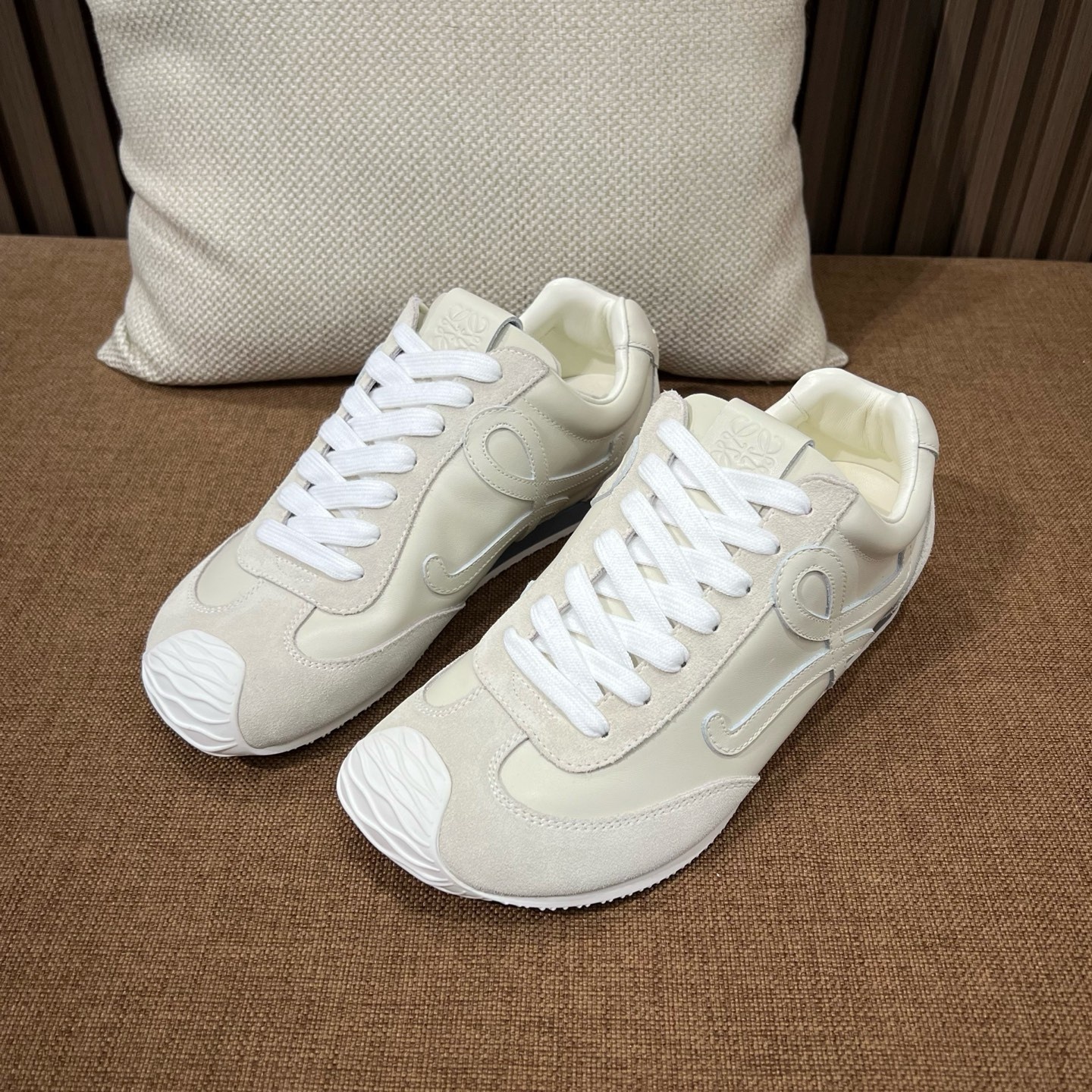 로에베 2025 신상 발레 러너 스니커즈, zp급 약간 빈티지한 질감, 스웨이드와 나일론 천으로 질감이 좋음 맞춤형 TPU 밑창으로 편안하고 패키징이 강함 심플하고 모던하게 잘 표현되어 우아함을 잃지 않음
