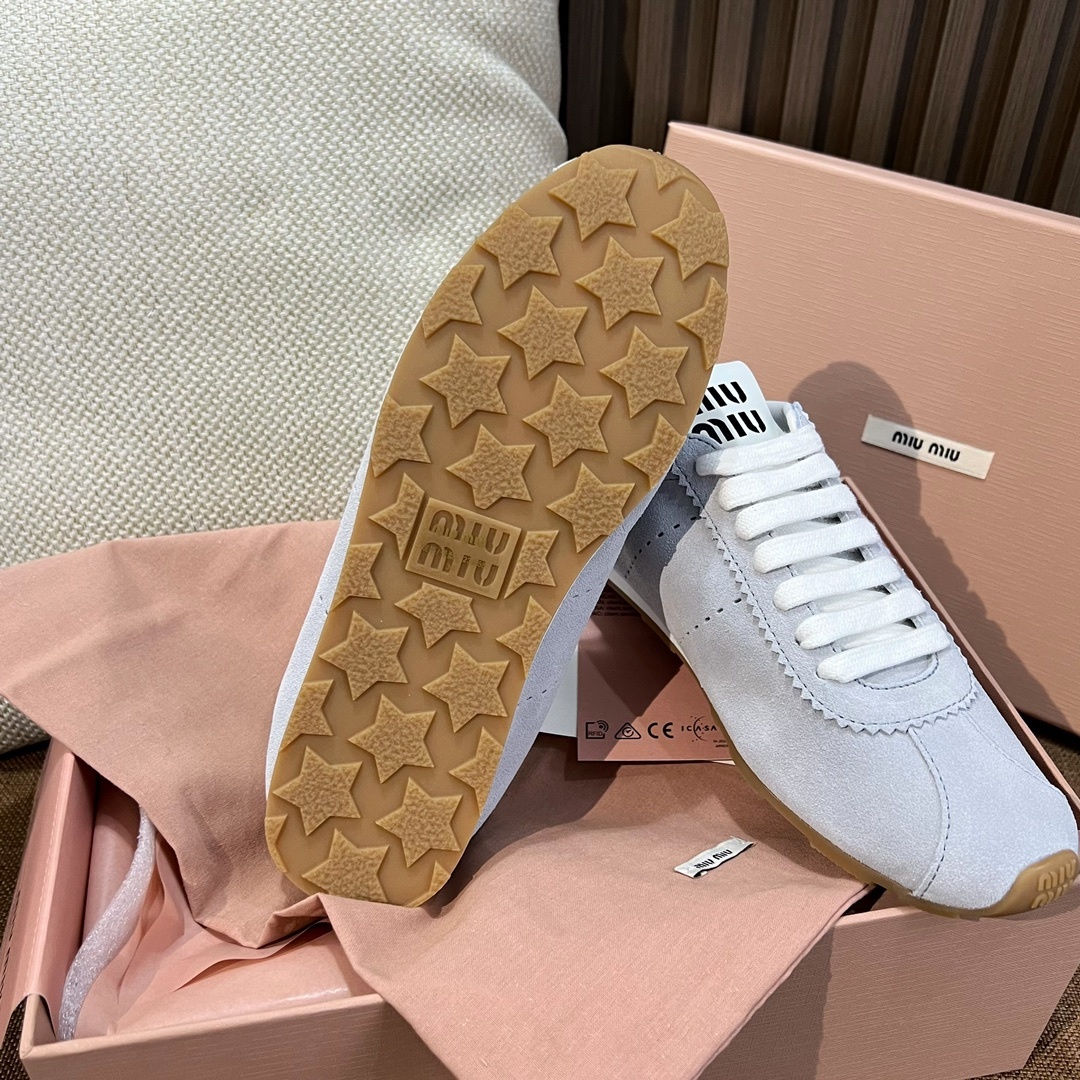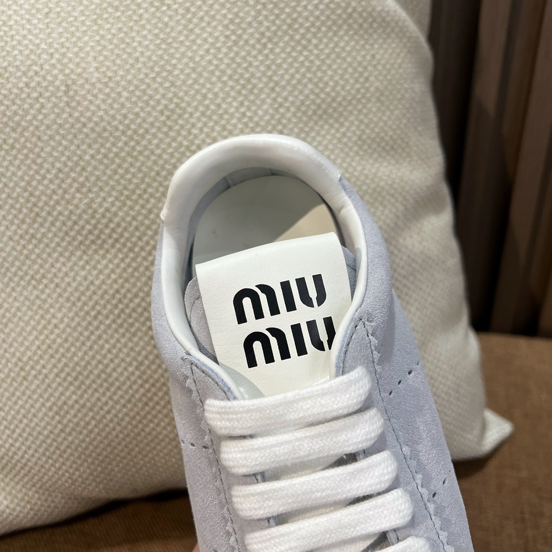 미우미우 봄여름 런웨이룩 빈티지 스니커즈 원단은 주문 제작 수입 소가죽으로 실켓감이 우수함 맞춤 안개꽃 머리 겹겹이 양가죽 안감 매트한 송아지 가죽 콤비네이션 TPU 내마모성 파운데이션 심플하고 모던한 디자인의 신발로 가볍고 잘 어울림
