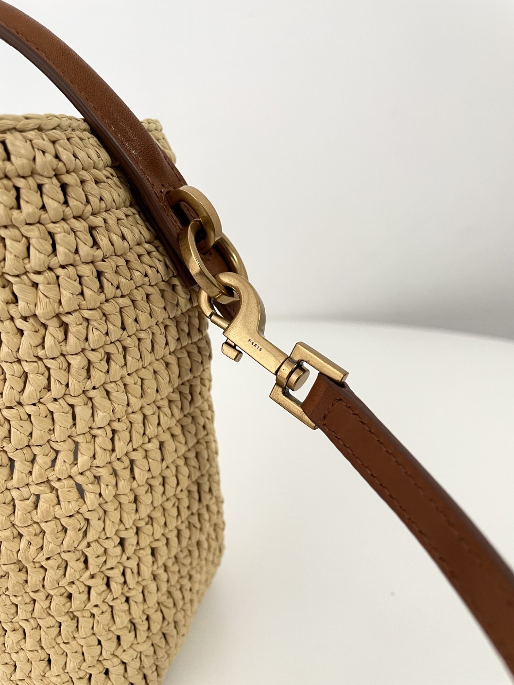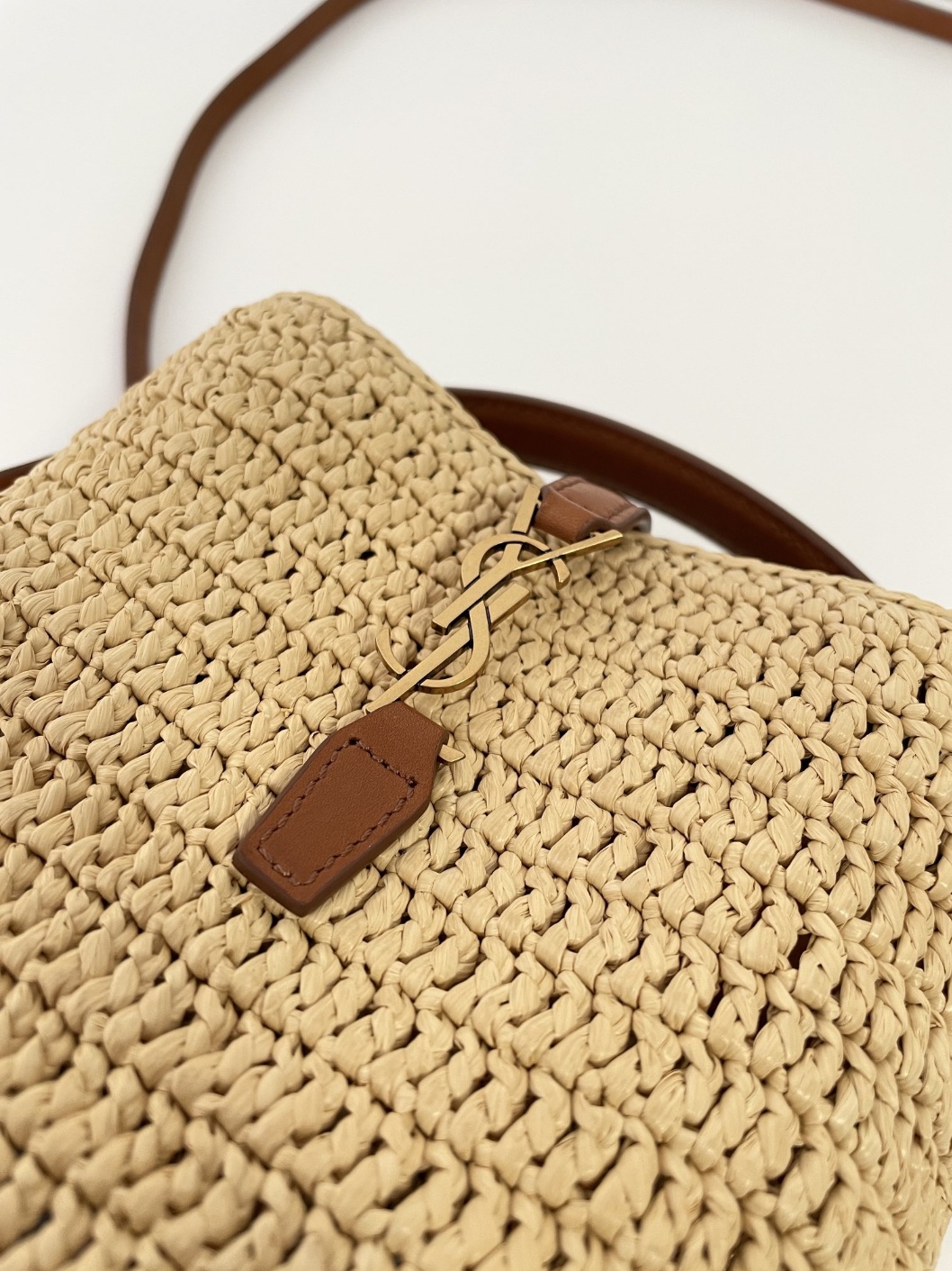 생로랑 LE37 짜임 라피아 미니 버킷백 라피아는 버킷백을 만나면 완벽한 조합 ysl 2024 위빙 밀짚 버킷백 라피아와 베지터블 가죽 패치 LE CASSANDRE 후크 여밈, 탈부착 가능한 스트랩 조절 여름 바캉스 여행 필수 패션아이들 필수 아이템 모델번호: 765870 사이즈: 15x13x6cm