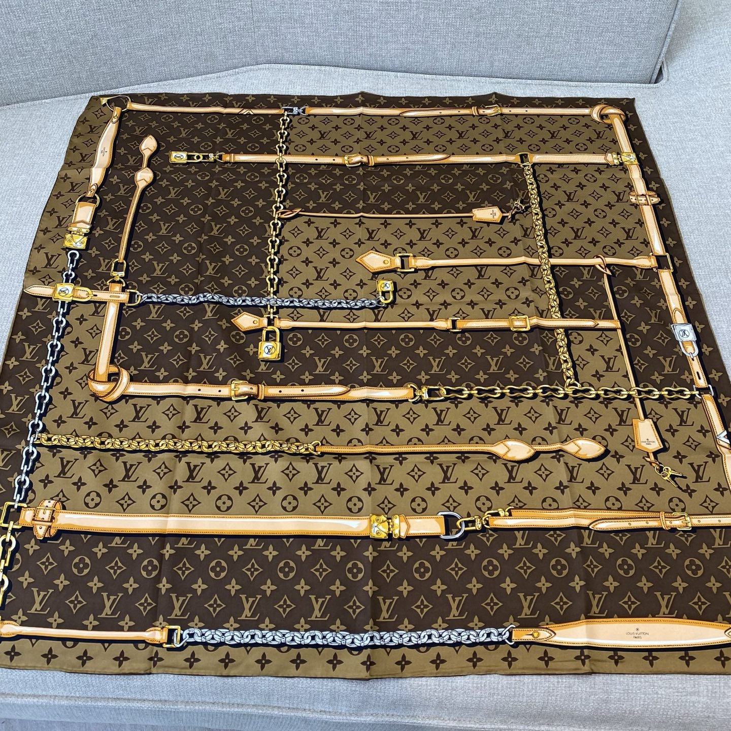 루이비통 MONOGRAM CONFIDENTIAL M78666 얼티밋 버젼 브라운 마켓 유니크 플러스 모노그램 무늬를 배경으로 한 루이비통의 상징적인 디자인 요소인 가죽 스트랩, 메탈 체인, 잠금장치로 선물하기에 이상적인 실크 스카프 100% 실크 트윌 핸드메이드 롤업 장식 SIZE: 90x90cm