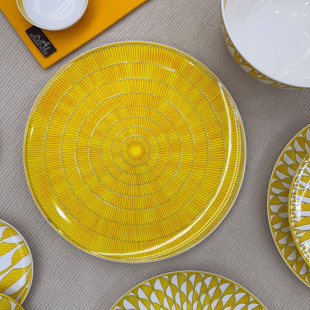 솔레일 드 에르메스 41PCS 식기세트 햇빛에 비친 황금빛 햇살처럼 빛나는 도자기 백자로 풍부하게 표현된 짙은 노란색 섬세한 블랙 컬러가 한줄기 그림자처럼 디자인된 야자잎 등 문양을 그려내 브랜드의 아이덴티티를 살림