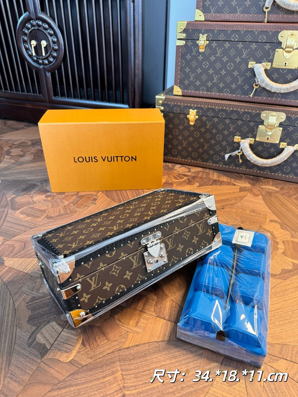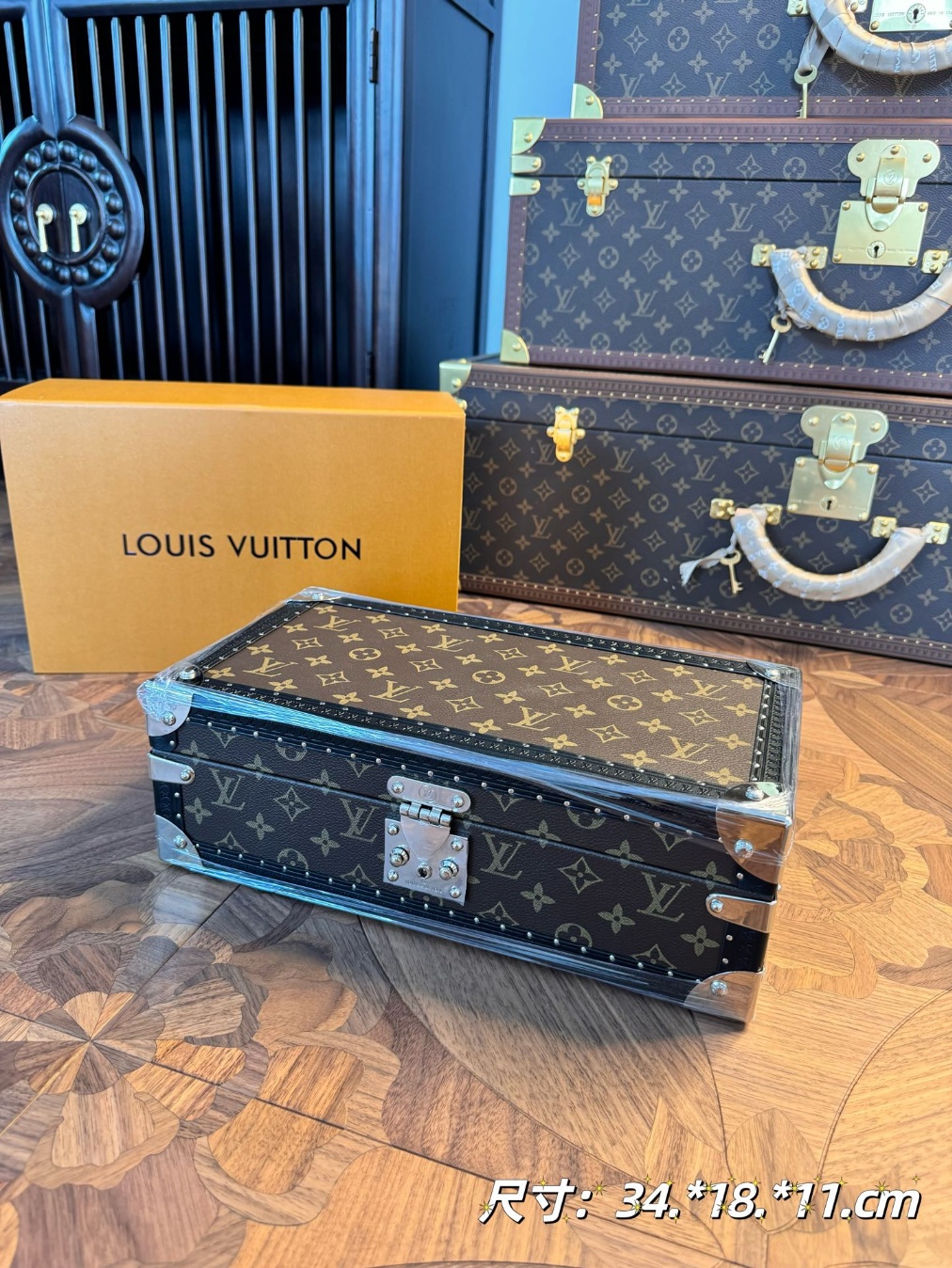 루이비통 8개입 시계 케이스 고전적인 모노그램 캔버스로 만들어진 8중 케이스 귀중품 은닉을 위한 탈부착이 가능함 파우치 8개 내장, 손목시계 8개 포함 가운데 칸막이 귀중품 보관 가능 자동 바운스 잠금 해제 안감에 벨벳을 매치함 실버메탈/오금V 솜씨가 절정에 달하여, 하나하나의 세부 사항이 꼭 알맞음 핸드메이드로 군데군데 박힌 Long이 또렷하게 루이비통 하드케이스 마치 역사를 가로지르는 보물상자 그 견고함은 루이비통 전통의 세련된 공예의 상징 사이즈 34.0x18.0x11.0cm (가로*세로*높이)