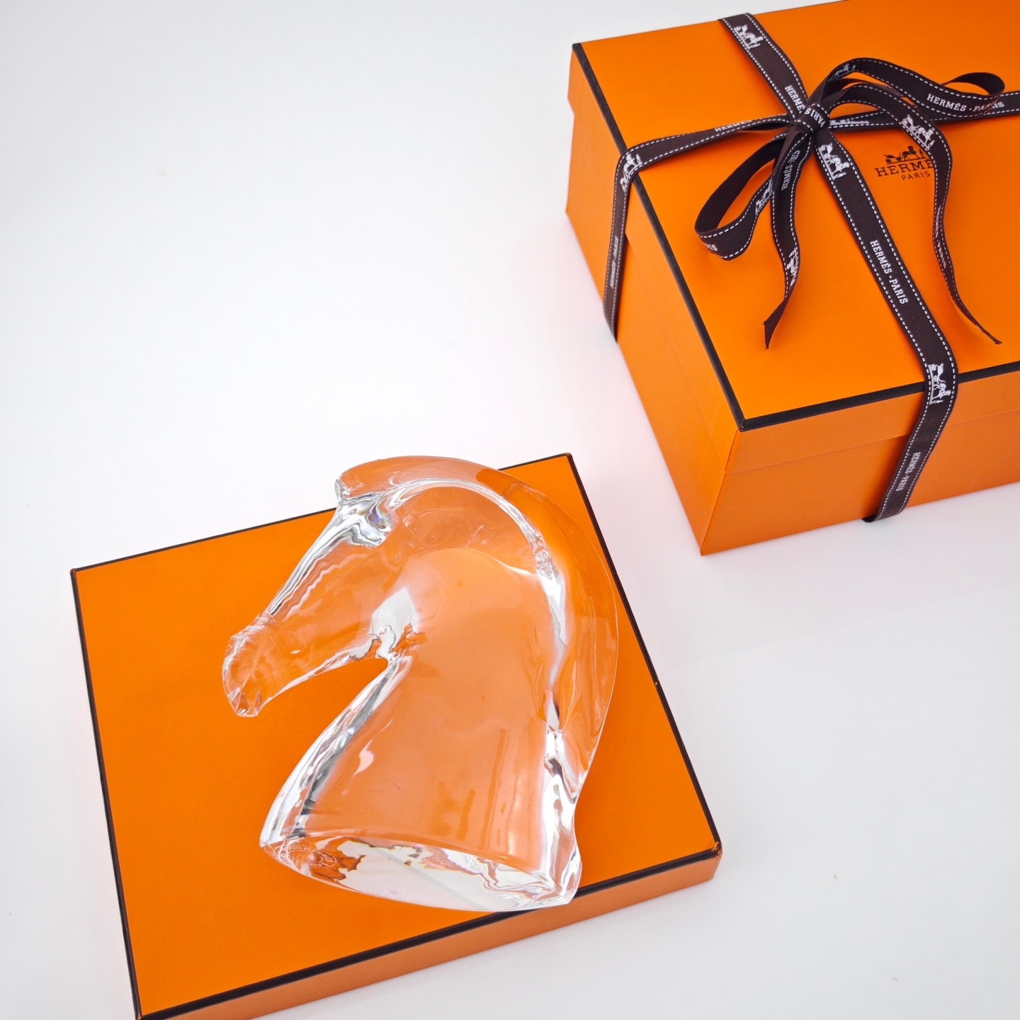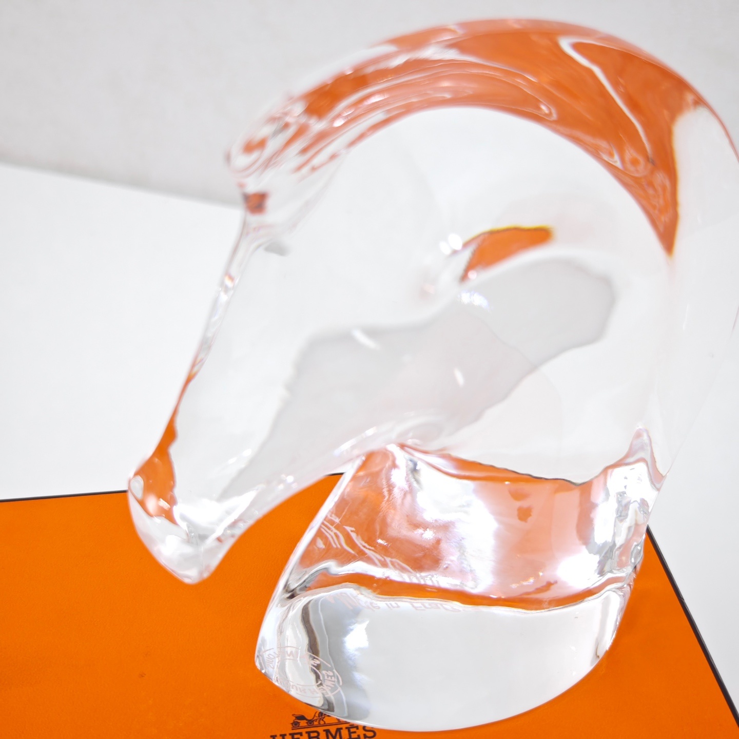 에르메스 사마르칸트 문진 장식 장식품 전체는 일체형 크리스털로 제작되어 제작과정에서 한치의 실수도 용납되지 않음 매우 정교하게 조각되어 독특하고 질감과 무게감이 있으며 하나하나의 디테일이 살아 숨쉬는 듯함 말머리 스타일링에 투명한 크리스털을 매치하여 조명이나 햇빛에 투명하게 비쳐주는 섬세하고 위트있는 연출이 가능 바닥 부분 레이저 조각 로고 사이즈: 높이 16cm 폭 13.5cm 밑면 10cm