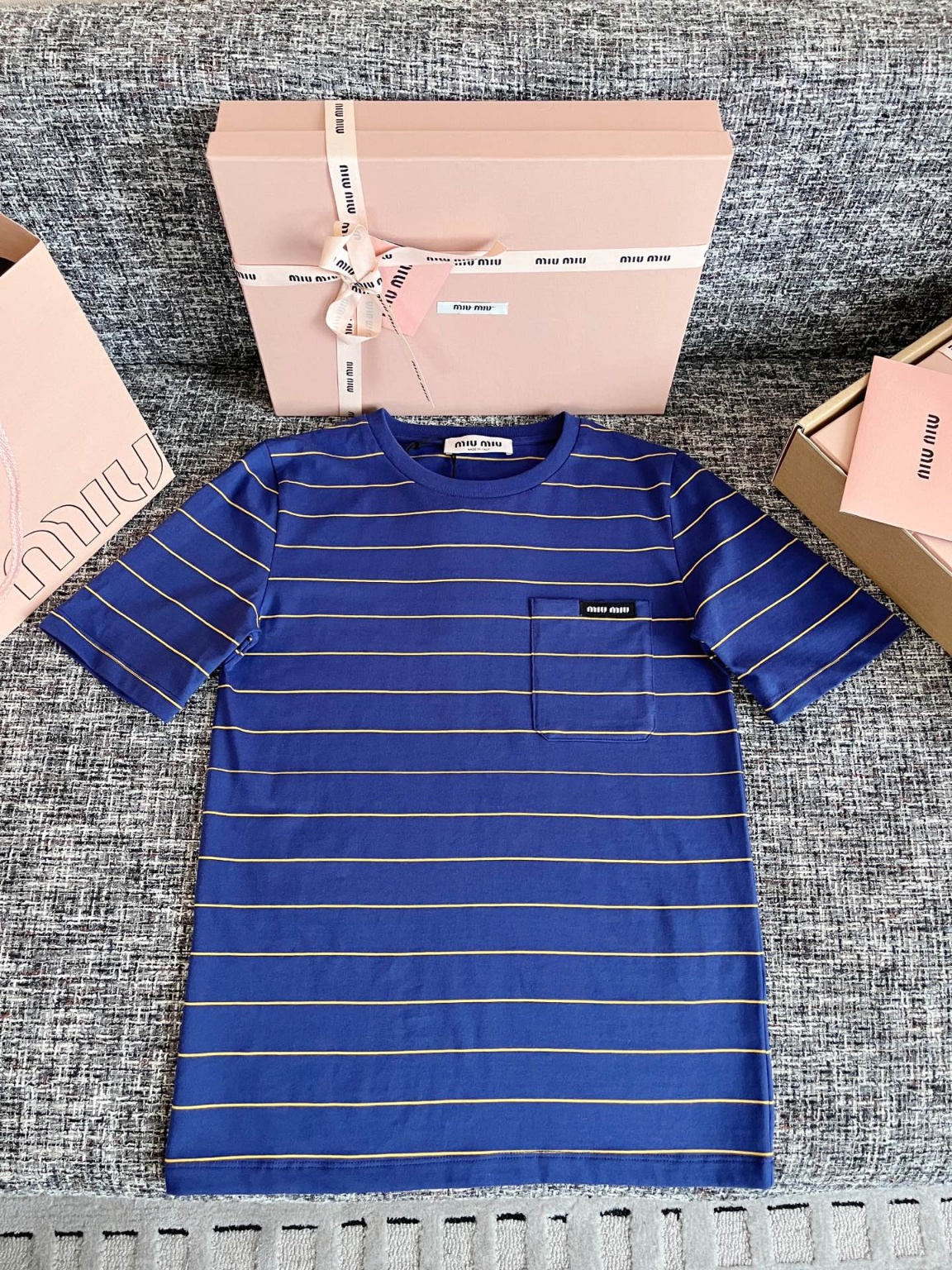 미우미우 25 이른봄 스트라이프 반팔티셔츠 ZP 7350 구매 분해 제작 페루 ROW 면 주문 제작 실제 100% 오리지널 재료와 출고 공정 확대 시 디테일 98 이상 제작 가능 실제 1:1 환원