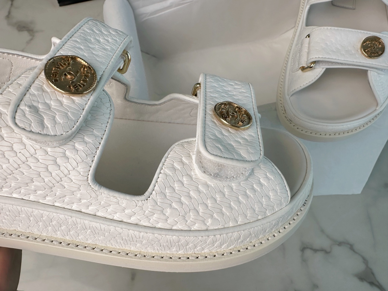 샤넬 화이트 엠보싱 골드 비치 샌들 몰드무늬 엠보 수입 소가죽으로 몰드 통째로 과금해야 이쁜 결을 억누를 수 있고 안감 양가죽은 부드럽고 통풍이 잘되며 눈에 보이는 질감 빈티지 금화버클이 오리지널로 제작되어 조금도 틀리지 않고 유니크하며 화이트컬러 여름에도 산뜻하게 잘 어울려서 좋음