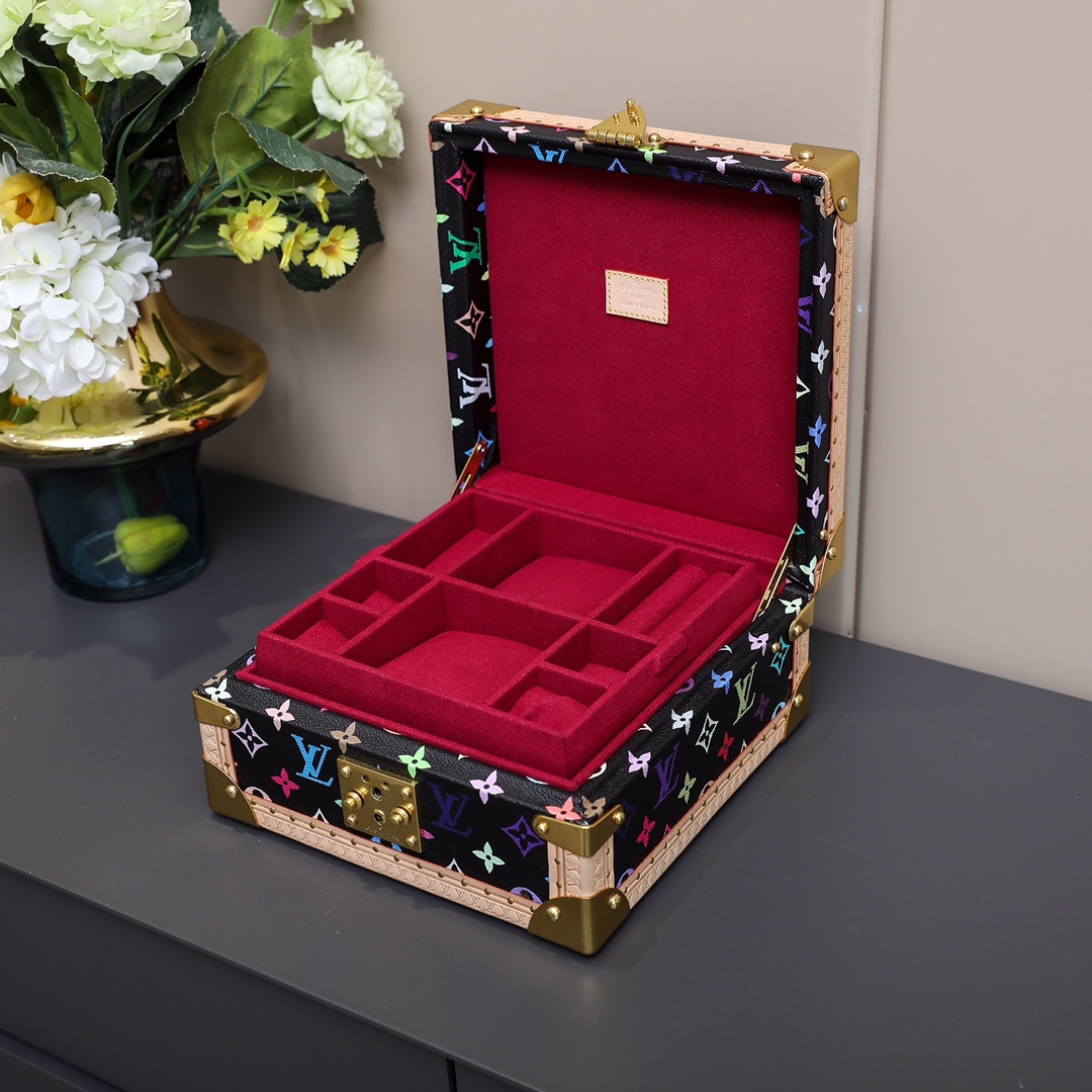 루이비통 주얼리 케이스 반지, 목걸이, 팔찌, 귀걸이, 팔찌를 레이어드하여 보관할 수 있음 실용적이며 안전하고 믿을 수 있어 여행하기에 좋은 동반자 사이즈 23.0*23.0*11.0cm (가로 * 세로 * 높이) 4개의 스퀘어 파티션으로 귀걸이 수납 가능 중앙에 스퀘어 2칸으로 큰 귀걸이 또는 팔찌/팔찌 수납 가능 2개의 긴 직사각형 파티션으로 가늘고 큰 반지 및 목걸이를 수납가능 사이드 파티션 2개로 팔찌 및 팔찌 수납 가능 중앙 칸막이 1개로 목걸이 수납 가능 스터드 장식, S자형 잠금장치 자동 바운스 잠금 해제, 벨벳 안감 수작업으로 제작되어 곳곳에 Long이 선명하게 박혀있음
