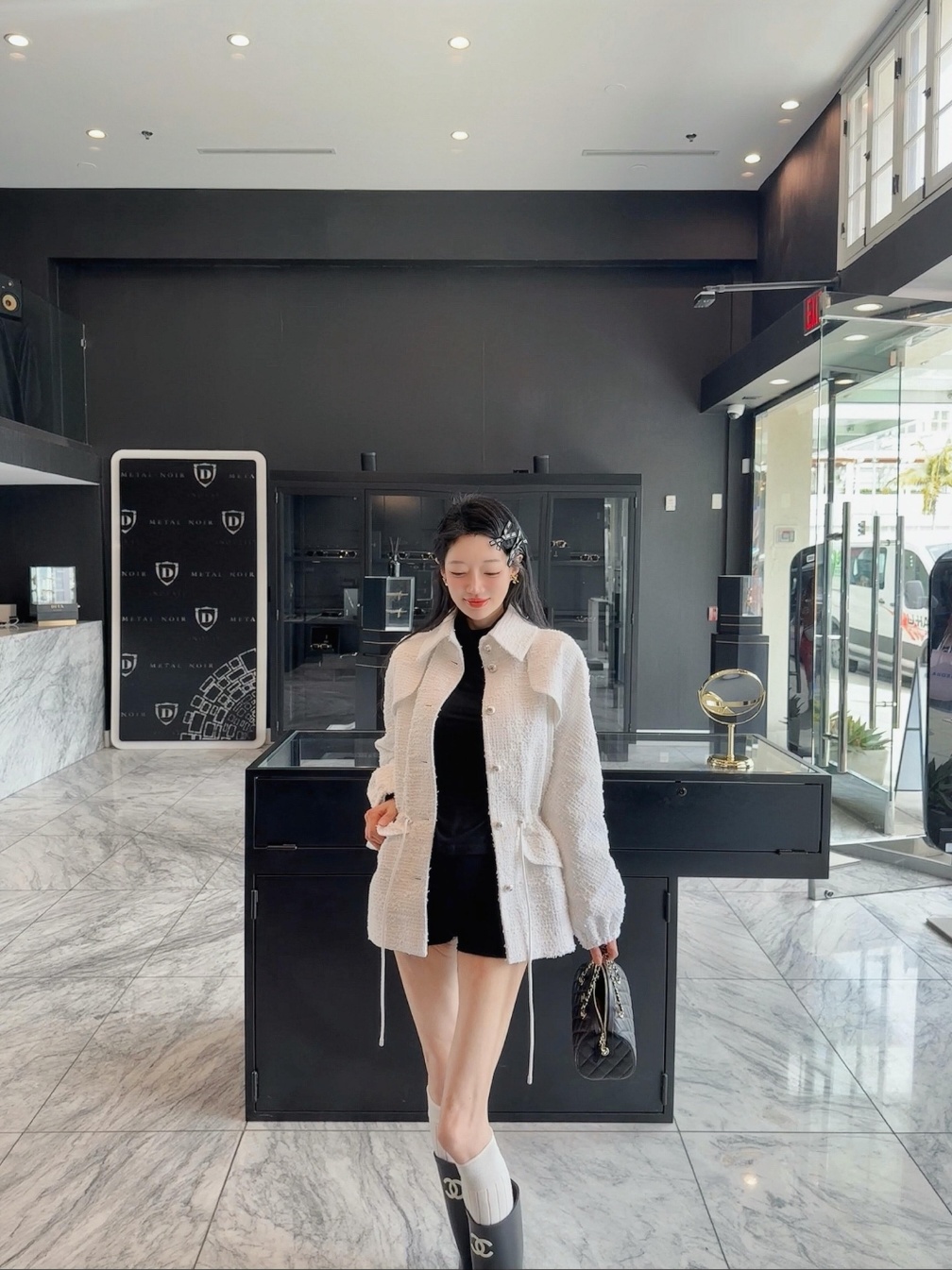 샤넬 25 봄여름 신상 화이트 진주 버튼 스트링 코트 수입 슬럽 울 소재 육안으로 보이는 텍스쳐에 트위드 스트라이프 모직 원단 스타일리쉬한 더블 C 진주 각인 버튼 솜털 짜임으로 고급스러우면서도 아담한 대칭 숄에 플랩포켓 디자인과 감미로운 멋스러움을 더했으며 수정 라인이 돋보이는 스타일리쉬한 레이어감의 패션 아이템