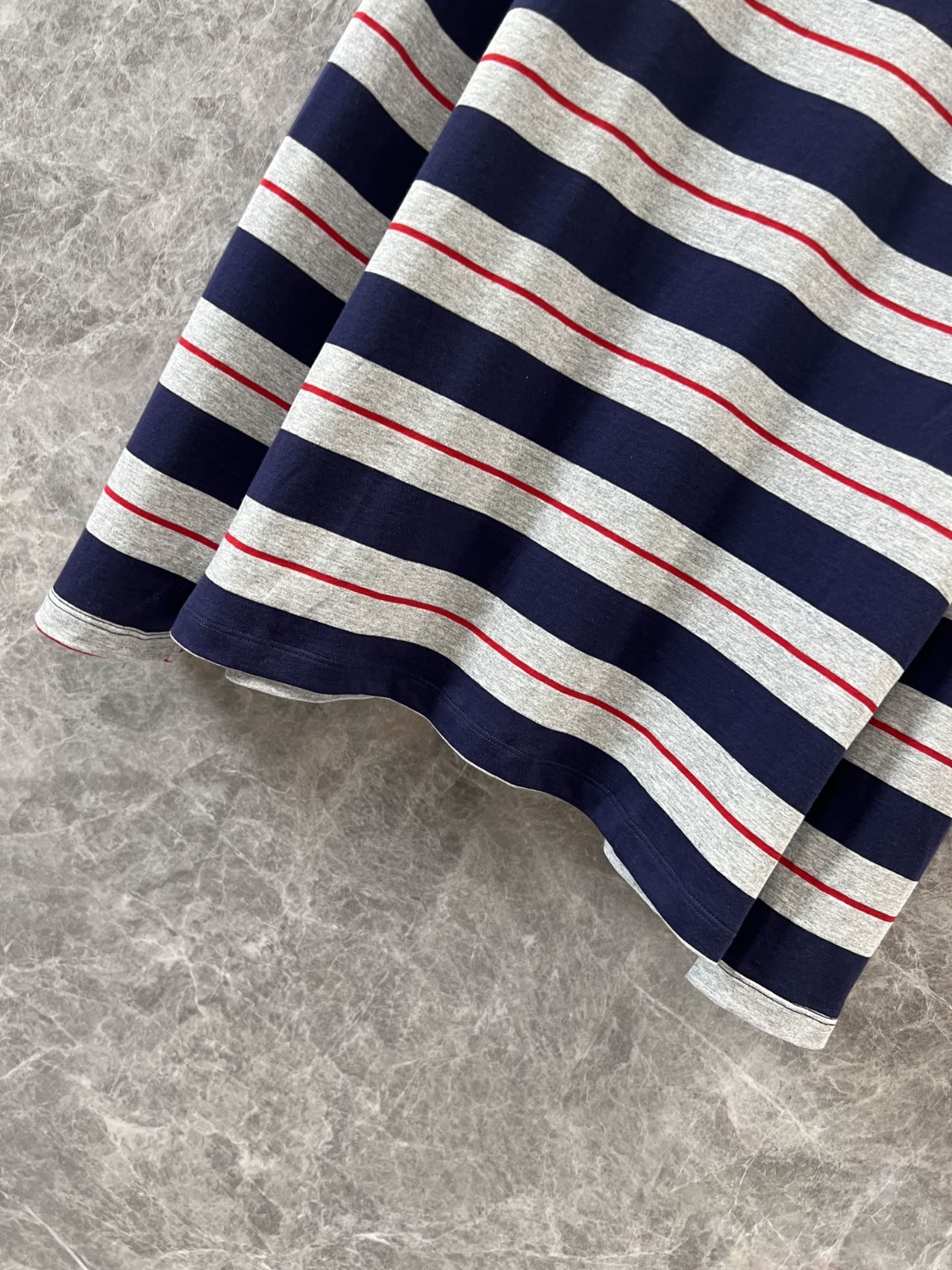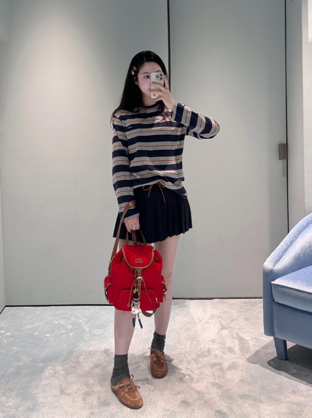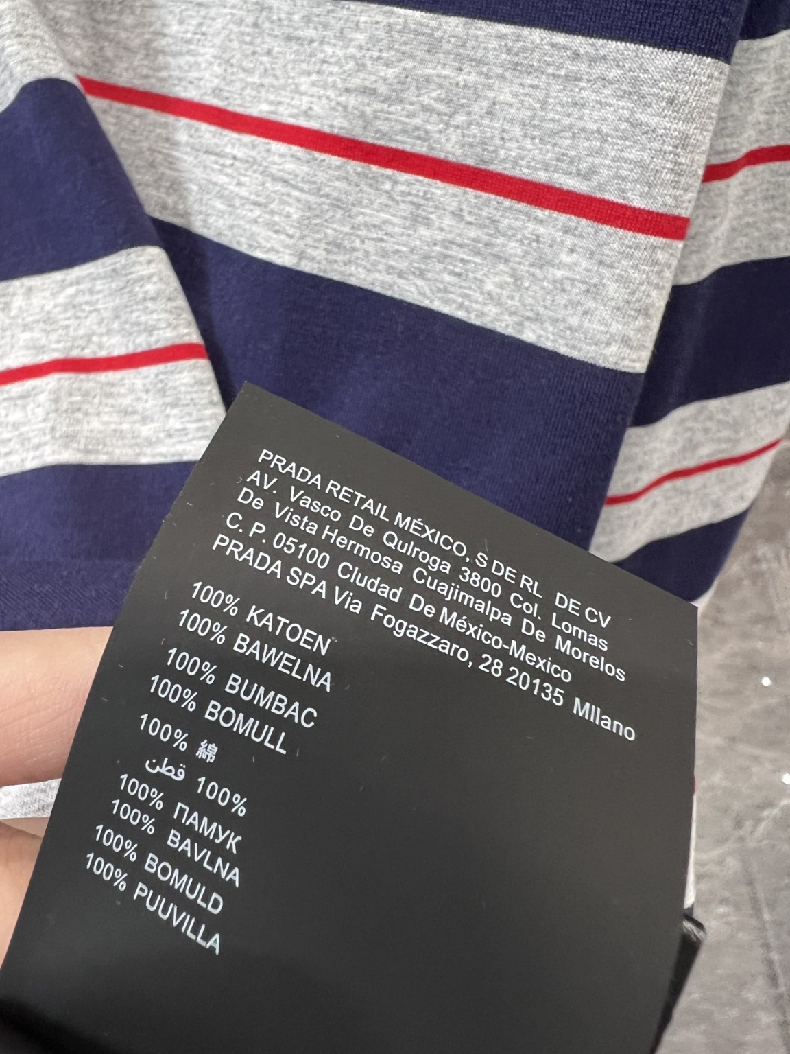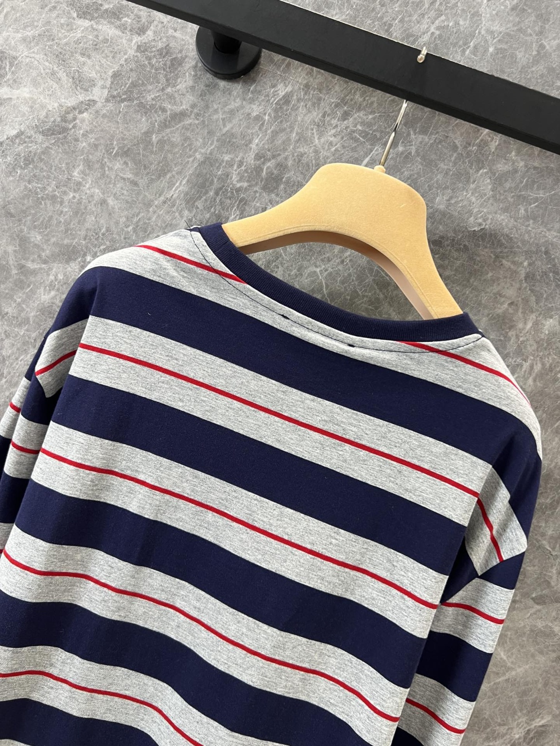 미우미우 25 봄여름 신상 마이크로 로고 스트라이프 긴팔 티셔츠 면소재 통기성 편안한 질감 루즈핏 컷팅 캐주얼하고 나른한 룩을 연출 이너 하나로도 멋스러우며 가슴 포켓에 프린지 포인트 로고 사계절 스타일리쉬하게 코디하기 좋은 아이템