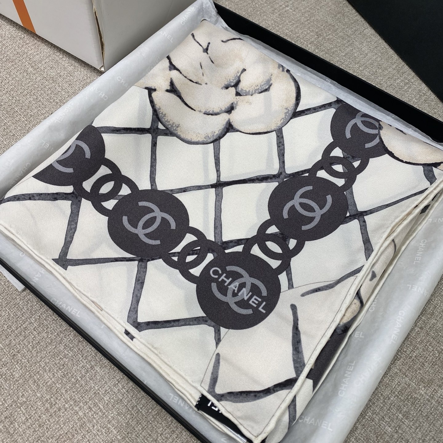 샤넬 카멜리아 스카프의 명작 가장 클래식한 동백 스카프가 흩날리면 하나의 풍경이 펼쳐짐 zp 공법 교체 및 복원, 스크럽 그립감, 핸드롤업 정교한 흑백 동백 그라데이션 안개 세트 1:1 고정도로 퀄리티를 검증해 볼 가치가 있는 클래식 소재: 실크 100% size: 90x90cm