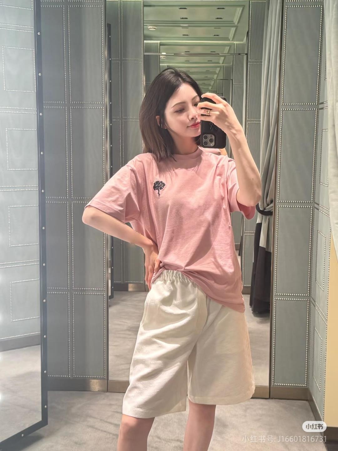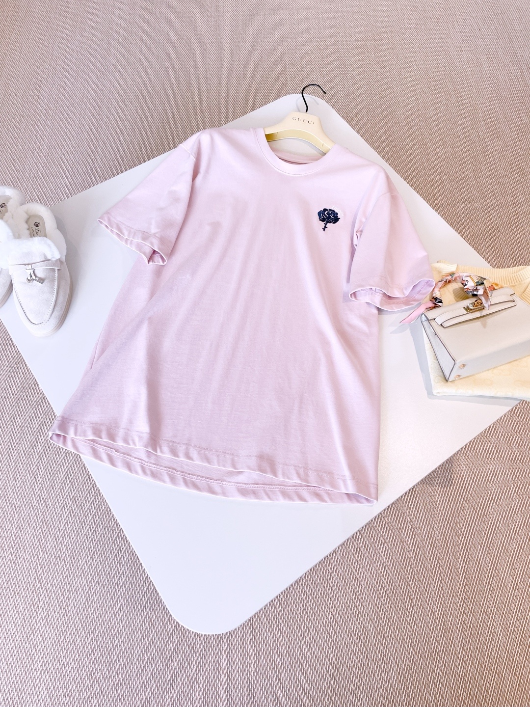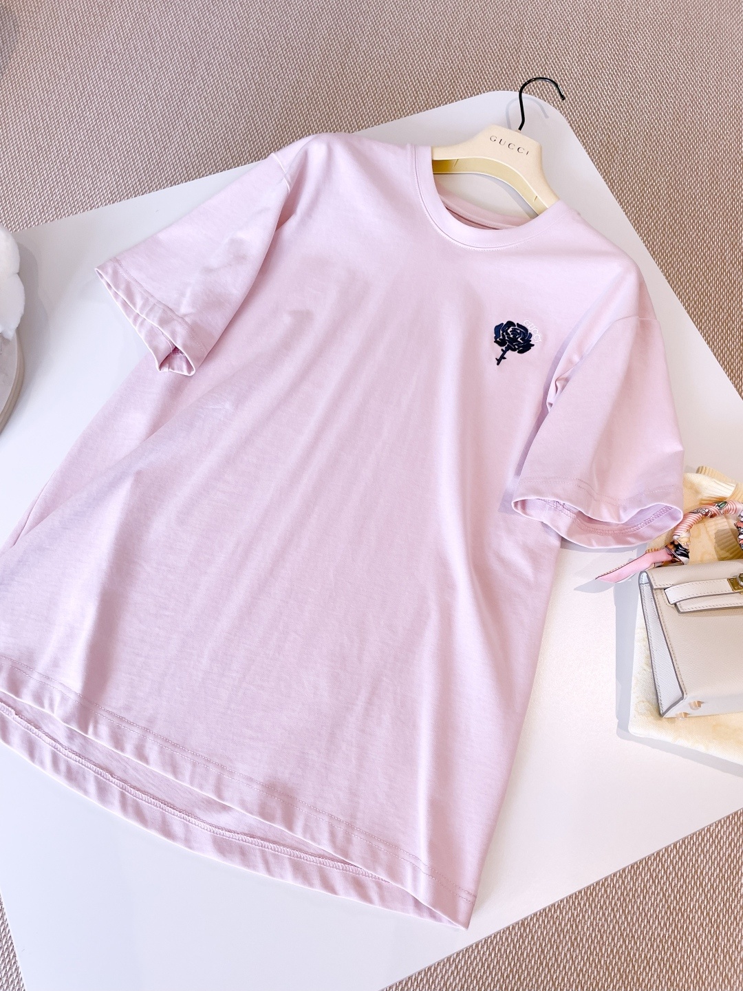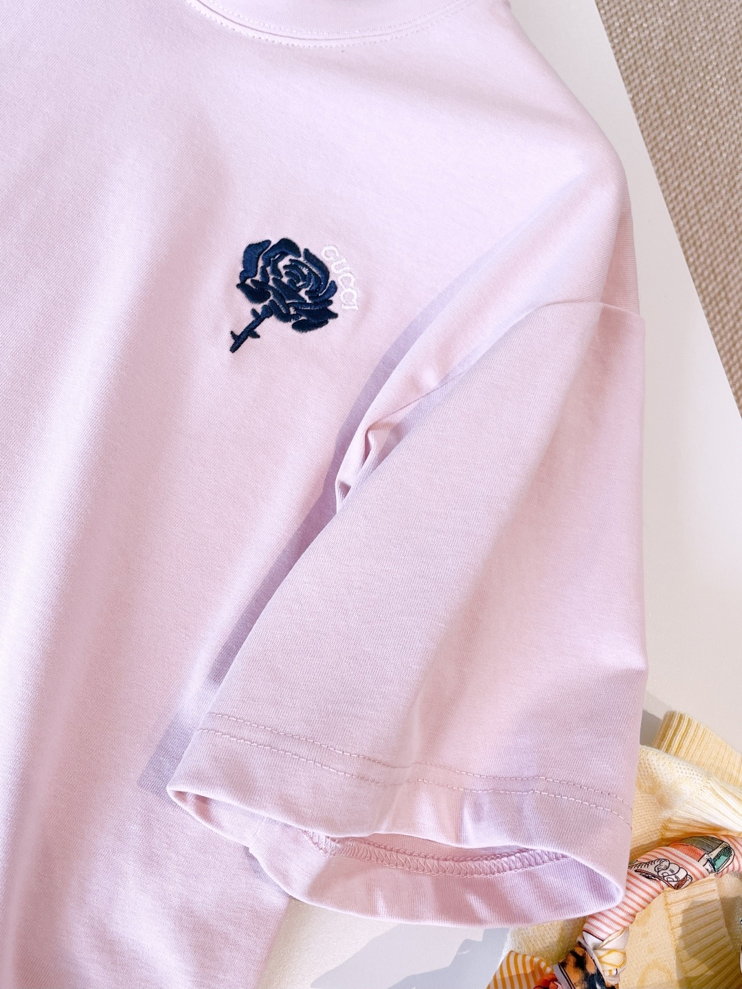 GUCCI 25 여름 장미 부케 자수 연분홍 반팔티 봄여름 꽃바다에 푹 빠진 가슴의 플라워 디자인은 이채롭고 따뜻하며 단아한 핏으로 몸매를 가리지 않고 심플한 데님 팬츠에 캐주얼한 스타일링