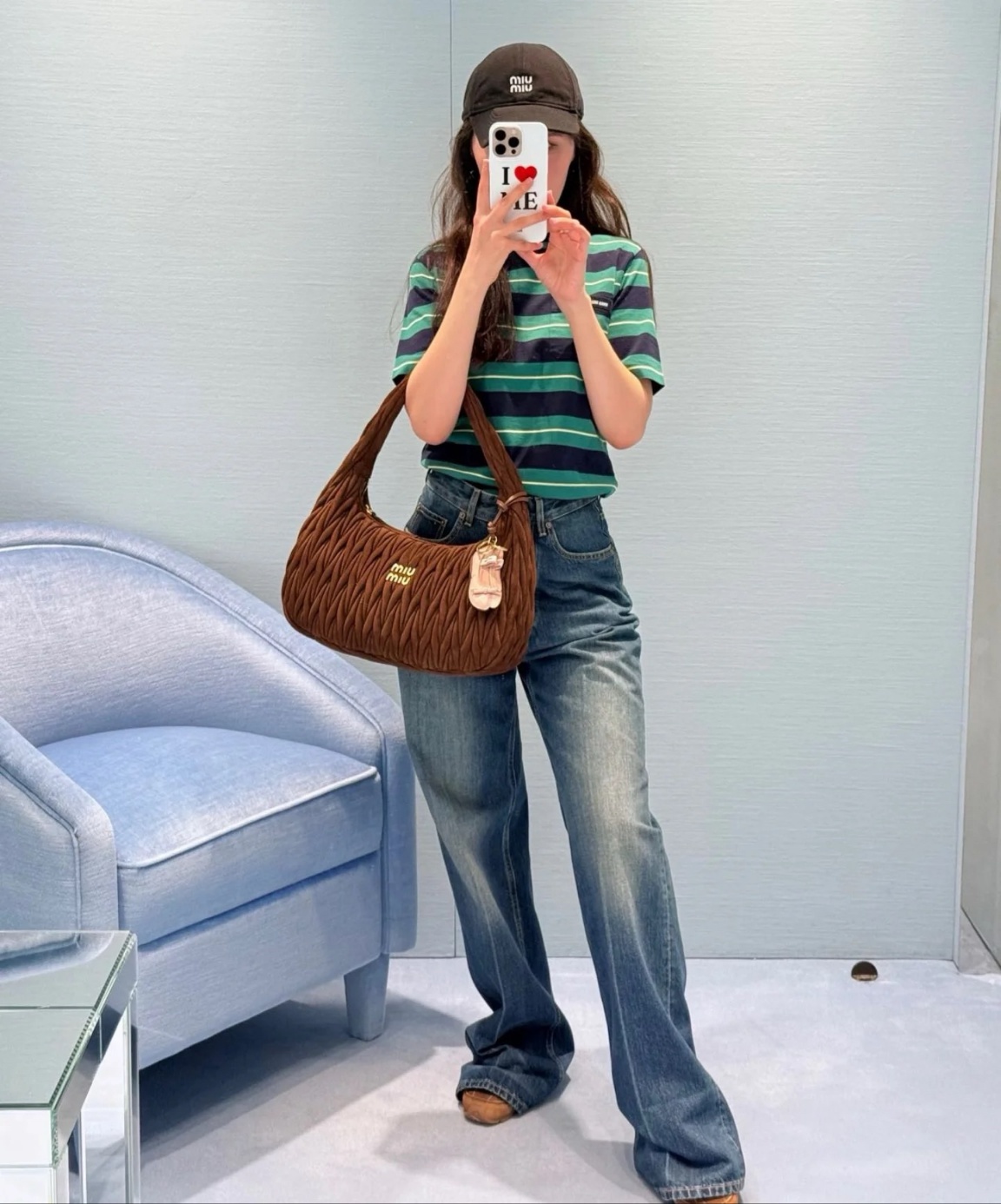 미우미우 2025 신상 그린 스트라이프 티셔츠 대판정직의 선염 스트라이프 순면 원단 넓은 진청 컬러에 노란색 핀 스트라이프 배색 빈티지하고 참신함, 핏이 정말 날씬해 보이고 앞면 원포켓 패치 포인트 로고 짜임으로 데일리룩 반바지, 스커트에도 OK