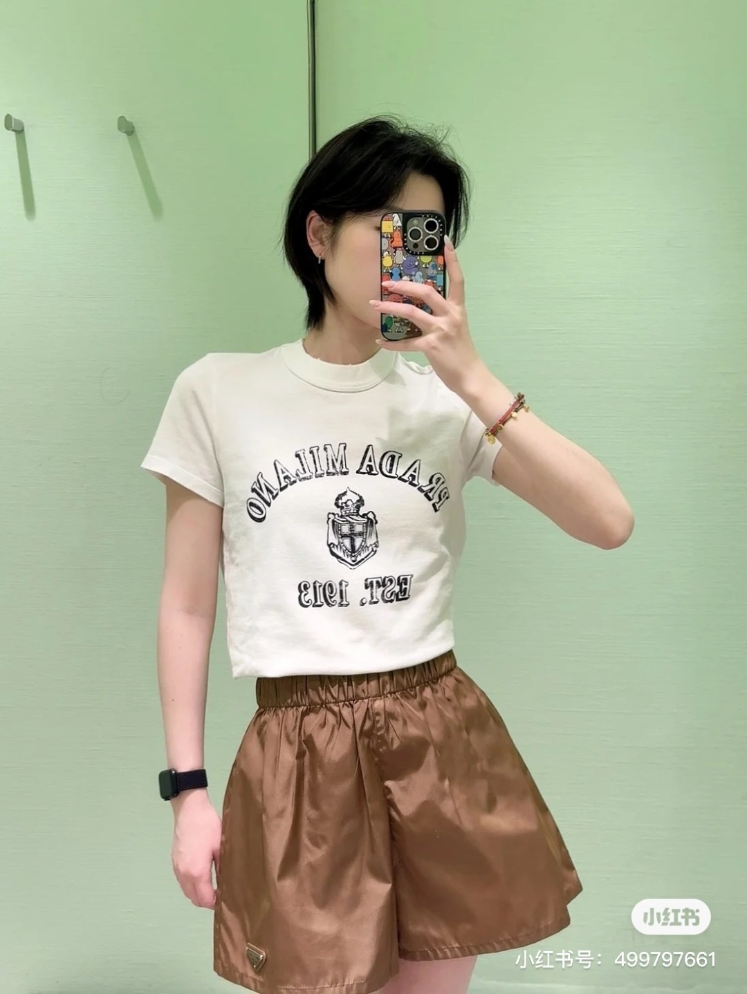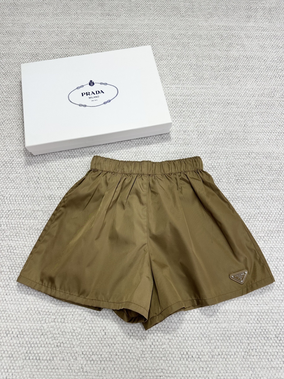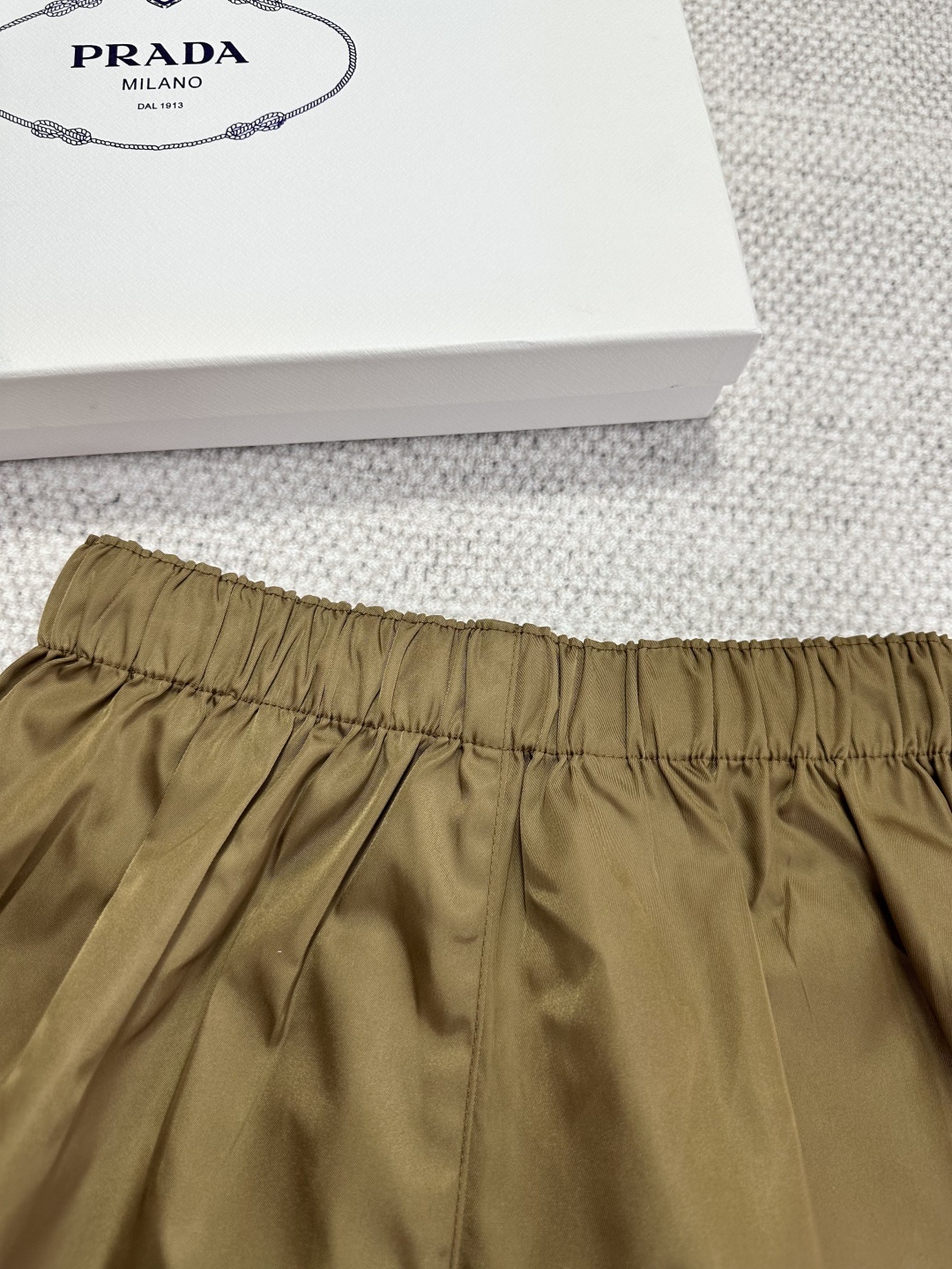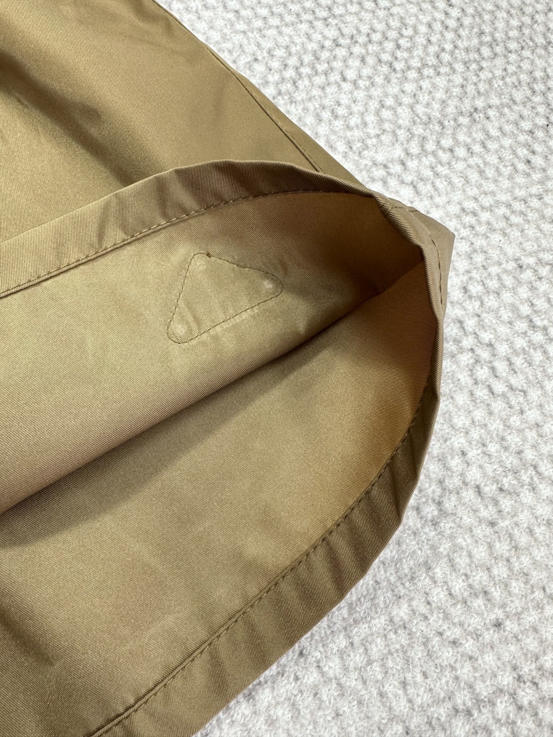 프라다 골드 브라운 반바지, ZP8900 맞춤 재생 나일론 원단, 오리지널 맞춤 에나멜 메탈 삼각형 로고 코팅 이 로고의 품질은 옷의 품질에 직접적인 영향을 미치는 고급스러움 허리 부분에 스트랩 끈을 부착하여 미니멀한 매력과 현대적인 실용성을 조화시킴 같은 계열의 재킷으로 코디 권해드려요