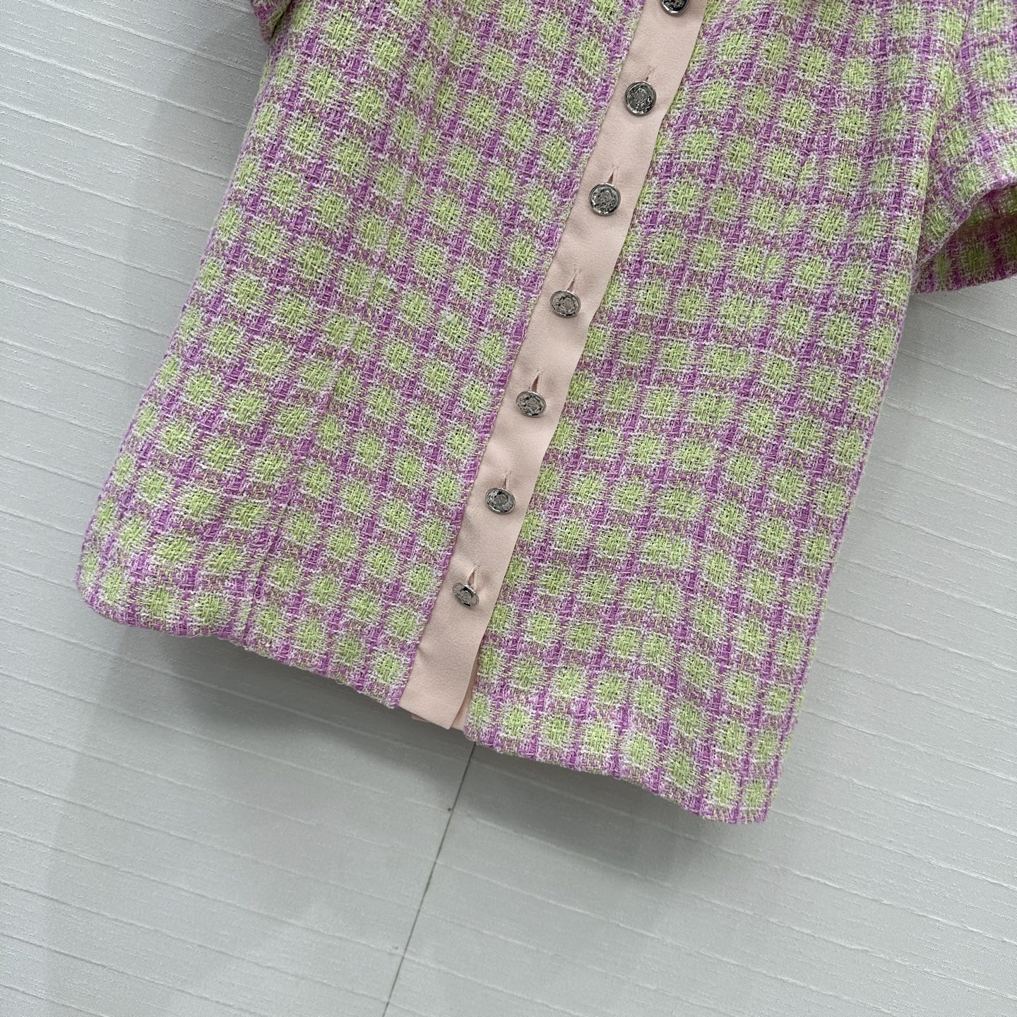샤넬 25 신상 실크 인형 넥 반팔 트위드 상의 파스텔 톤의 체크무늬 소프트 타탄체크 원단이 감미롭고 슬림한 체크 컷팅 핏 상체는 부드럽고 고급스러움 100% 실크 패치워크로 완성도 높은 디테일을 자랑함 36사이즈 어깨34 가슴84 총장51