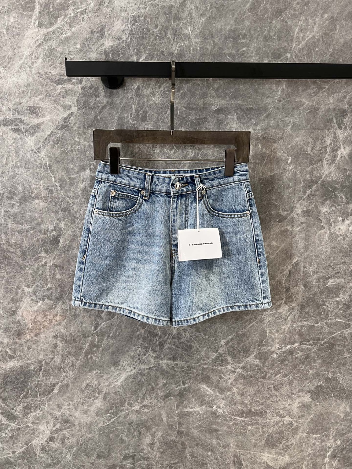 알렉산더더왕 25 이른봄 레터링 핫픽스 데님 숏팬츠 클래식 블루 워싱 컬러감의 핫 아이템 트윌 질감 초나이스, 하이웨스트 팬츠핏 날씬해 보이고 다리가 길어 보이는 라인 맞춤 yb메탈 액세서리