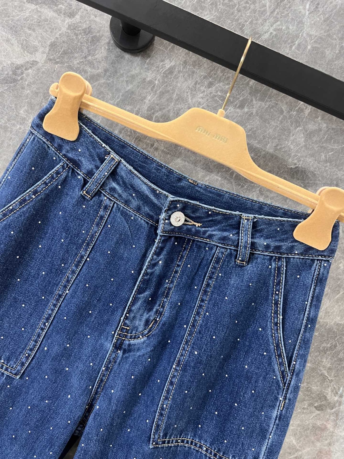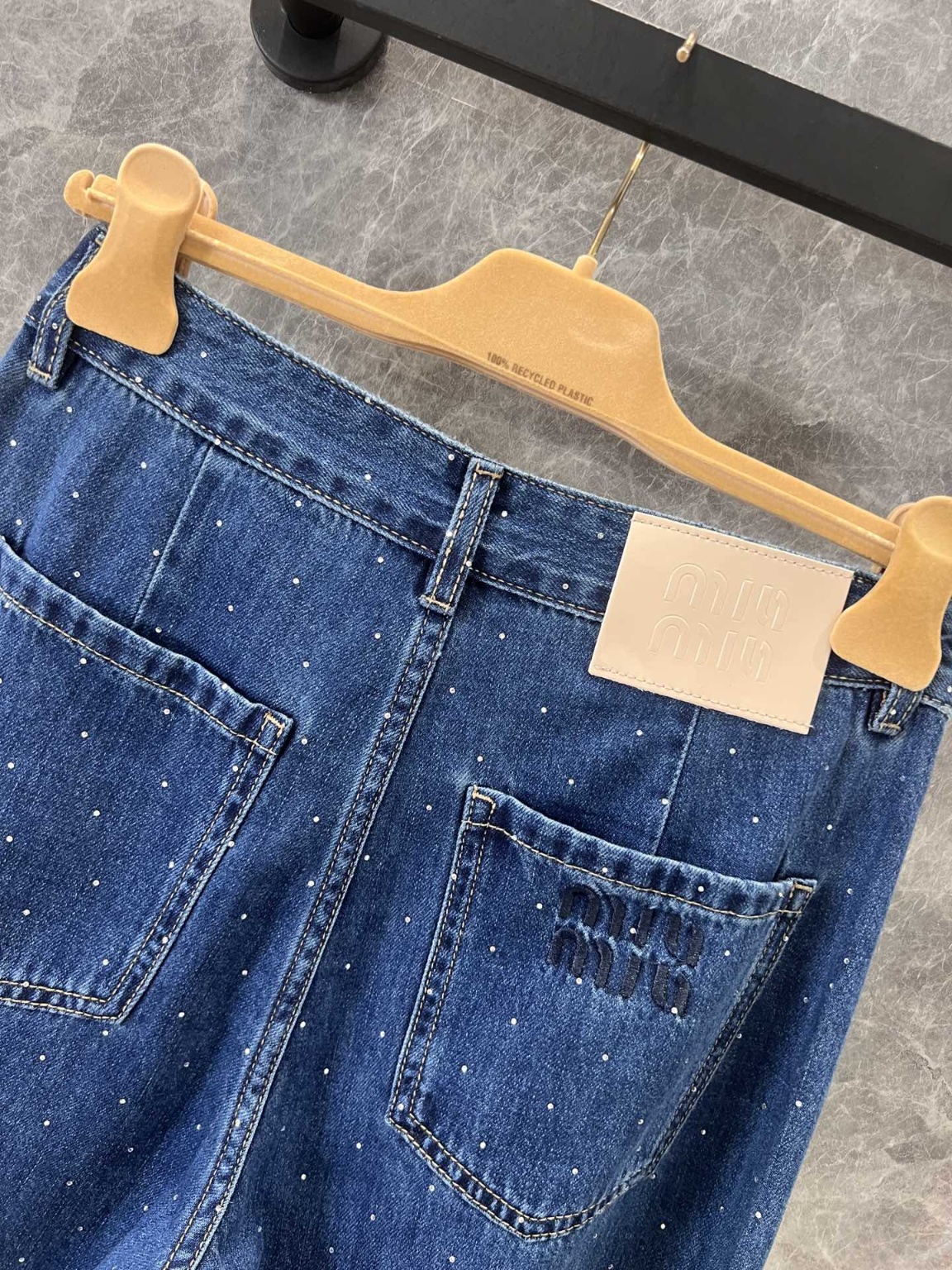 MiuMiu 25 봄여름 신상 핫피스 자수 7부 데님 팬츠 깔끔하고 루즈한 핏에 멋스러운 스트릿 허리라인을 올려주어 작은 키에도 좋은 비율의 옷을 입으실 수 있음