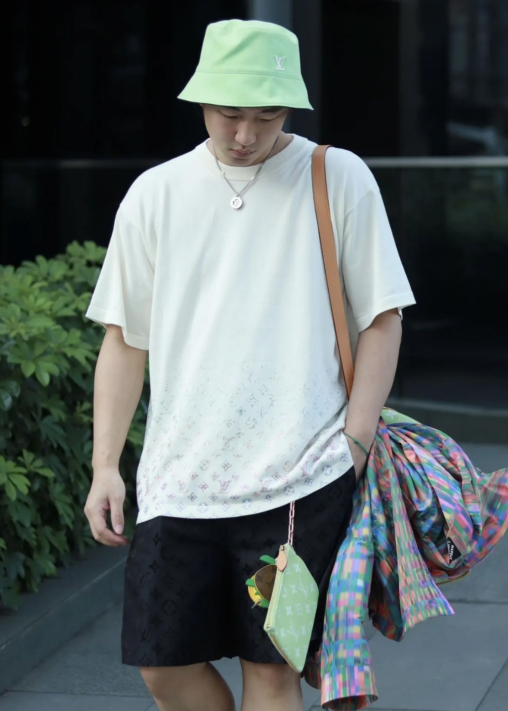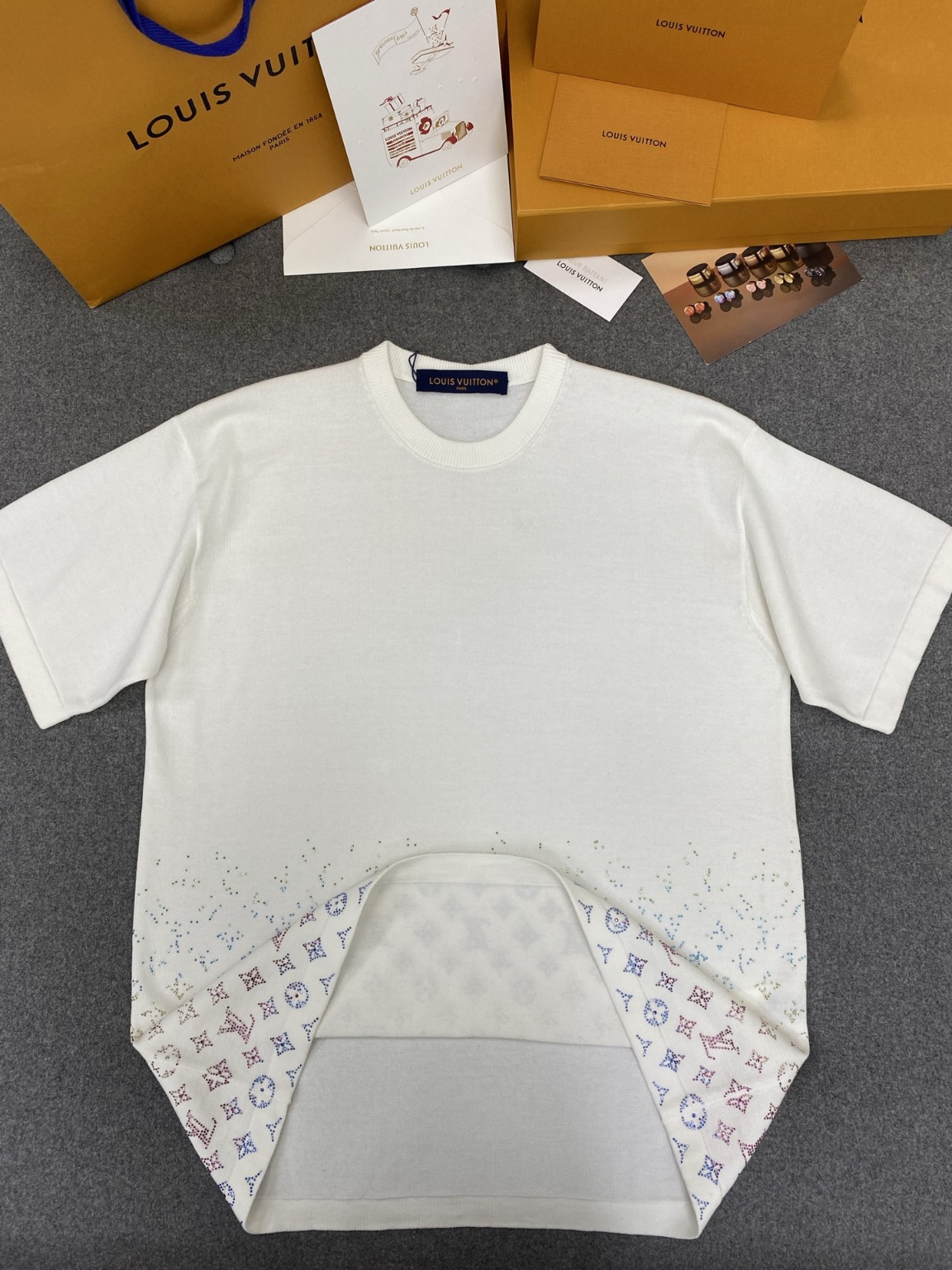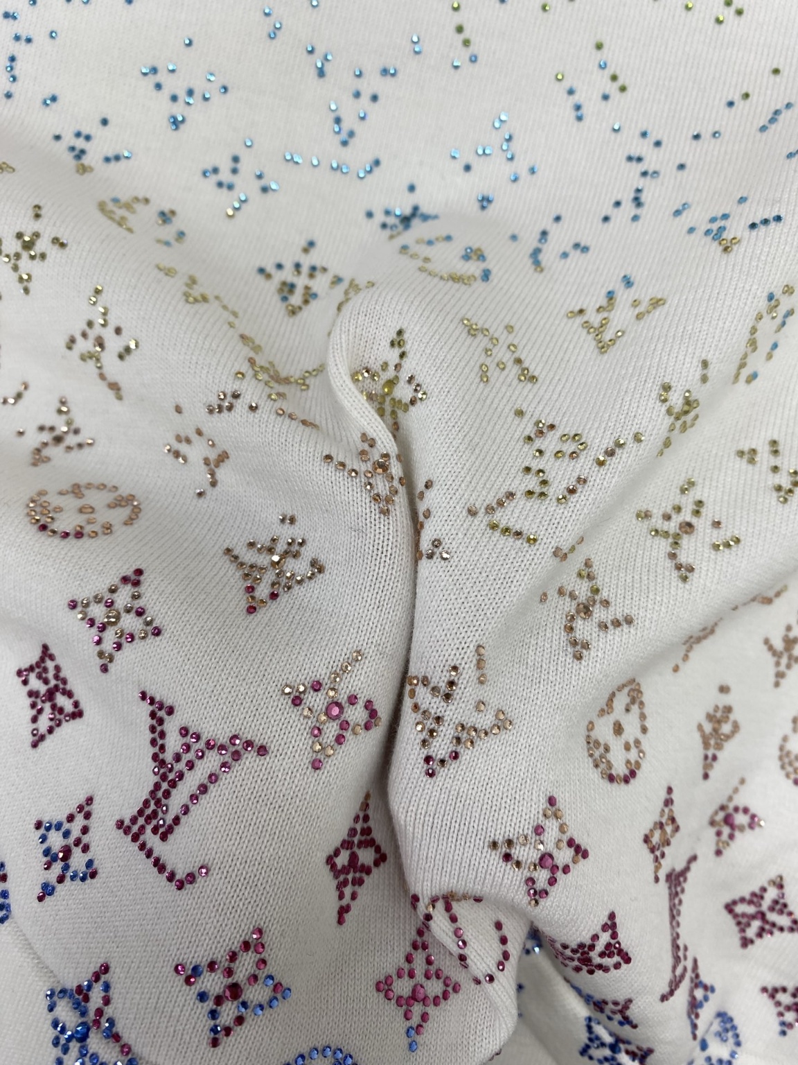 LV 모노그램 그라데이션 장식 반팔 라운드 티 환원 zp, 4가닥 60수 꼬임 빗장 솜, 매우 정교한 공법 굵은 바늘과 가는 바늘의 조합, 시중에 이런 실이 거의 없음 반복 인쇄된 실은 모두 맞춤 제작이 필요하기 때문에 출하가 느리고 시장 상품은 모두 색상과 재질이 모두 틀림 특히 만들기 어려운 것은 앞폭의 그라데이션 크리스탈 타일 총 11가지 색상, 한 벌에 12벌의 원사 대형 전자동 핫 드릴 프레스 드릴 드릴 바닥의 접착제는 열을 받아 점도가 균일하고 광택도, 조명 아래의 반짝임과 원판의 완전성을 보장함
