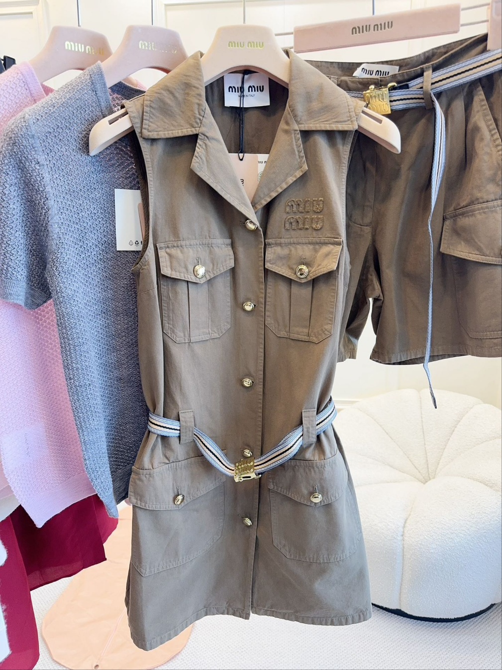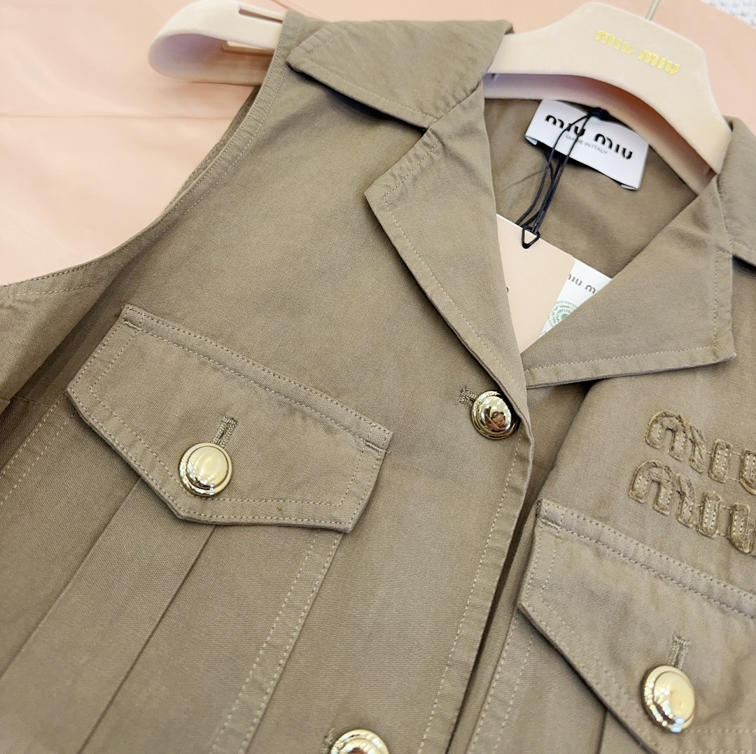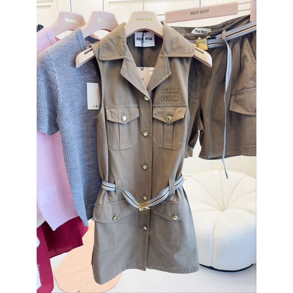 미우미우 2025 신상 카고 카고 민소매 원피스 시크한 핏에 날씬하고 고급스러우며 소녀스러운 느낌 카키 면 소재, 슬림한 민소매 일자 스커트 컷팅 셔츠 터틀넥+홑줄 여밈 앞판 카고 포켓 패치 멋스러움 맞춤 금색 버튼 장식, 맞춤 로고 금속 버클 벨트 몸매 라인을 살려 슬림하고 늘씬해 보이는 스타일리쉬함 레이어드 티셔츠 하나에도 OK