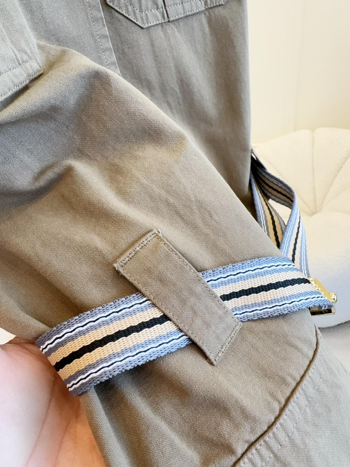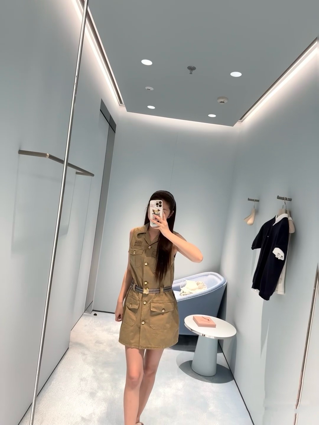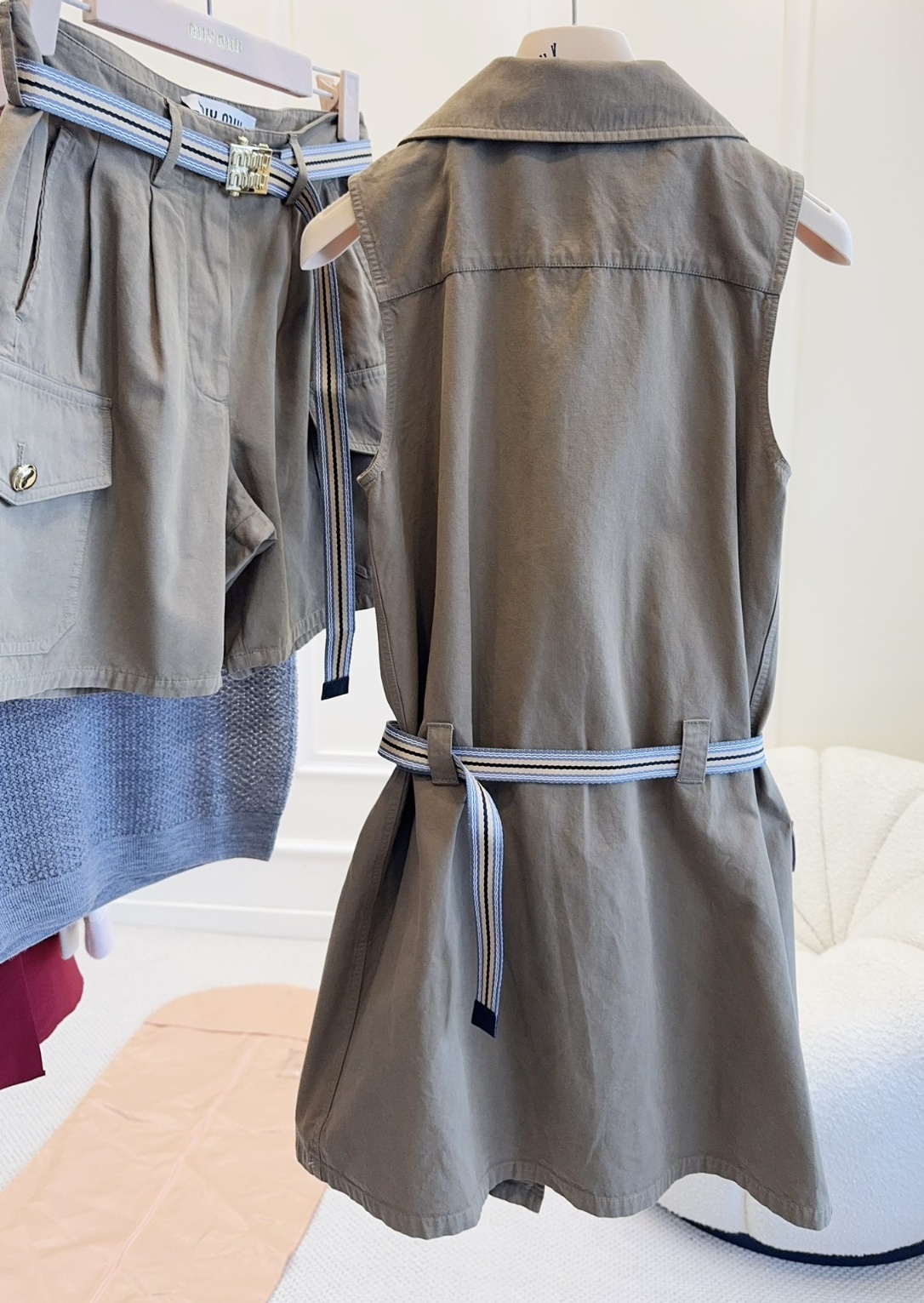 미우미우 2025 신상 카고 카고 민소매 원피스 시크한 핏에 날씬하고 고급스러우며 소녀스러운 느낌 카키 면 소재, 슬림한 민소매 일자 스커트 컷팅 셔츠 터틀넥+홑줄 여밈 앞판 카고 포켓 패치 멋스러움 맞춤 금색 버튼 장식, 맞춤 로고 금속 버클 벨트 몸매 라인을 살려 슬림하고 늘씬해 보이는 스타일리쉬함 레이어드 티셔츠 하나에도 OK