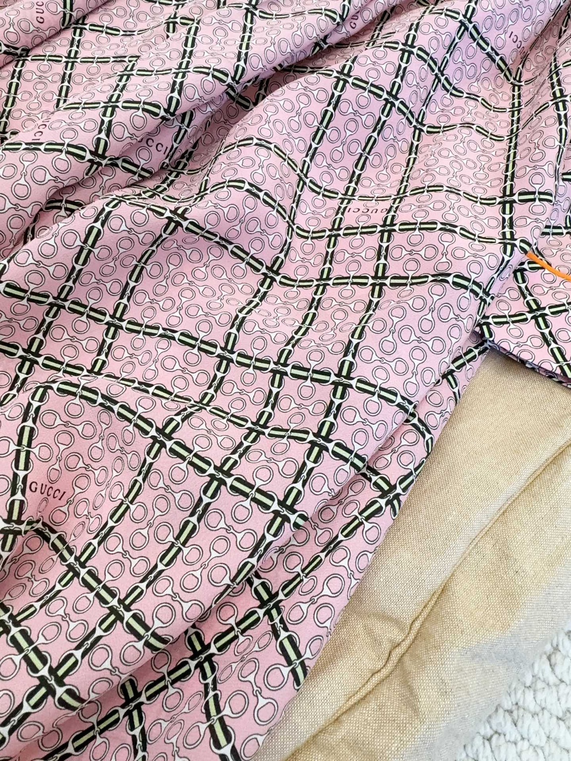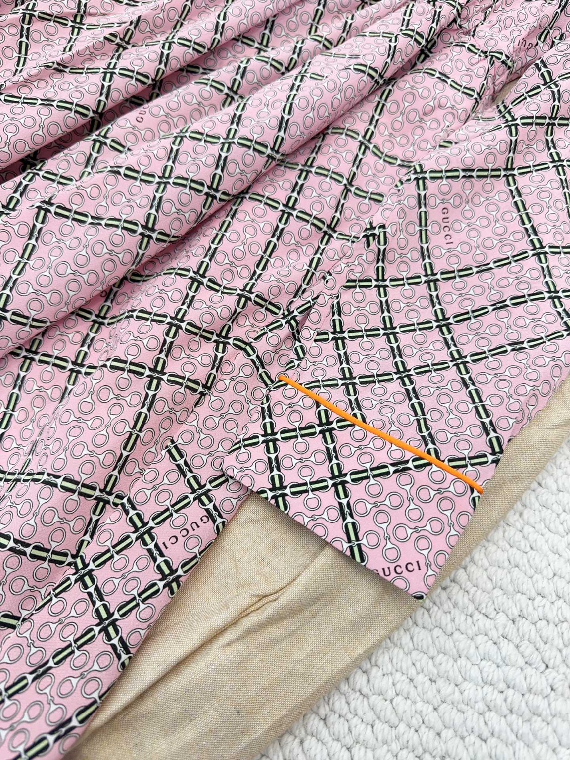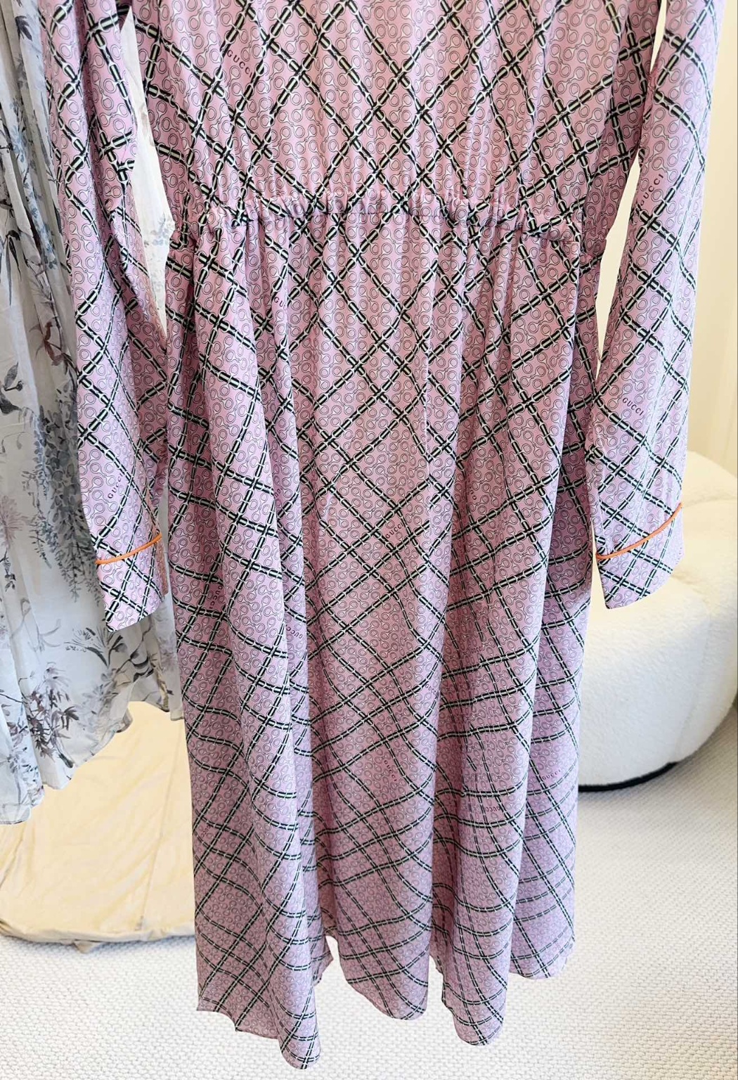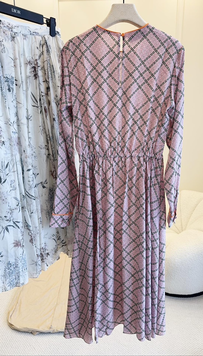 구찌 2025 신상 실크 프린트 원피스 100% 실크 원단, 산뜻한 스킨십 라운드넥 허리라인 클래식 핏, 부드러운 핑크 계열 체격에 맞게 허리라인을 잡아주어 허리라인 비율을 높여 우아하고 기품 있게