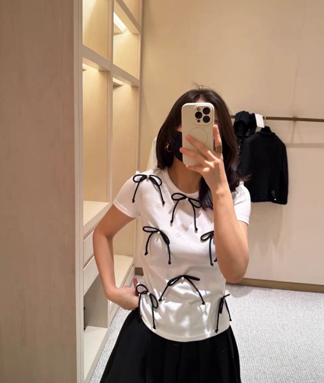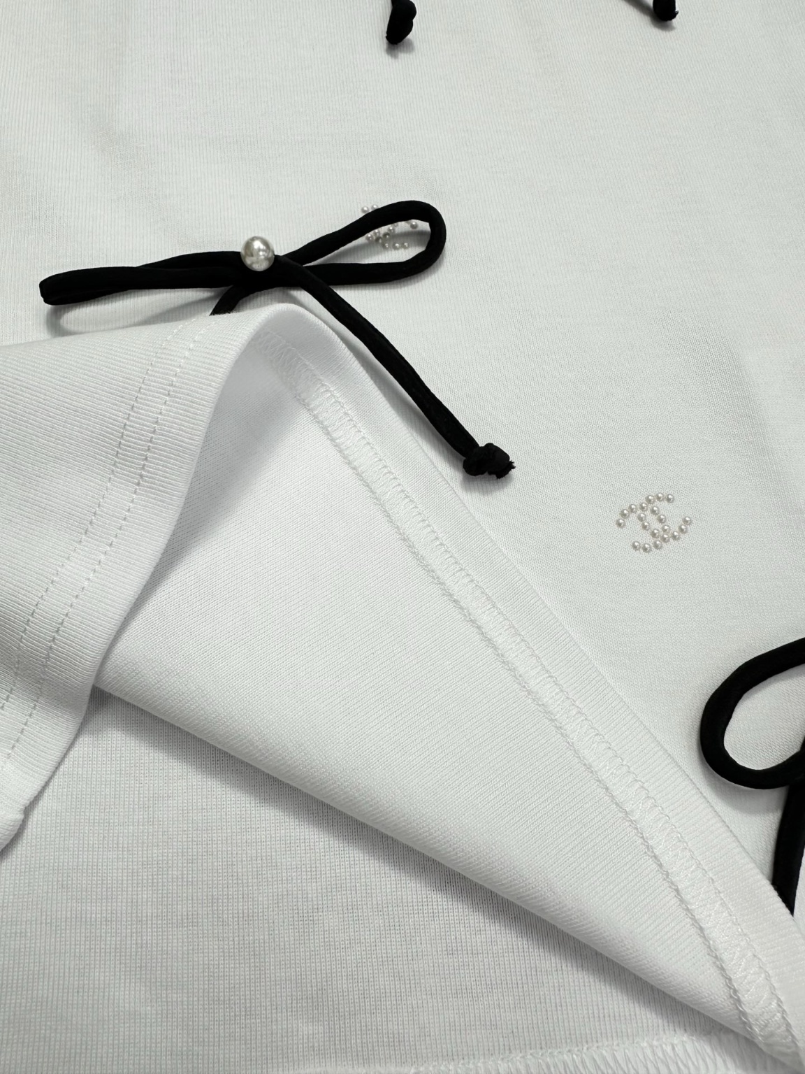 샤넬 25P 리본 니트 티셔츠, ZP22200 65수 순면 니트 원단을 맞춤 제작하여 두께, 그램 무게 모두 오리지널과 일치함 원기둥으로 천을 짜서 짜서 바느질 리본도 모두 커스텀 제작으로 100% 실크 소재 옷의 'cc logo 파마는 모두 맞춤 제작하여 올려야 하며 모든 방향에서 포지셔닝 요구 사항이 있음 슬림핏으로 날씬해 보임