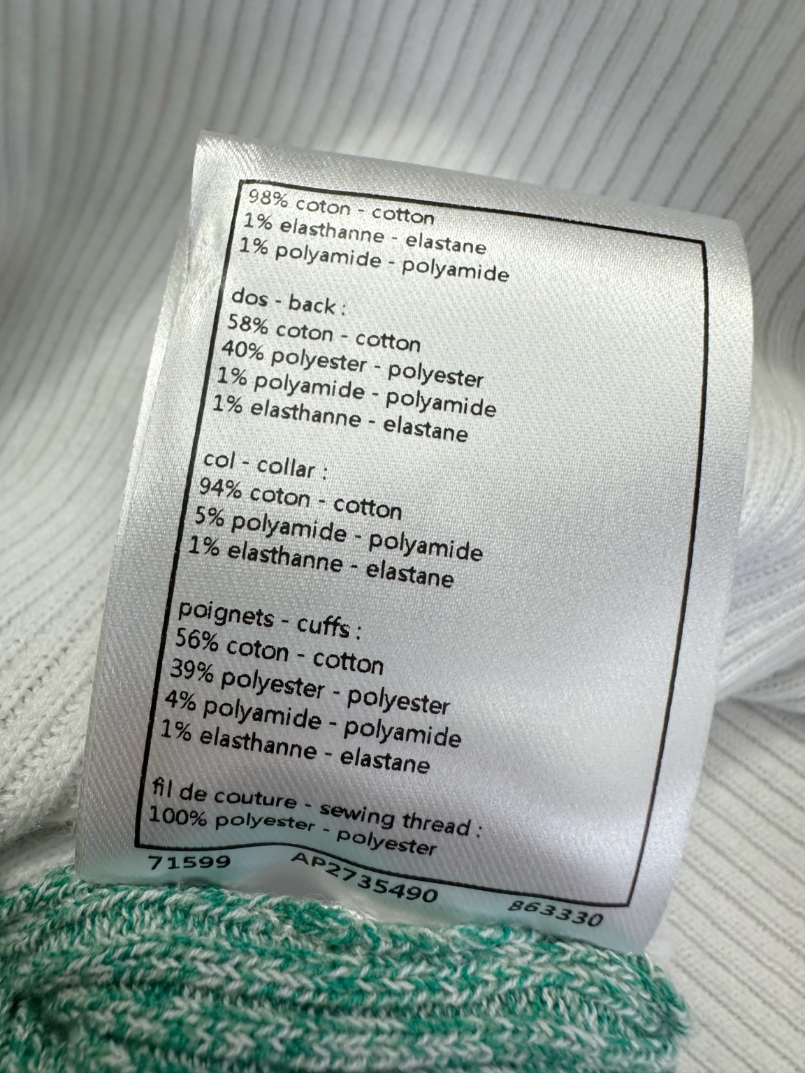 샤넬 25C 은박지 반팔 티셔츠, ZP26800 다색 정소면사를 맞춤 제작하고 독일 수입기의 16핀 구덩이로 짜여 있으며 이후 은박 공정을 진행함 이 시리즈 은 다림질은 좀 복잡해서 느리지만 기다릴 가치가 있음 오리지널 실버의 스판덱스 부분은 스판기에 따라 갈라짐
