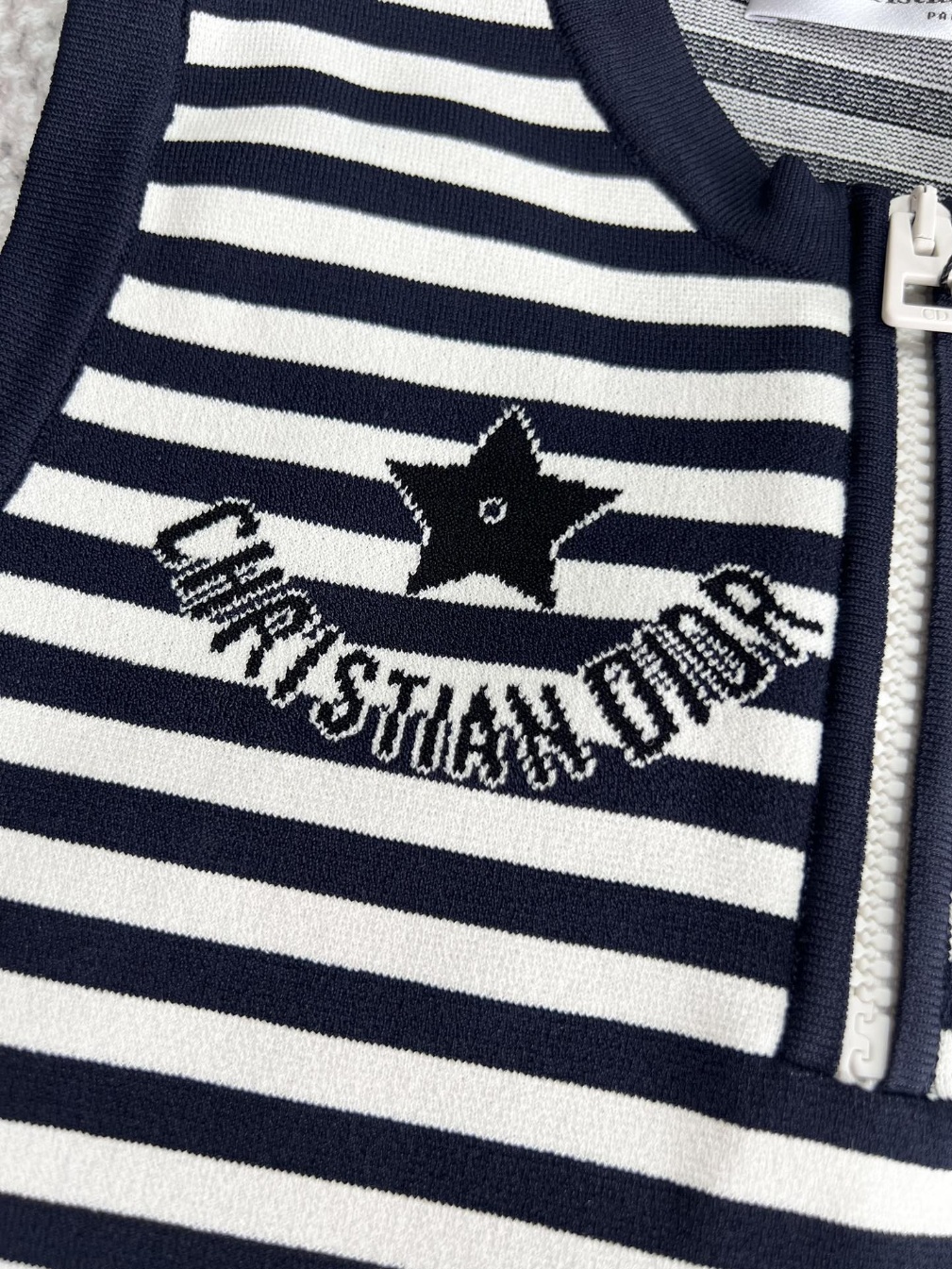디올 별 스트라이프 니트 반팔, ZP12500 이 나시는 Dioriviera 한정 라인에서 온 스타일리쉬한 디자인 여름에 이상적인 아이템 베이지와 네이비 컬러의 테크니컬한 니트 원단으로 정성스럽게 제작 Dior Mariniere 모티브로 장식된 민소매 쇼트 컷팅이 돋보임 정면에 로고 이니셜과 별 패턴, 지퍼 여밈으로 스포티한 룩을 연출 다른 아이템과 매치하여 세련된 연출이 가능함