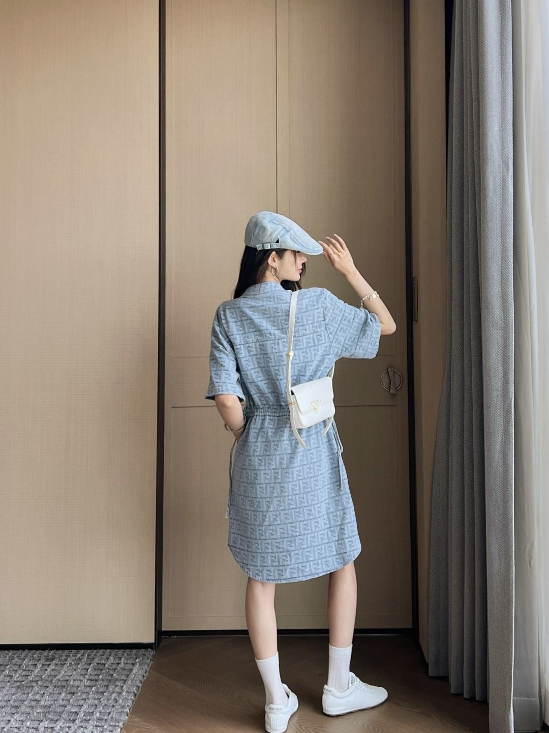 펜디 2025 시즌 한정 데님 컬렉션 원피스 모노그램 쟈가드가 트렌디하고 절제된 분위기와 럭셔리함 맞춤 제작된 고품격 트윌 면 워싱 데님 원단으로 결이 섬세하고 면감이 자연스러우며 근육감과 부드러움을 동시에 느낄 수 있음 스타일링에 무난한 오픈 몰드 커스텀 버튼 액세서리