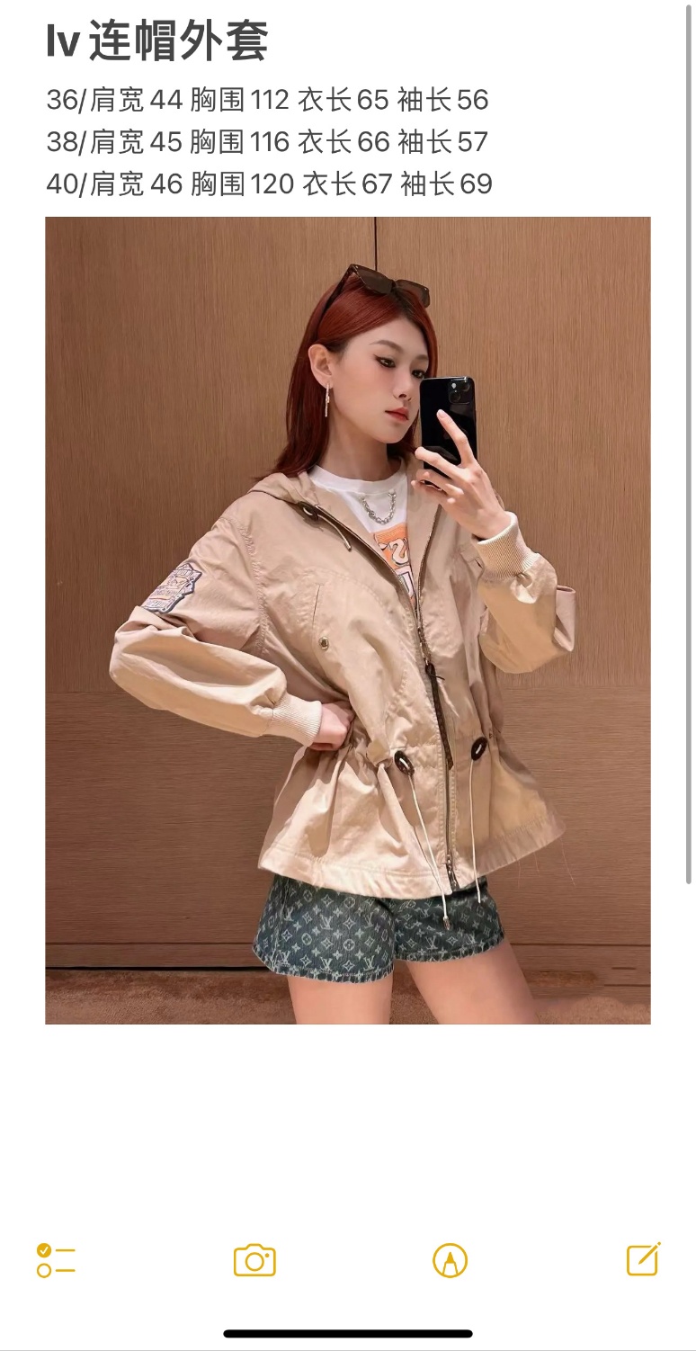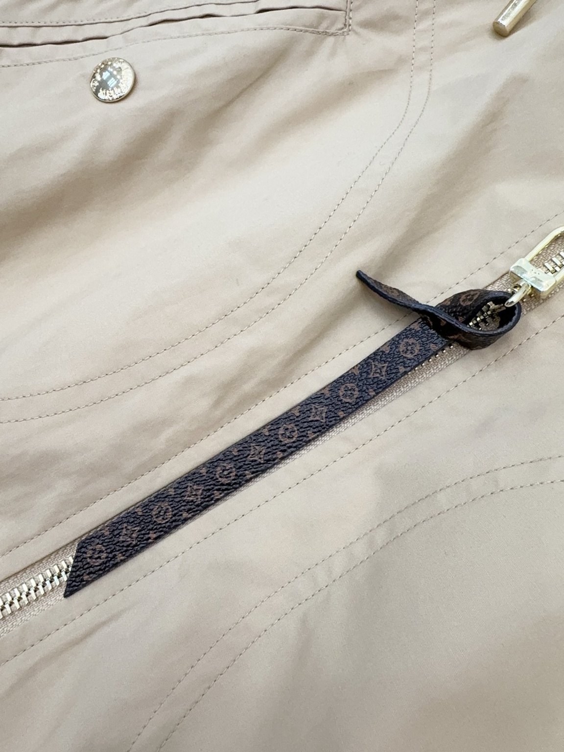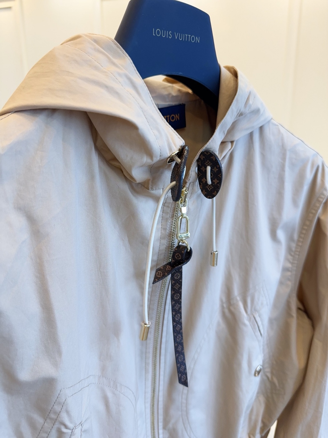 LV 2025 신상 스트링 조거 후드 트렌치코트 바람막이 자외선 차단에도 실용적, 맞춤 순면 카키 컬러 얇고 매끈, 캐주얼 후드 루즈핏 컷팅 맞춤 가죽 후드 스트링, 앞판 금속 지퍼 여밈 브라운 톤 올오버 포인트 지퍼와 헤드에 격식을 더함 오리지널 개발 금속 부자재 질감 가득