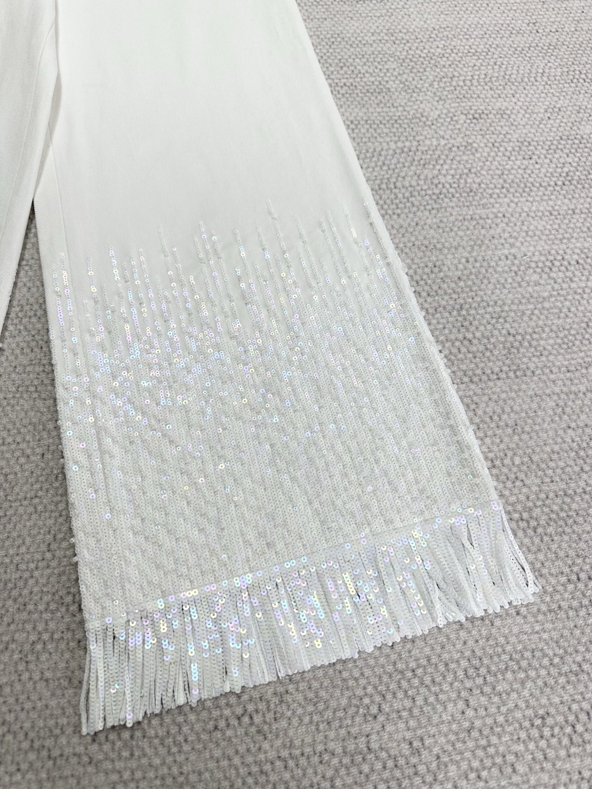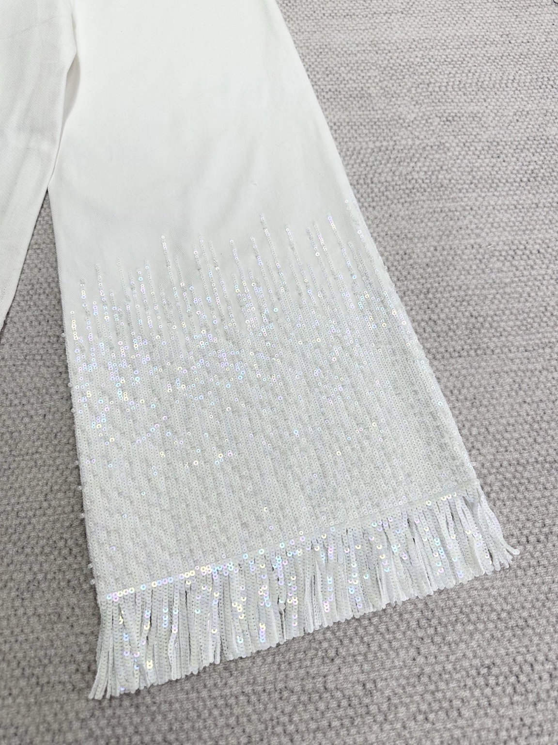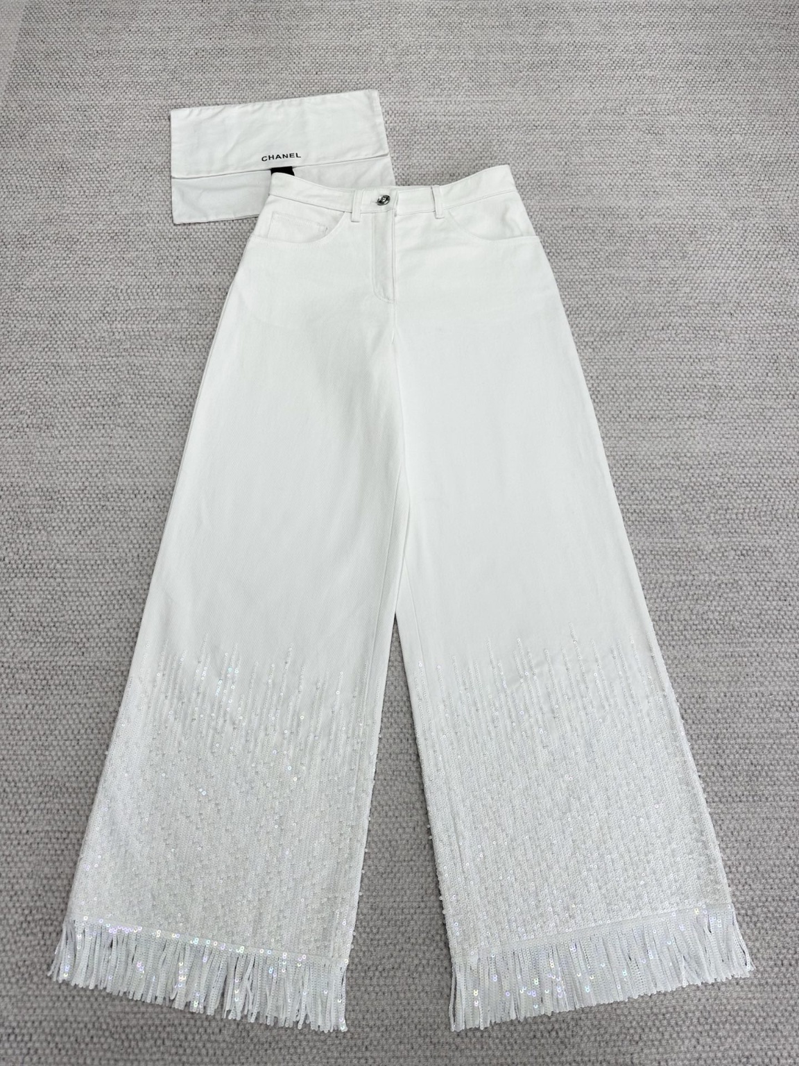 샤넬 25S 수술 비즈 와이드 데님 팬츠 캐주얼한 핏, 원단은 전부 커스텀으로 제작 데님인 듯 다른 원단의 결이 뻣뻣한 편 바짓가랑이의 술이 완벽하게 흘러내리며 깔끔하고 질서정연함 이것이야말로 이 바지 핏의 완벽한 표현 저희 비즈는 전부 수용성 자수이고 안쪽 자수는 완전히 원단에 밀착되어 찌그러지지 않으며 일반적인 낚싯줄 자수 안쪽은 볼록한 실이 피부를 마모시킴