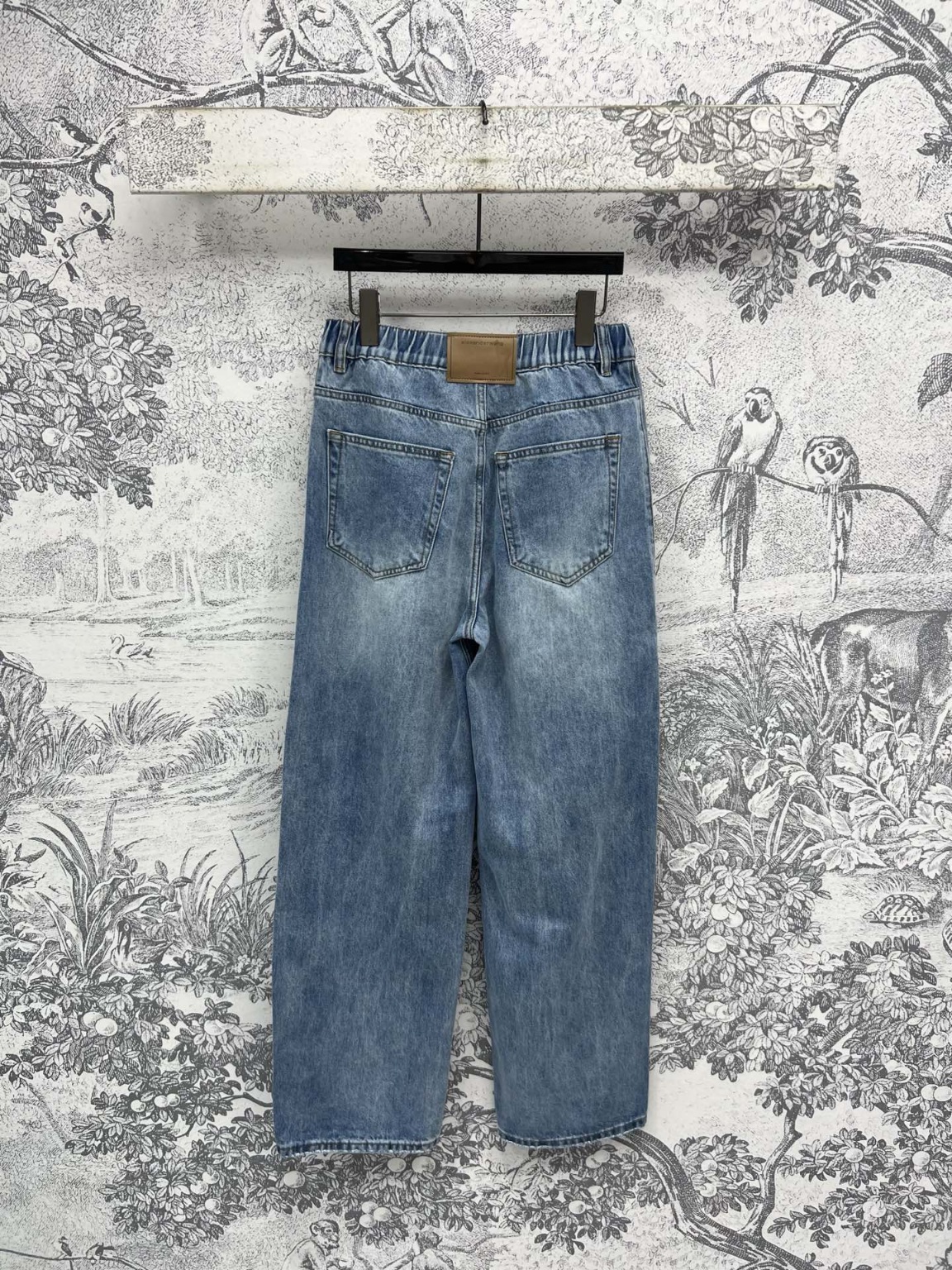 알렉산더왕 25 봄여름 신상 엠보싱 로고 프린트 데님 팬츠 하이웨스트 A라인핏, 양면 엠보싱 로고 프린트 포인트 나른한 캐주얼룩 티셔츠와 셔츠를 매치해도 좋음 빈티지 라이트블루 믹스매치