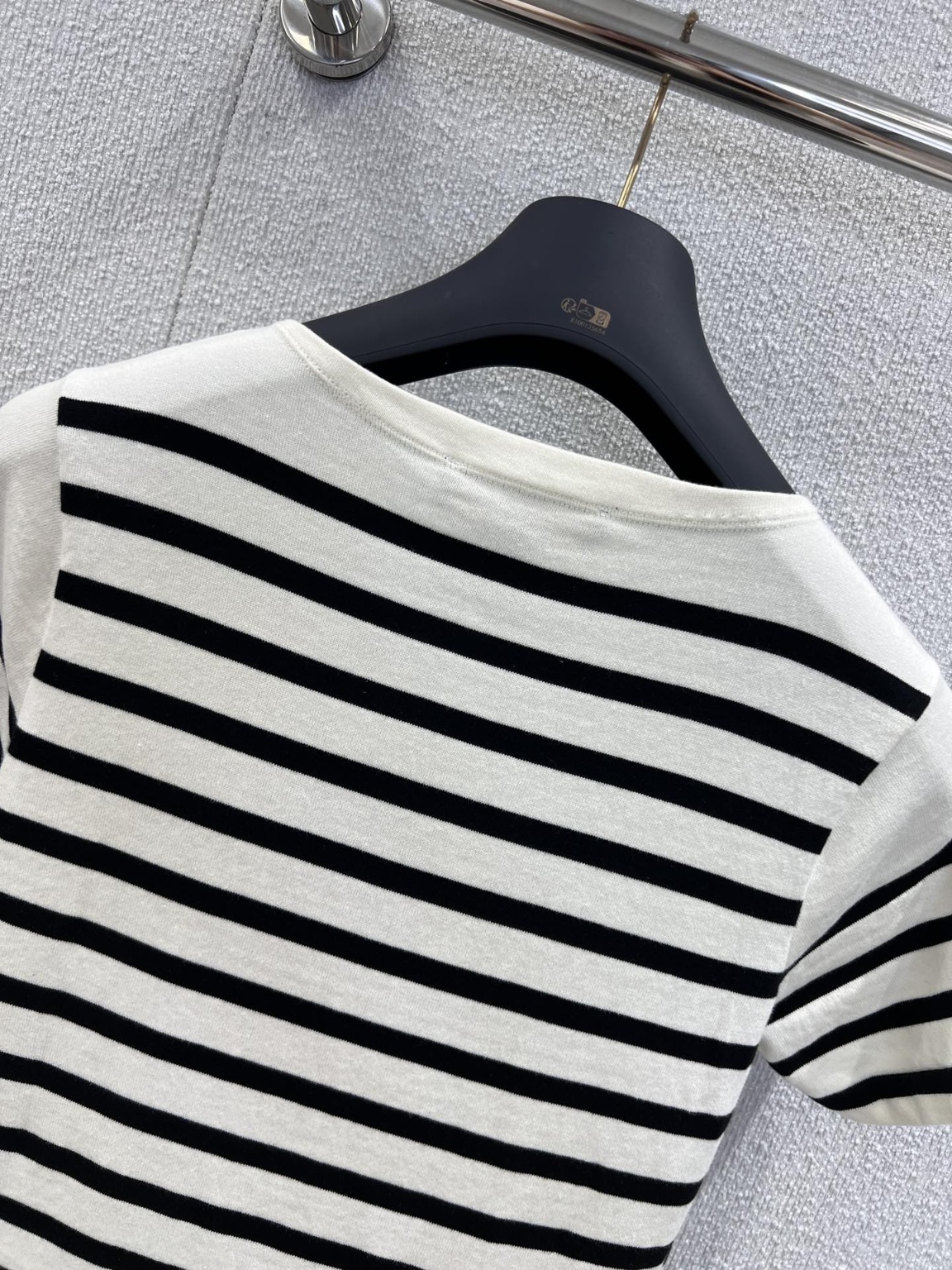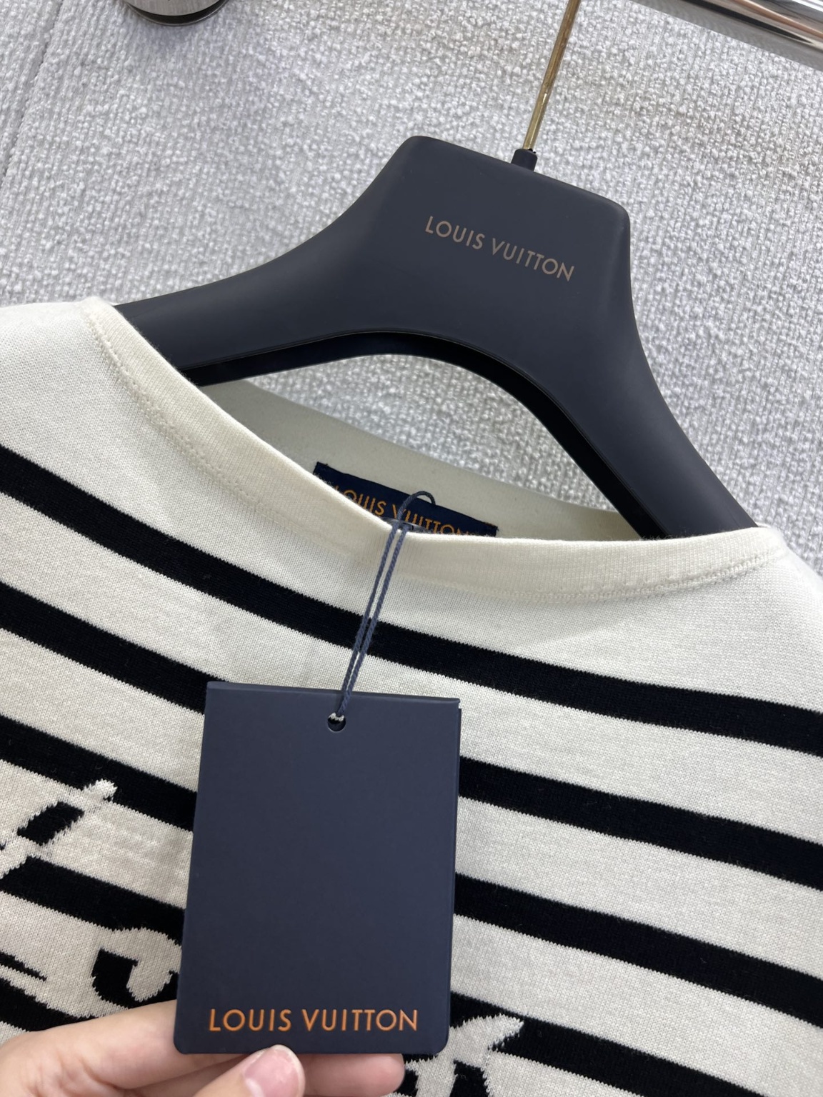 루이비통 25 봄여름 신상 레터링 스트라이프 니트 원피스 면사 원단 통기성 편안한 질감 루즈핏 티셔츠 컷팅 직조 신축성 있어 날씬해 보이는 시각적 바디효과 전체 블랙 앤 화이트 스트라이프 장식 레터링 로고를 삽입 고급스러운 격식을 살려 이너 하나로도 컬러풀하고 스타일리쉬하게