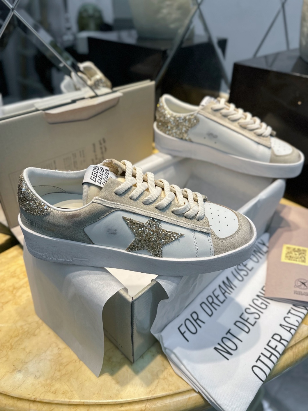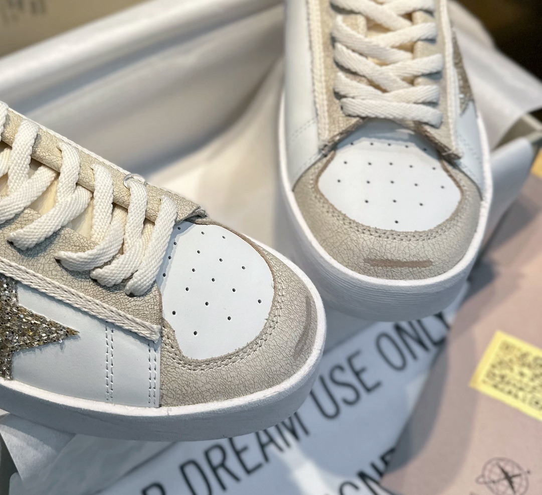 GGDB STARDAN 스타단 골드테일 스니커즈 신발 표면에 크랙이 터지는 공법으로 빈티지한 얼룩을 만들어줌 사이드 별과 끝부분에 골드 스팽글 포인트 4cm 두꺼운 IP발포창으로 가볍고 키높이 신발 전체가 금빛 찬란함