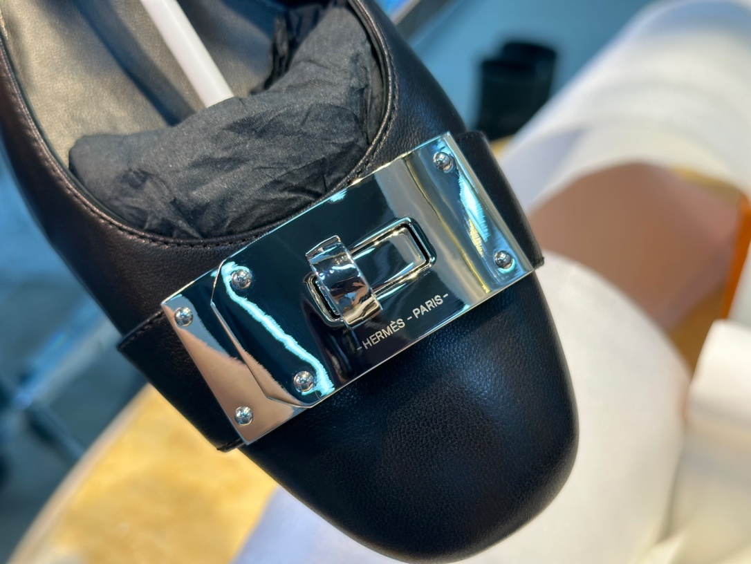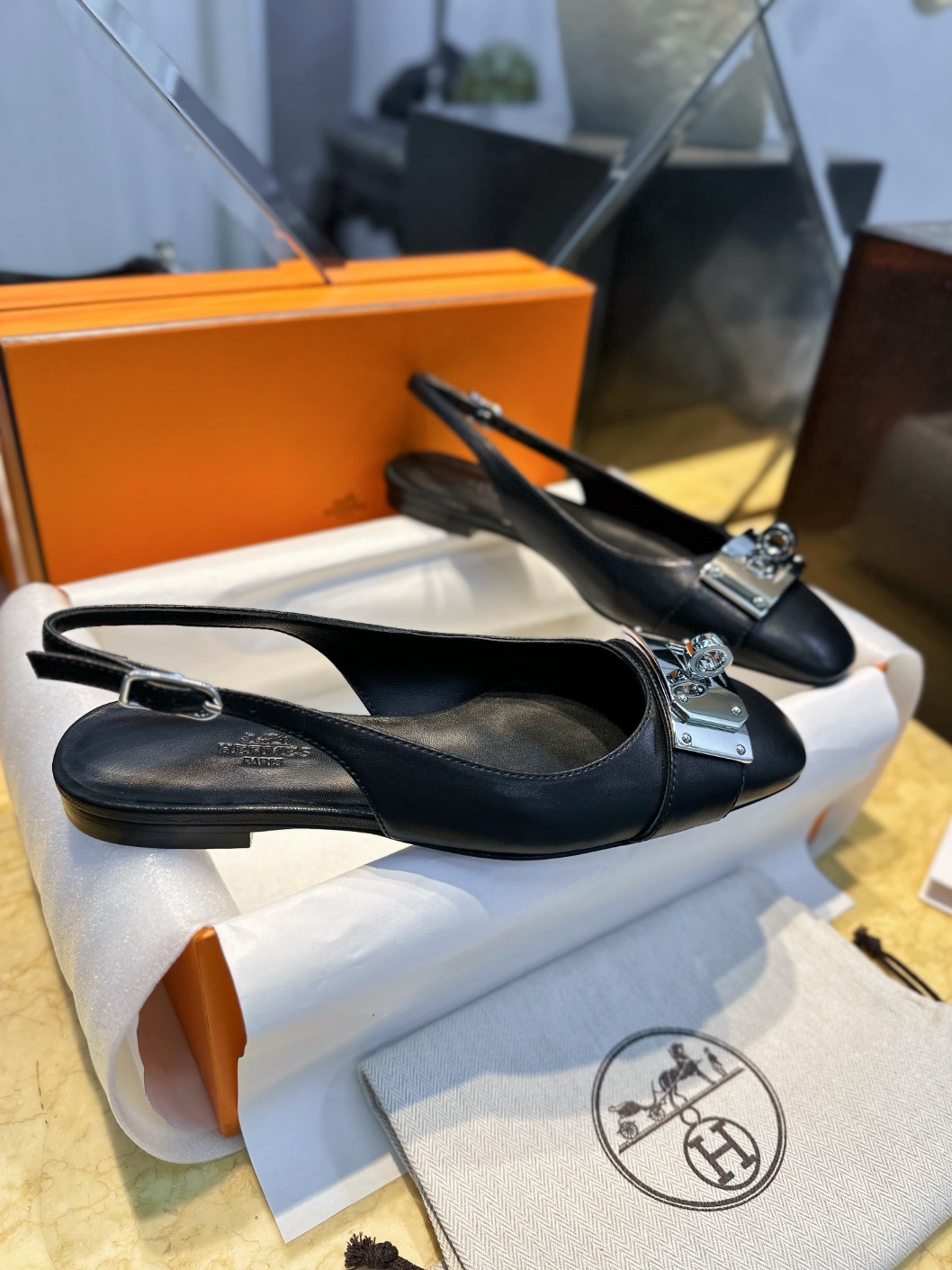 에르메스 이노센트 플랫 슬링백 염소 가죽의 섬세하고 정교한 조화에 팔라듐 도금 오버사이즈 KELLY 버클 극과 극의 대비를 내세워 아방가르드하고 여성스러운 스타일링 뒤 스트랩 조절로 발 모양에 대한 포용력이 크며 굽도 줄이고 나른하게 캐주얼하게 신을 수 있는 느낌