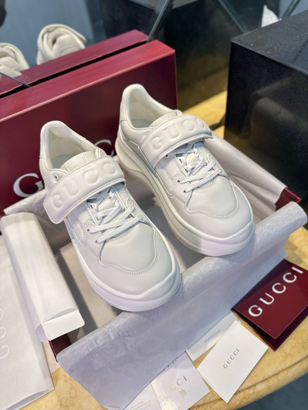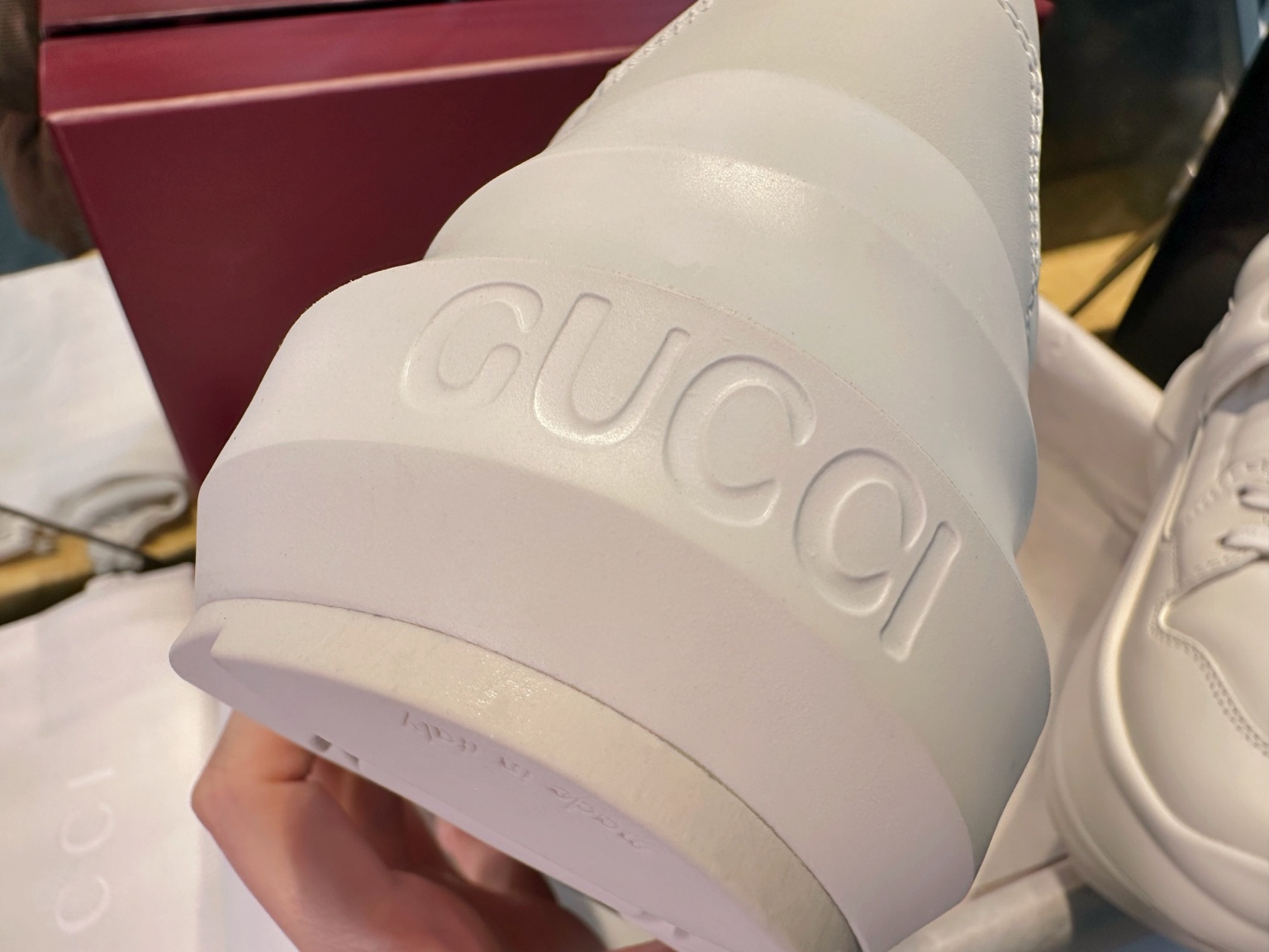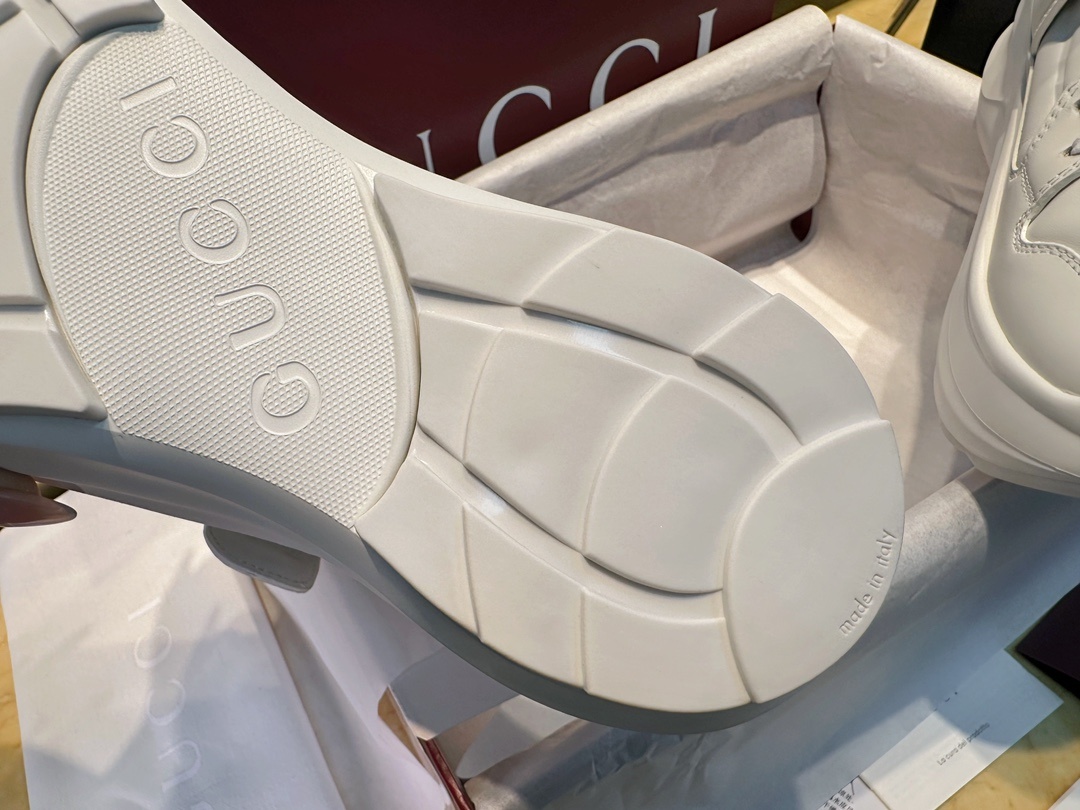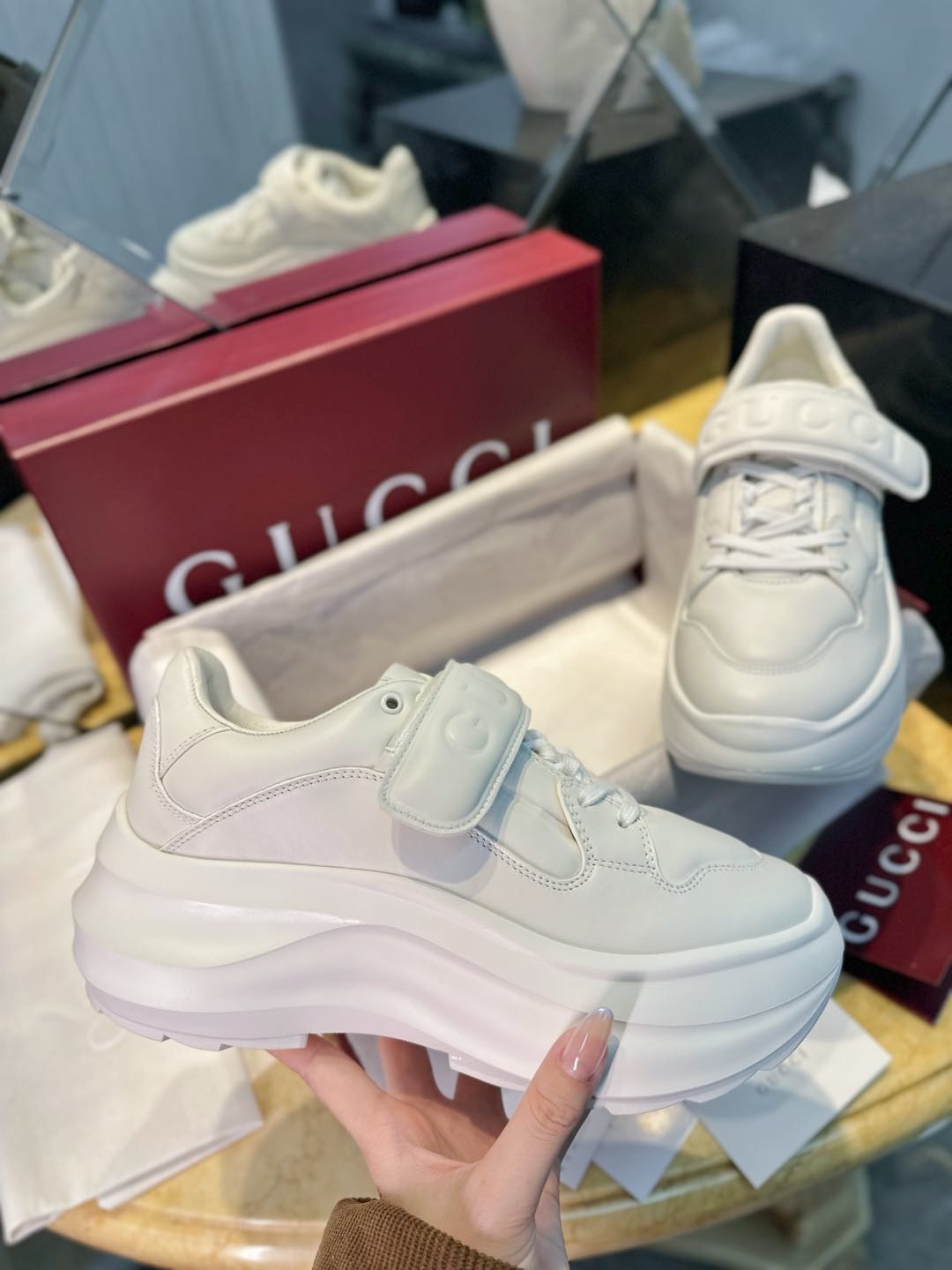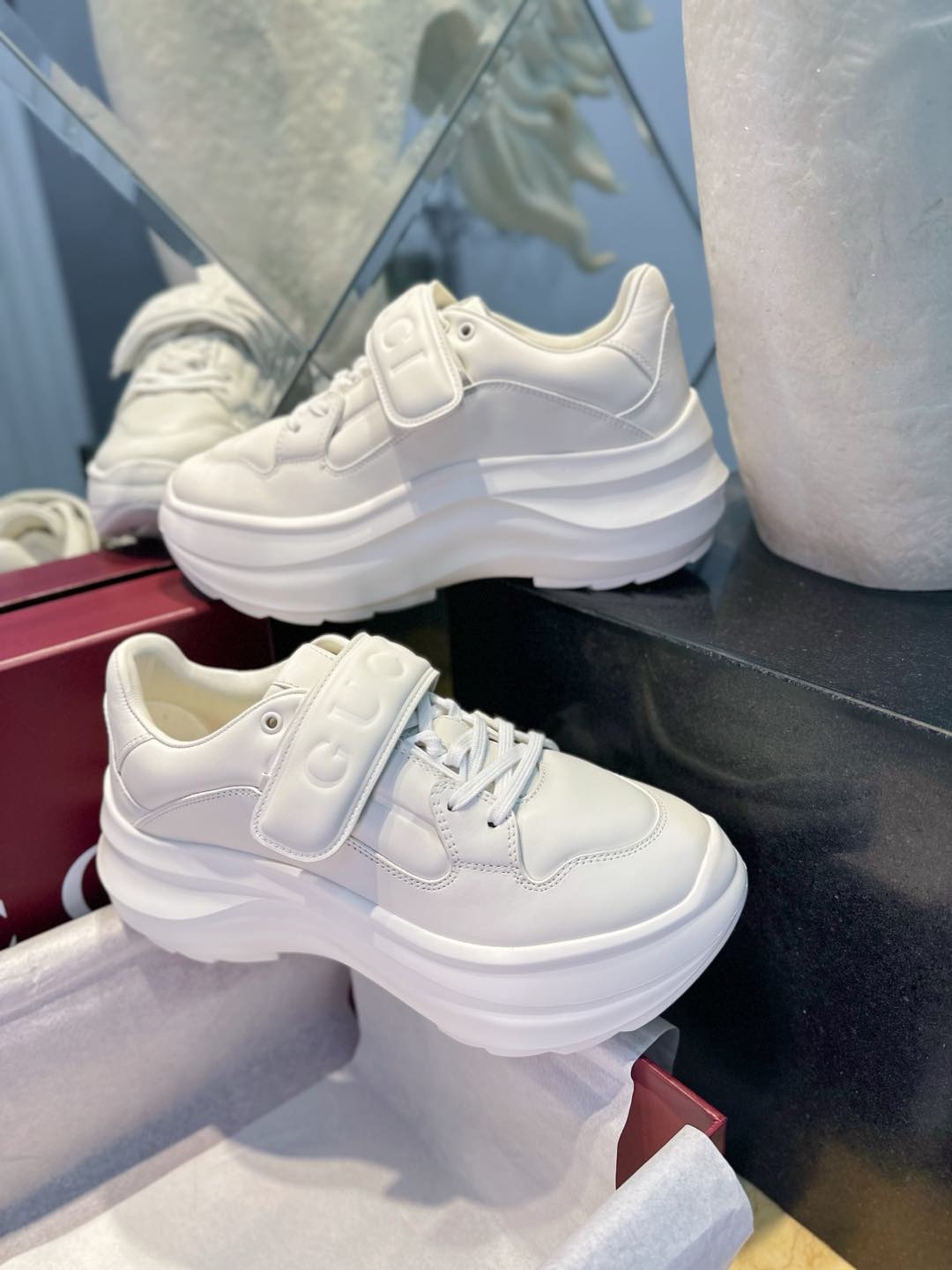 구찌 웨이브 클래식 웨지 스니커즈 조각감 있는 통굽 스타일로 가벼운 EVA 고무창으로 되어 있어 편안하고 오래 신을 수 있으며 부드럽고 찰진 발 구찌 필기체 로고로 포인트를 주어 브랜드의 아이덴티티를 부여함 가볍고 날렵한 느낌을 주는 새로운 스니커즈