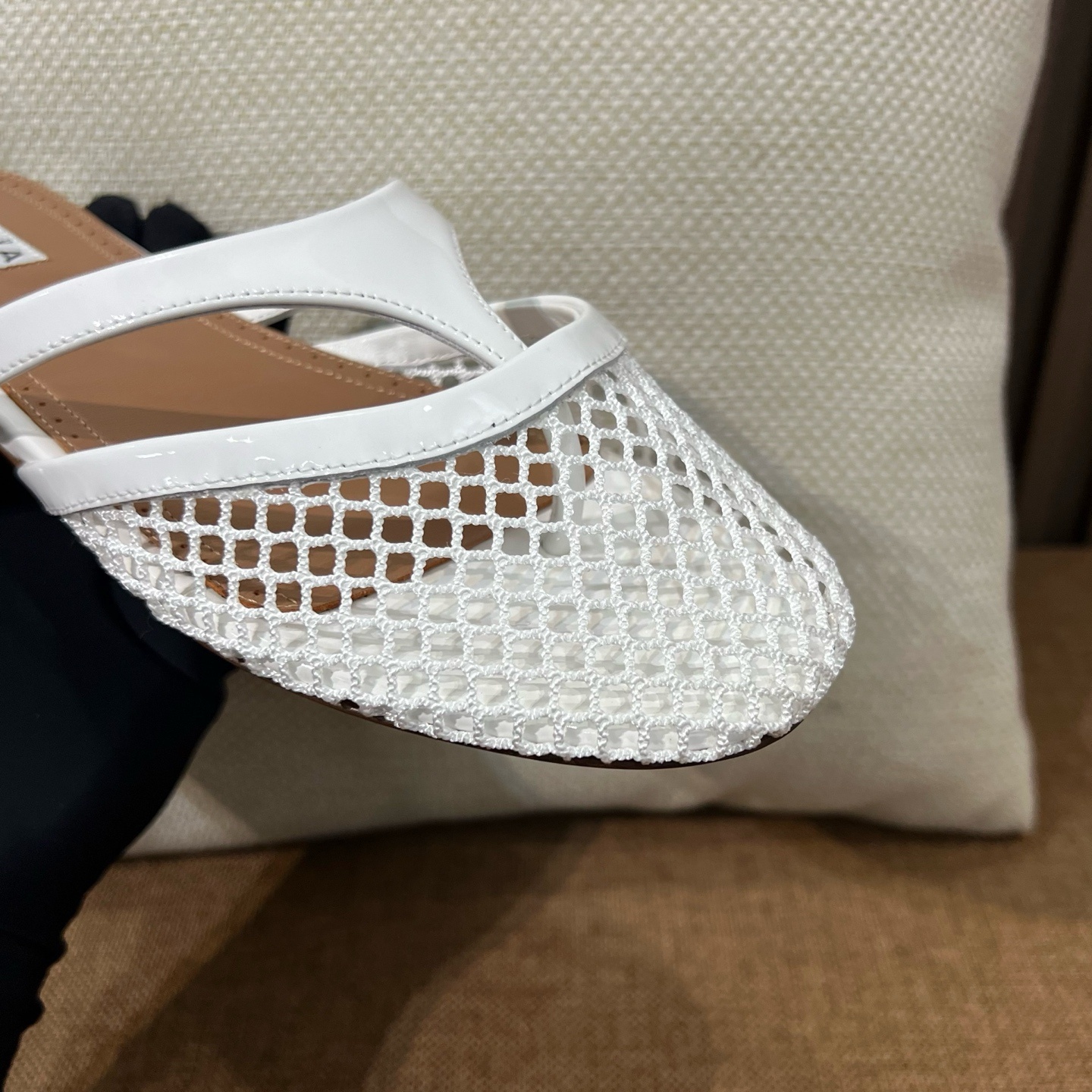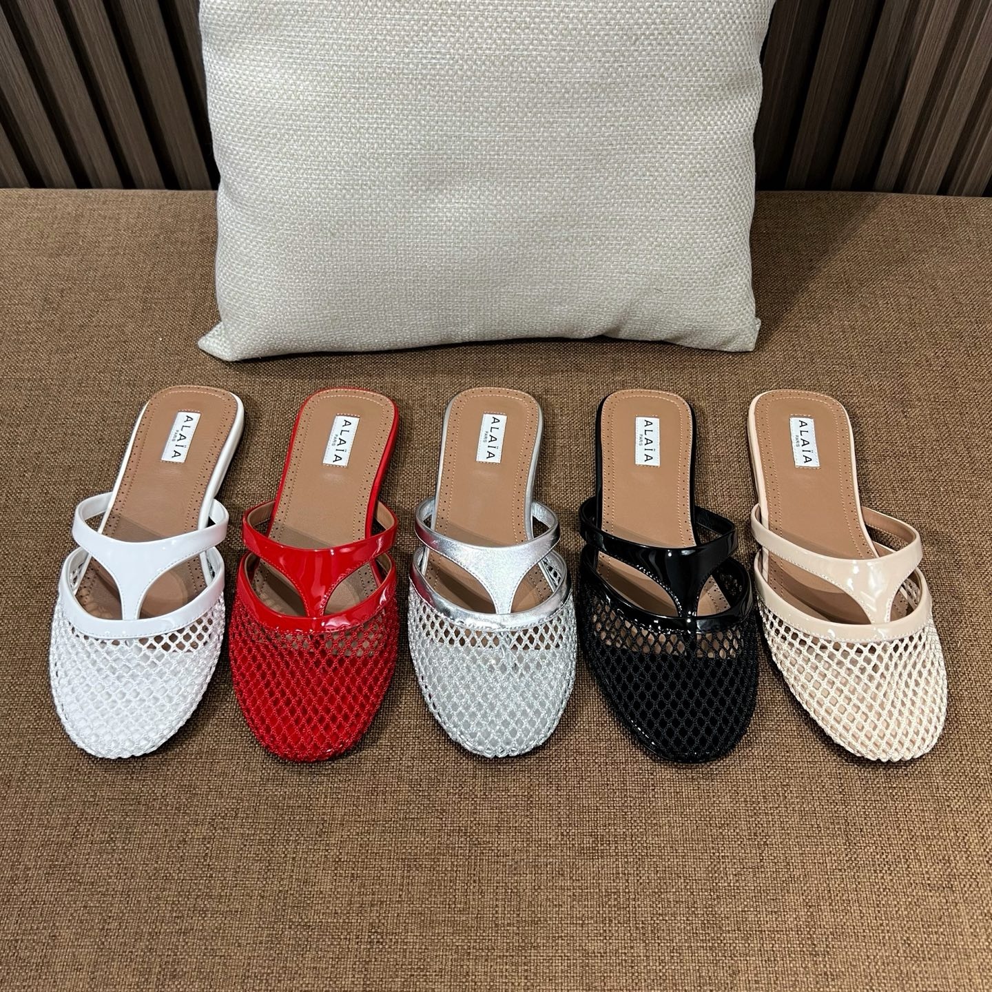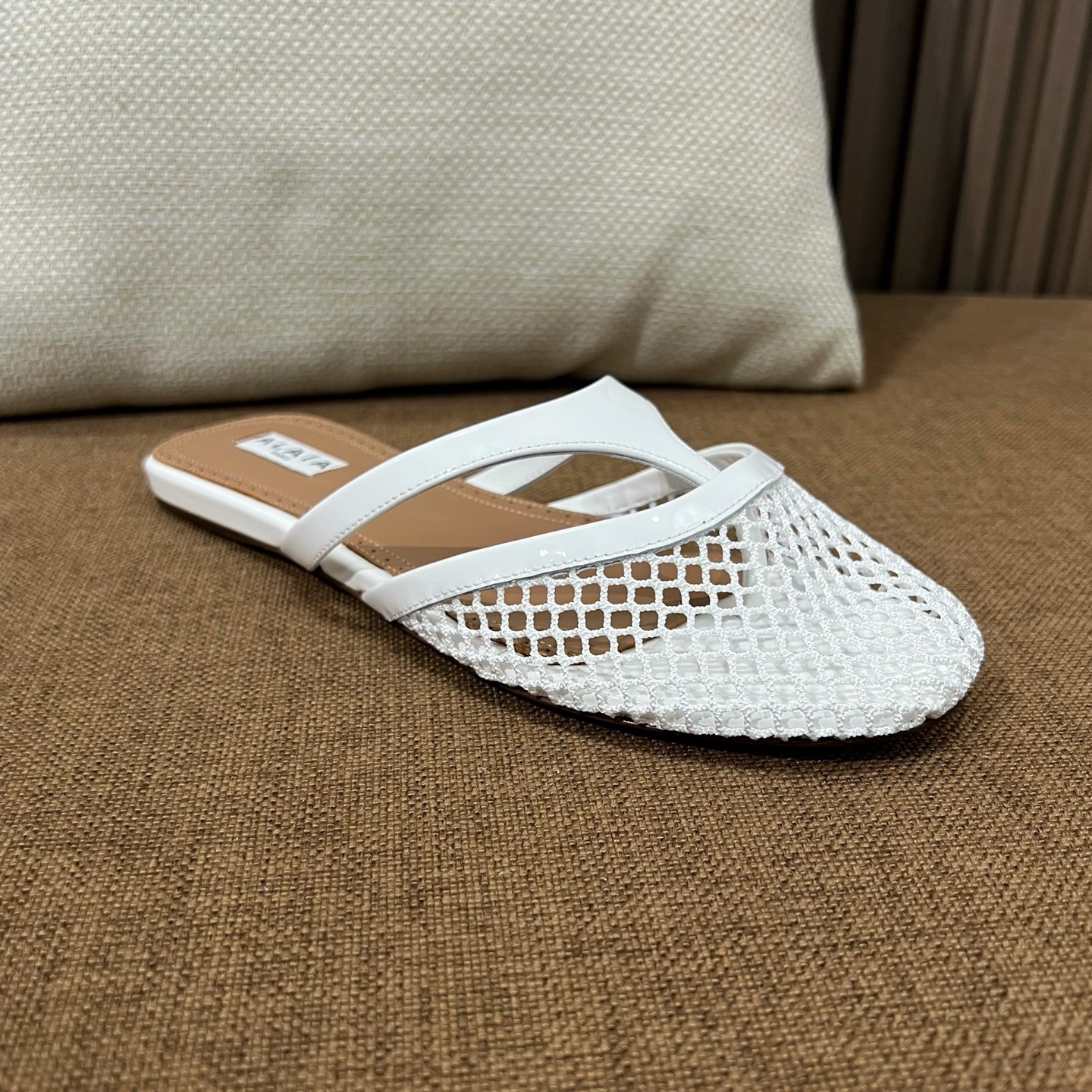 Alaia 2025 신상 펀칭 메쉬 플랫 슬리퍼 심플하고 모던할 뿐만 아니라 누구나 잘 어울림 여자 신발장 필수 아이템 바닥은 맞춤 수입 망사 패치워크로 제작 ZP 커스텀 물감 양가죽으로 편안하고 통기성 있게 이태리 수입 A급 리얼 가죽창으로 미끄럼과 내마모성을 방지