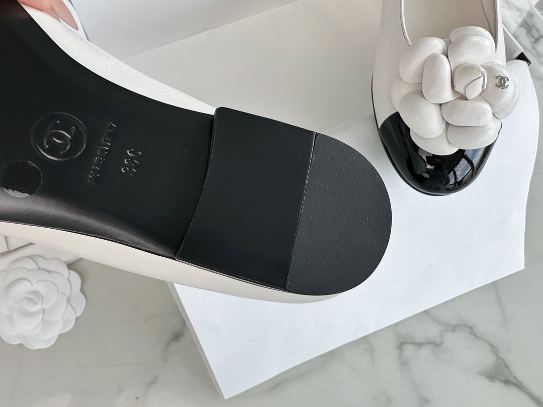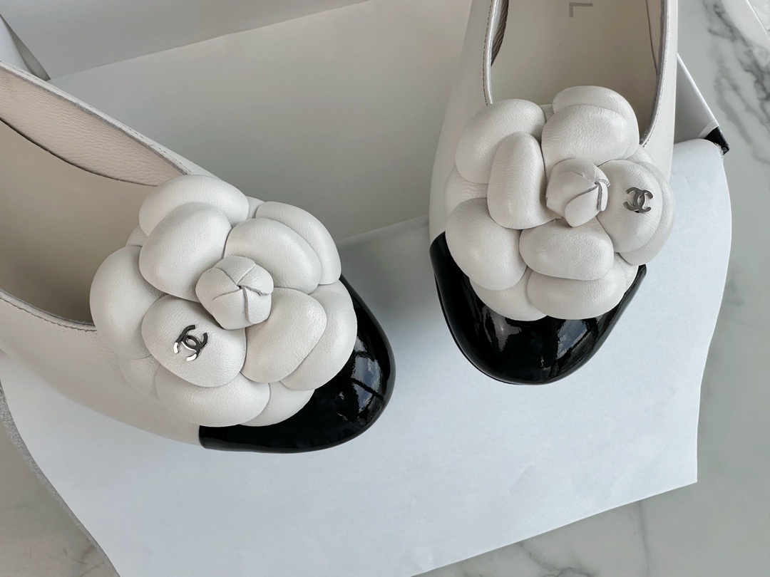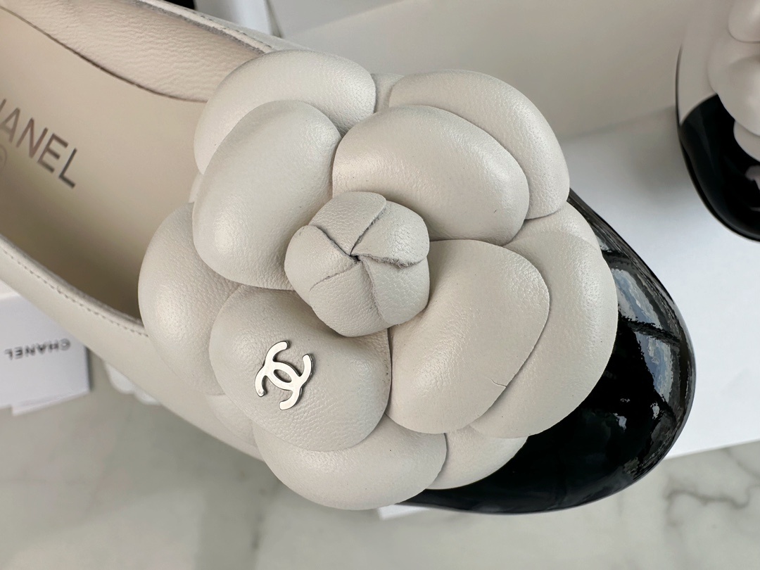 샤넬 24P 바이커 카멜리아 발레슈즈 펄 염소 가죽 콤비 흑색 소가죽 클래식한 배색과 동백의 임팩트 동백 세팅 클리어 스몰 로고 부드럽고 수려한 발끝 부드러움