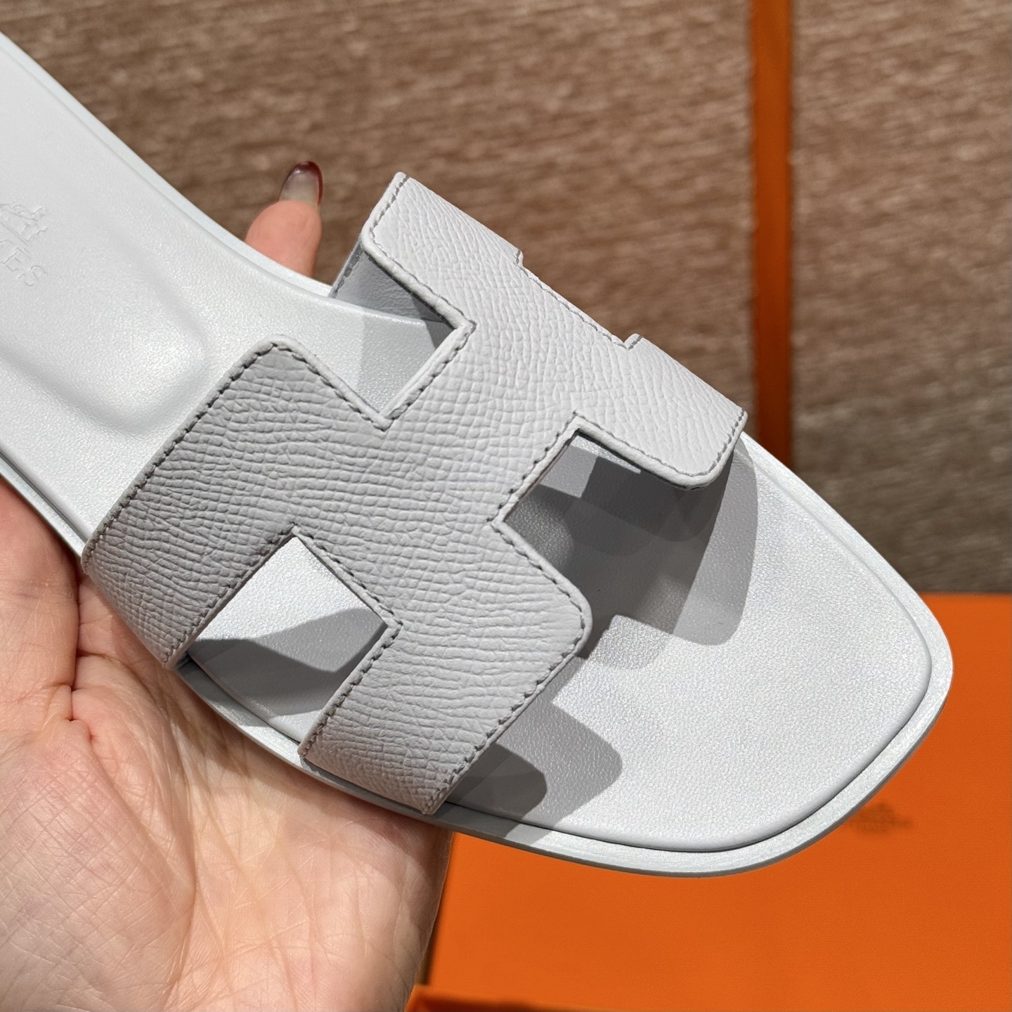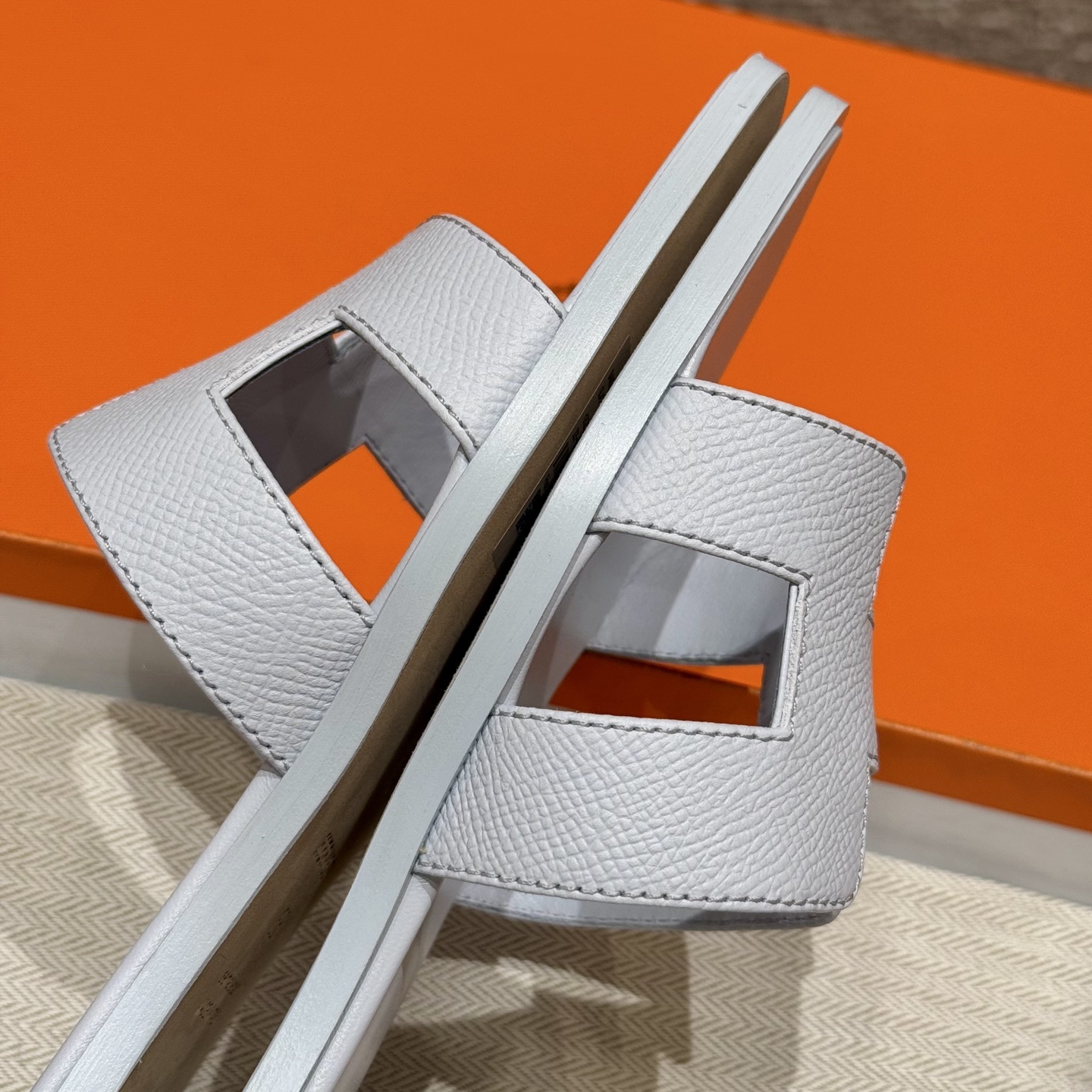 스타일: Oran 슬리퍼 색상/Colour: 아이보리/Blue Chacier 바닥재/Upper material: 손금/엡송가죽 바닥재 / Bottom materials : 진가죽창 / Dermal outsole 반 사이즈 주문 제작 가능 저희 매장 제품은 모두 수작업으로 제작