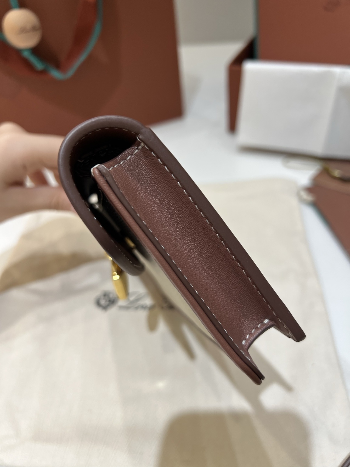 Loropiana Extra pochette 다크브라운 패치워크 아이코닉 Extra 라인에서 나온 엘레강스한 클러치백으로 숄더백과 클러치백으로 모두 휴대할 수 있으며 탈부착이 가능한 숄더끈, 플랩과 마그네틱 클로져 아이코닉한 Loro Piana 로고 걸쇠 외장 백 메탈릭 액세서리로 구성되어 있음 사이즈: 18x10x2.5cm, 어깨끈 높이: 48cm
