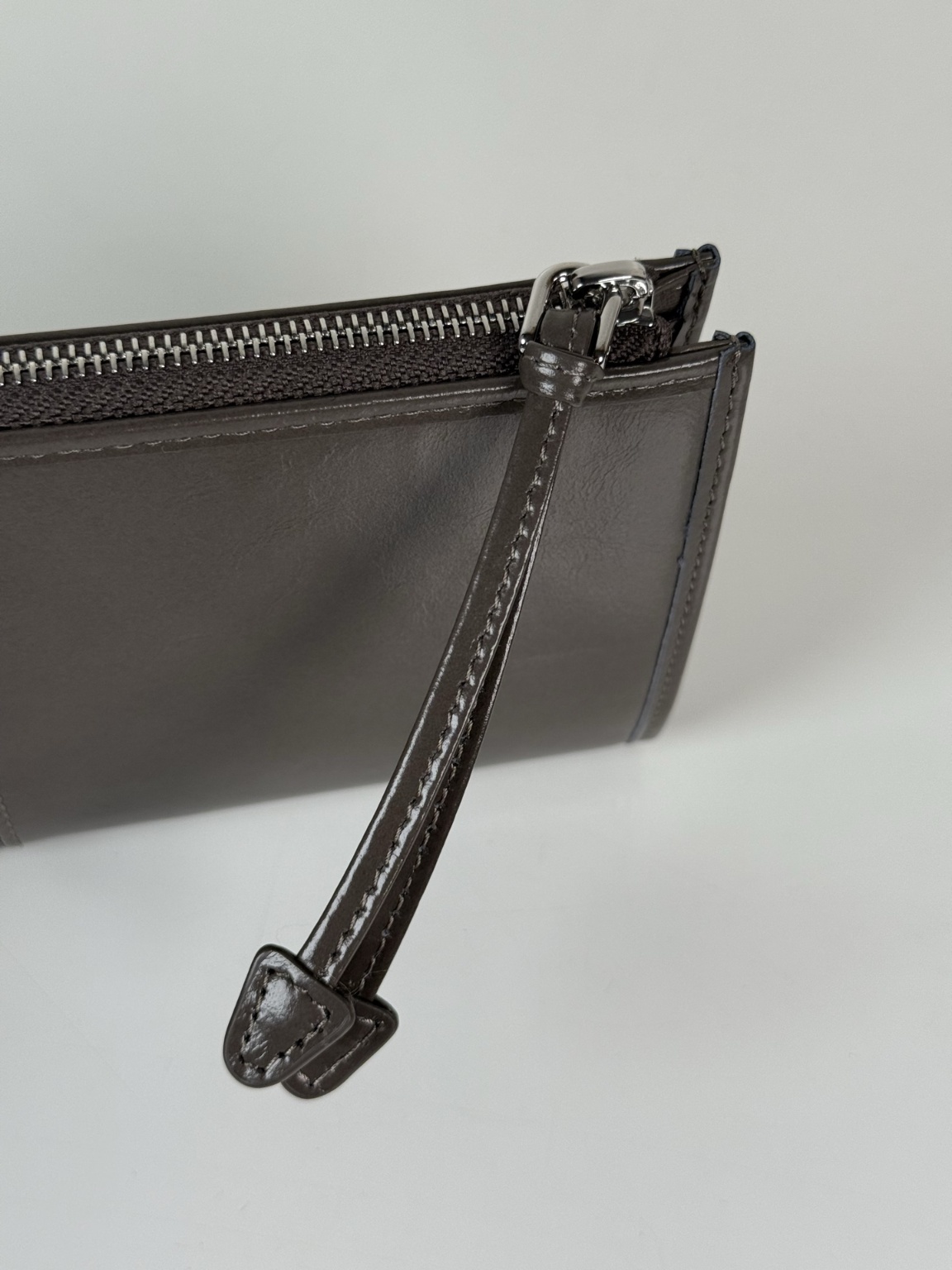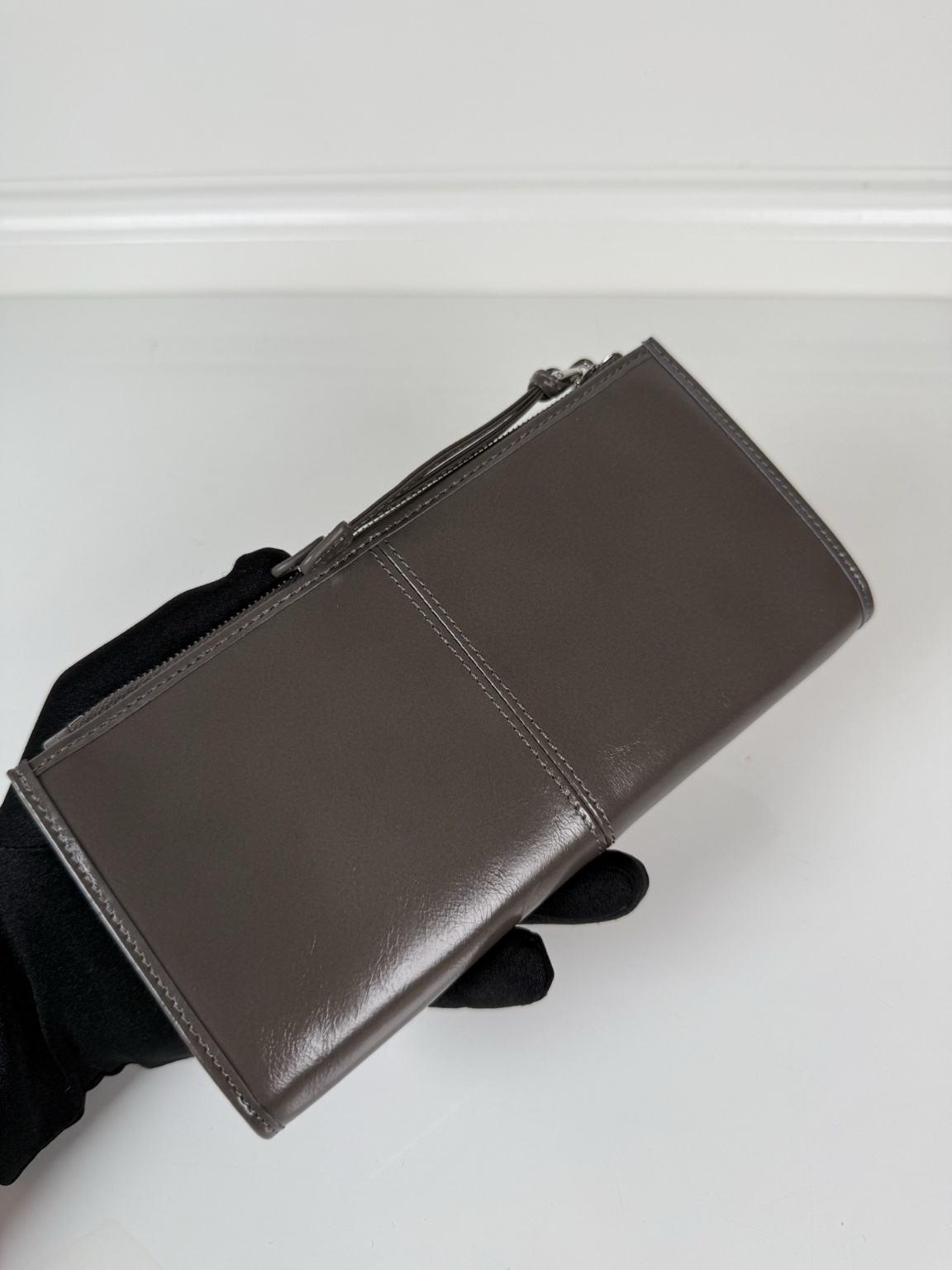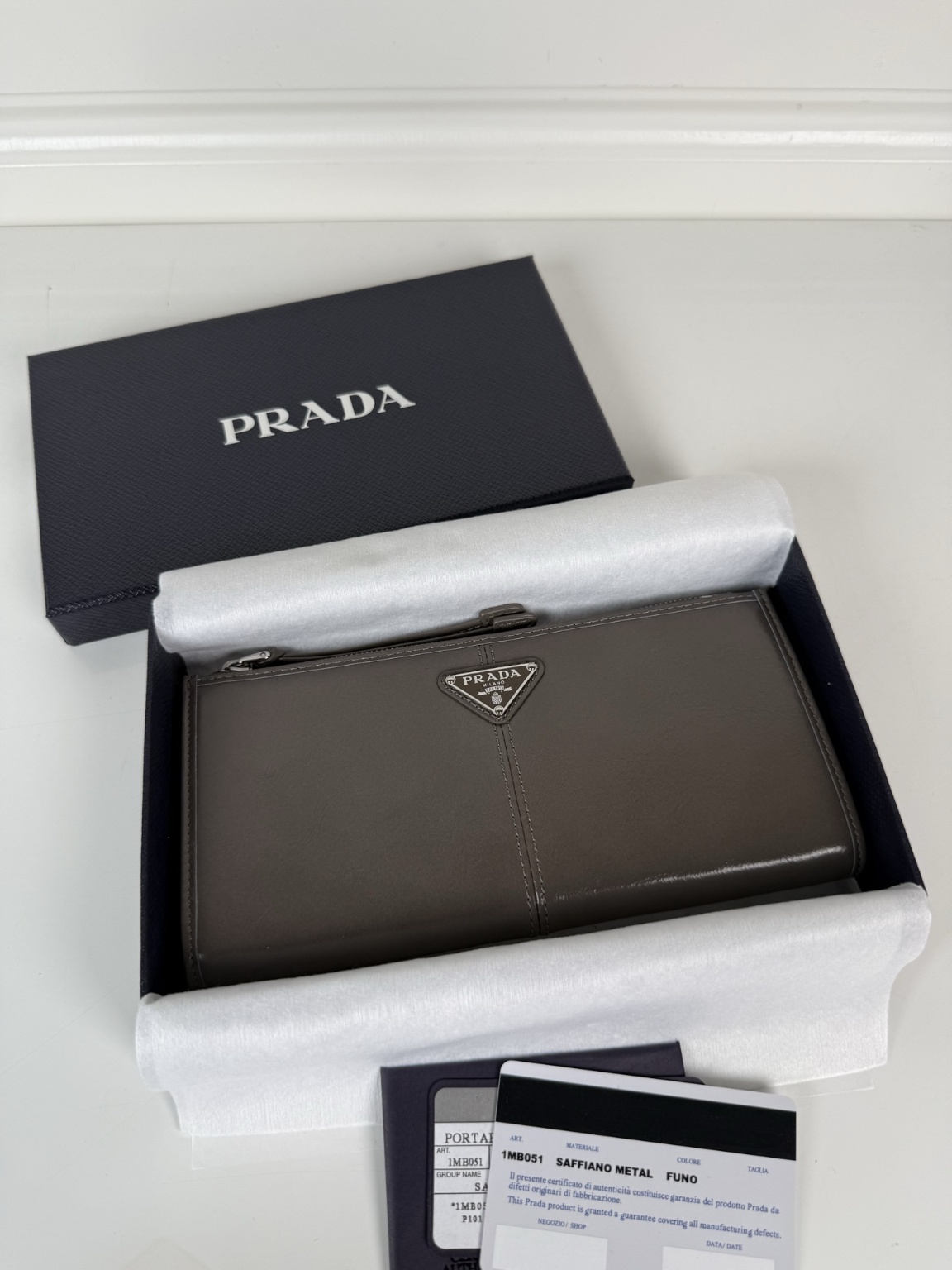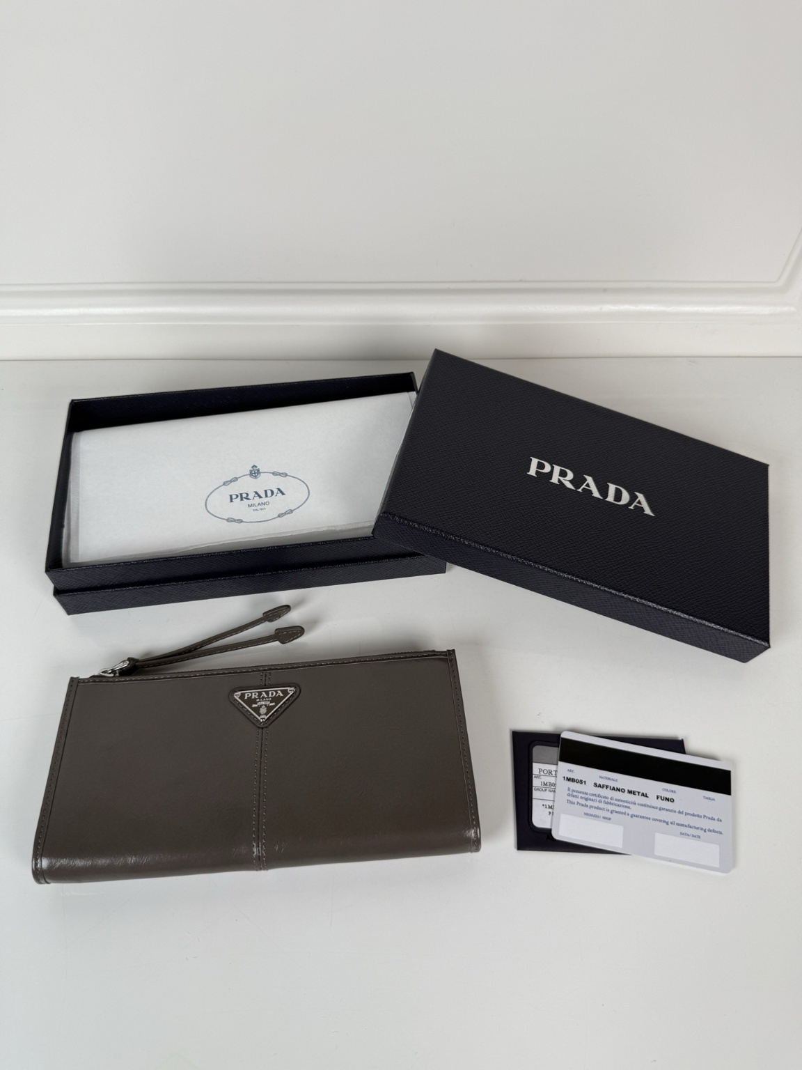 프라다 남녀 공용의 작은 가죽 파우치 심플하고 정교하며 수입 유화 가죽으로 제작 삼각형 금속 로고로 지퍼가 열리고 닫힘 카드 2칸 가죽 라이닝 1칸 사이즈 20 x 10cm