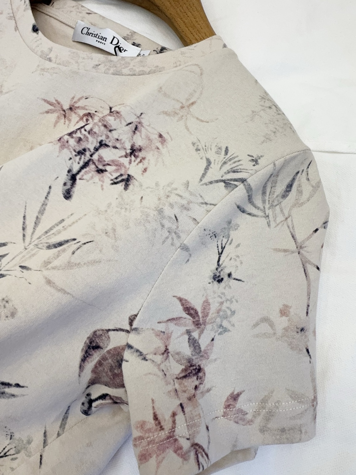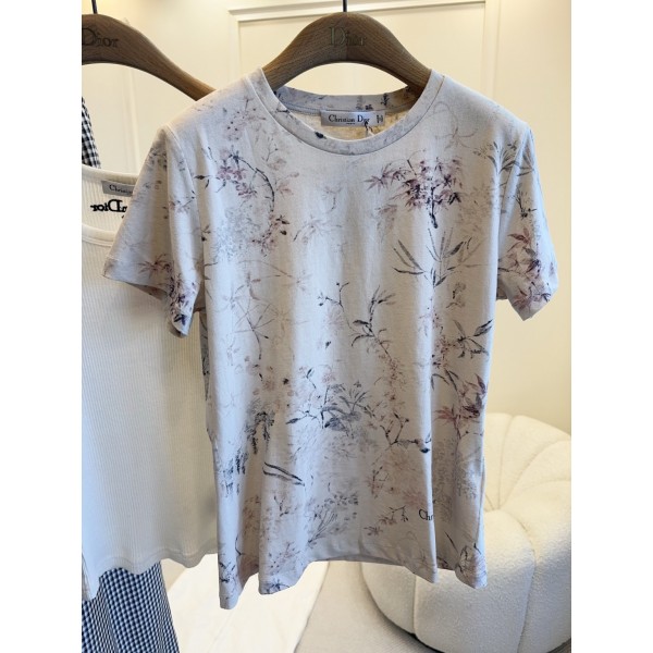Dior 2025 신상 플라워 프린트 티셔츠 맞춤 코튼과 린넨 혼방 저지 원단으로 촉감이 부드럽고 촉촉하며 통풍이 잘 됨 전폭 수입 프린트기로 플라워 프린트를 만들고 스모크 계열의 프린트로 은은하고 고급스러운 컬러 편안한 핏의 재단, 반바지나 스커트를 매치해도 세련됨