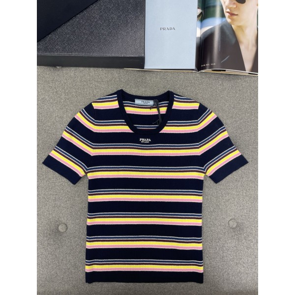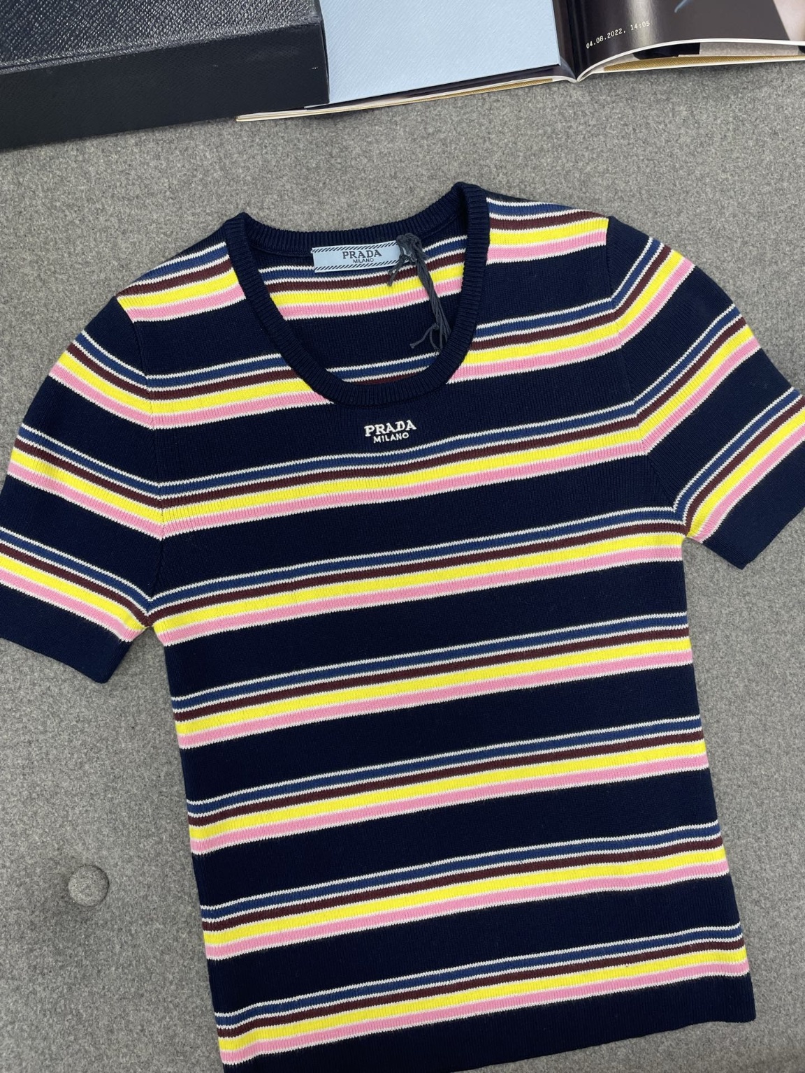 프라다 여성 면 라운드 반팔 니트 원료는 40수 빗소면으로 짧은 섬유를 빗어내고 면의 불순물을 제거하여 빗소된 면사가 더욱 매끄럽고 나온 원단은 표면이 매끄럽고 매듭이 없어 매끄러운 실을 만들어 면의 질기고 부드럽고 단단함 통기성이 좋고 기계세탁시 줄어들지 않고 니들링 공법으로 작은 로고 자수를 받아 자연스럽게 딱딱하지 않으며 중난점은 가는 줄무늬의 봉합에 신경을 써서 하나하나 맞춰야 하고 오색 실의 색상마다 염색과 정염이 필요하여 손실이 매우 크기 때문에 출고가 이렇게 늦어짐
