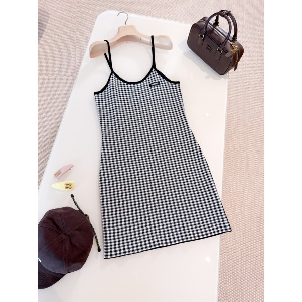 MIUMIU 25S 엠보스판 체크 나시 원피스 비스코스 니트 원피스는 몸에 딱 맞는 타이트한 컷팅으로 유니크한 체크 패턴이 돋보이며 캐주얼한 여름 이미지를 불러일으켜 옷장의 전형적인 실험적인 스타일을 연출함