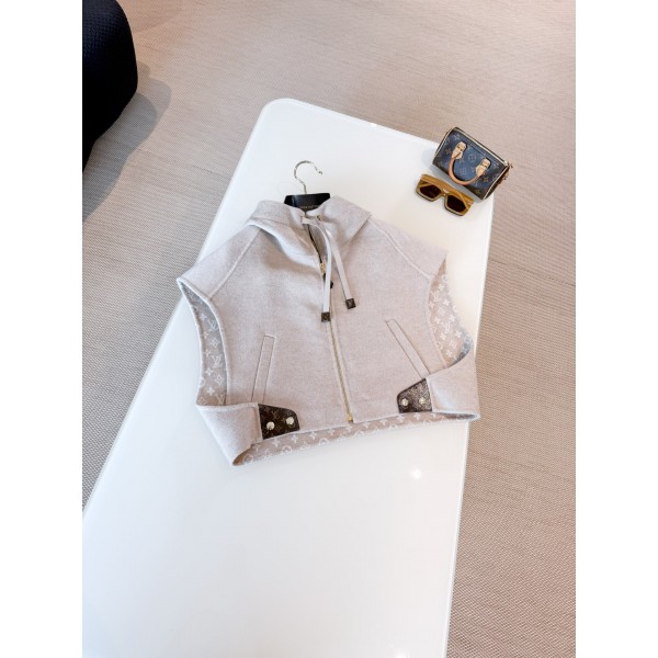 LV 25S 오트밀 후드 반나시 점퍼 베스트 가벼운 울과 캐시미어, 실크 혼방 소재로 제작된 오픈 소매 재킷 양면 후드 스타일로 시즌만의 차별화된 베이지 컬러로 스타일리시한 룩을 연출