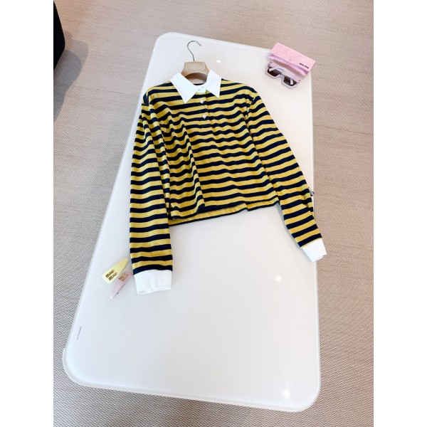 MIUMIU 25S 블랙옐로우 스트라이프 배색 숏터틀넥 폴로 터틀넥 디자인에 나른하고 깔끔한 느낌 짧은 핏의 비율 블랙 옐로우 스트라이프가 돋보이는 클래식하면서도 톡톡 튀는 입체 와펜 로고 디테일로 부담 없이 스타일리쉬하게 입으실 수 있음