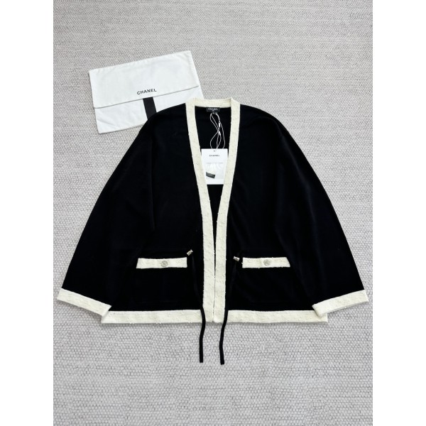 샤넬 25A 레이온 카디건, 히트상품 바디 블랙 원단에 120D 레이온 사용으로 광택이 뛰어나고 떨어지는 느낌이 강하며 레이온 원단이 피부에 닿았을 때 땀이나 수분을 빠르게 흡수하고 증발을 통해 열을 빼앗아 흡습감을 일으켜 순간적인 서늘함을 더해줌 공법은 18핀 일본 스마기 라이카 짜임법 베이지색 부분 원사는 100% 특수 울 입자 원사로 독일 기계 7.2 기계로 짜여 있음 옷 전체가 특히 차갑고 시원한 느낌 가득